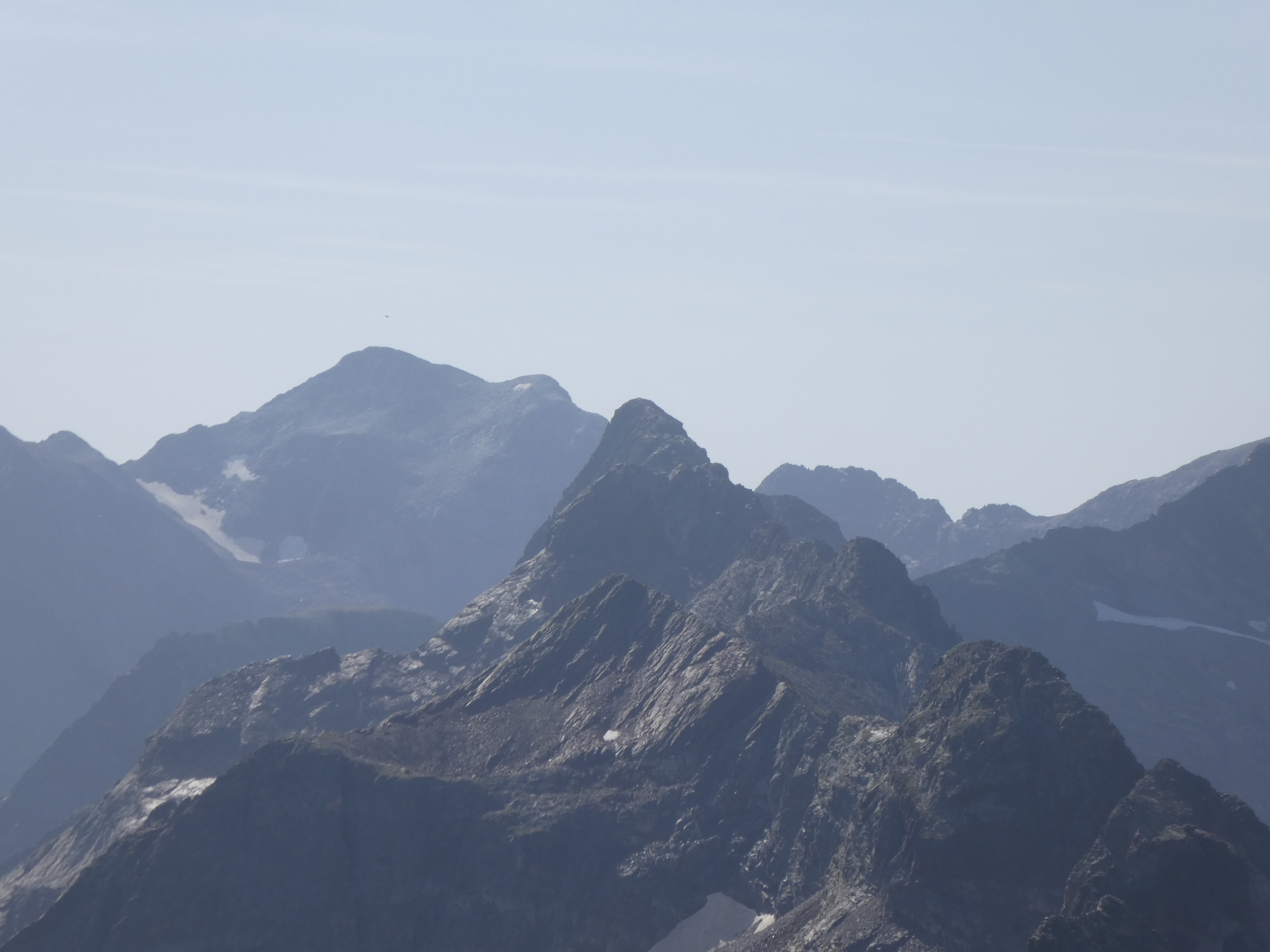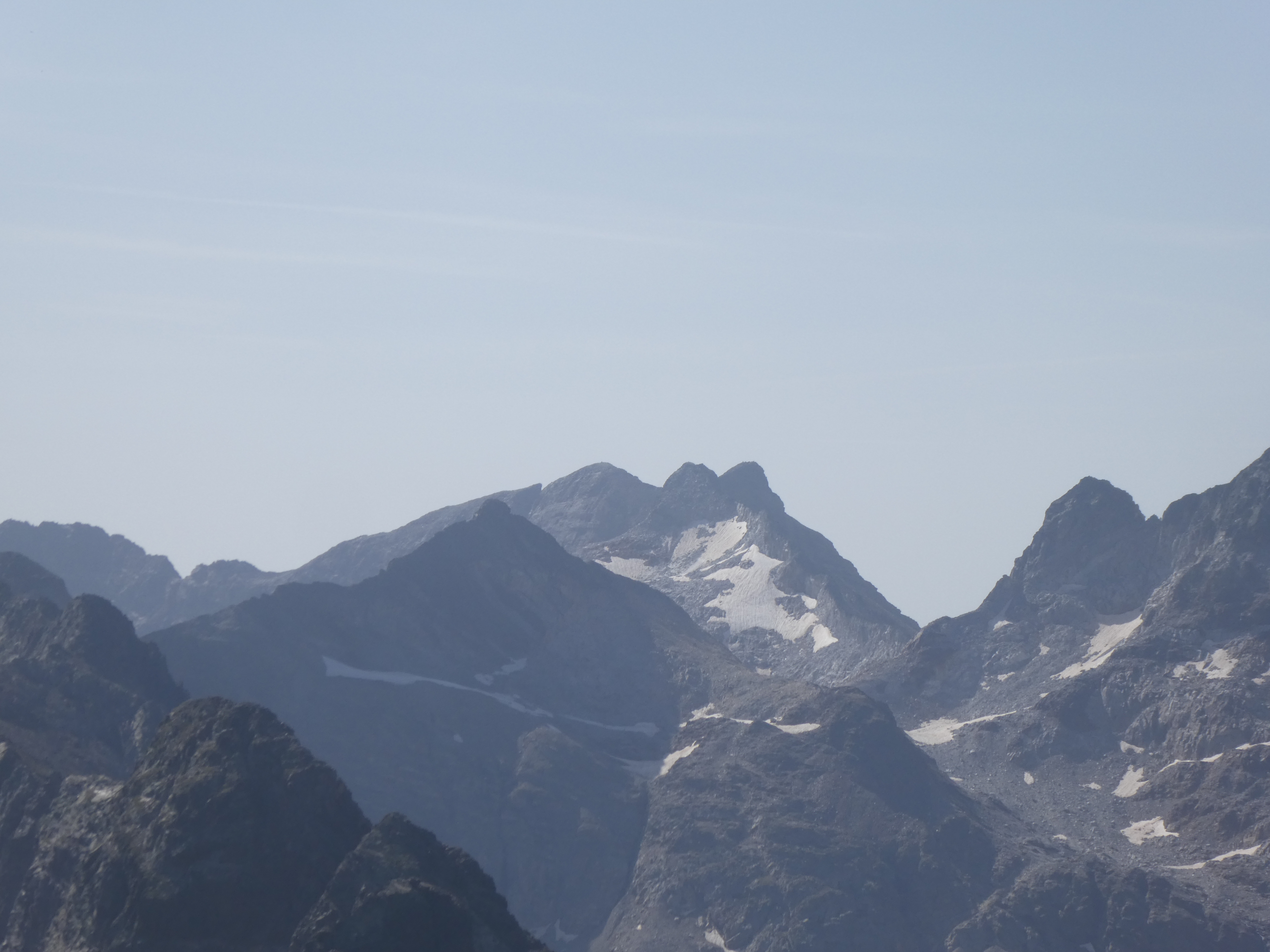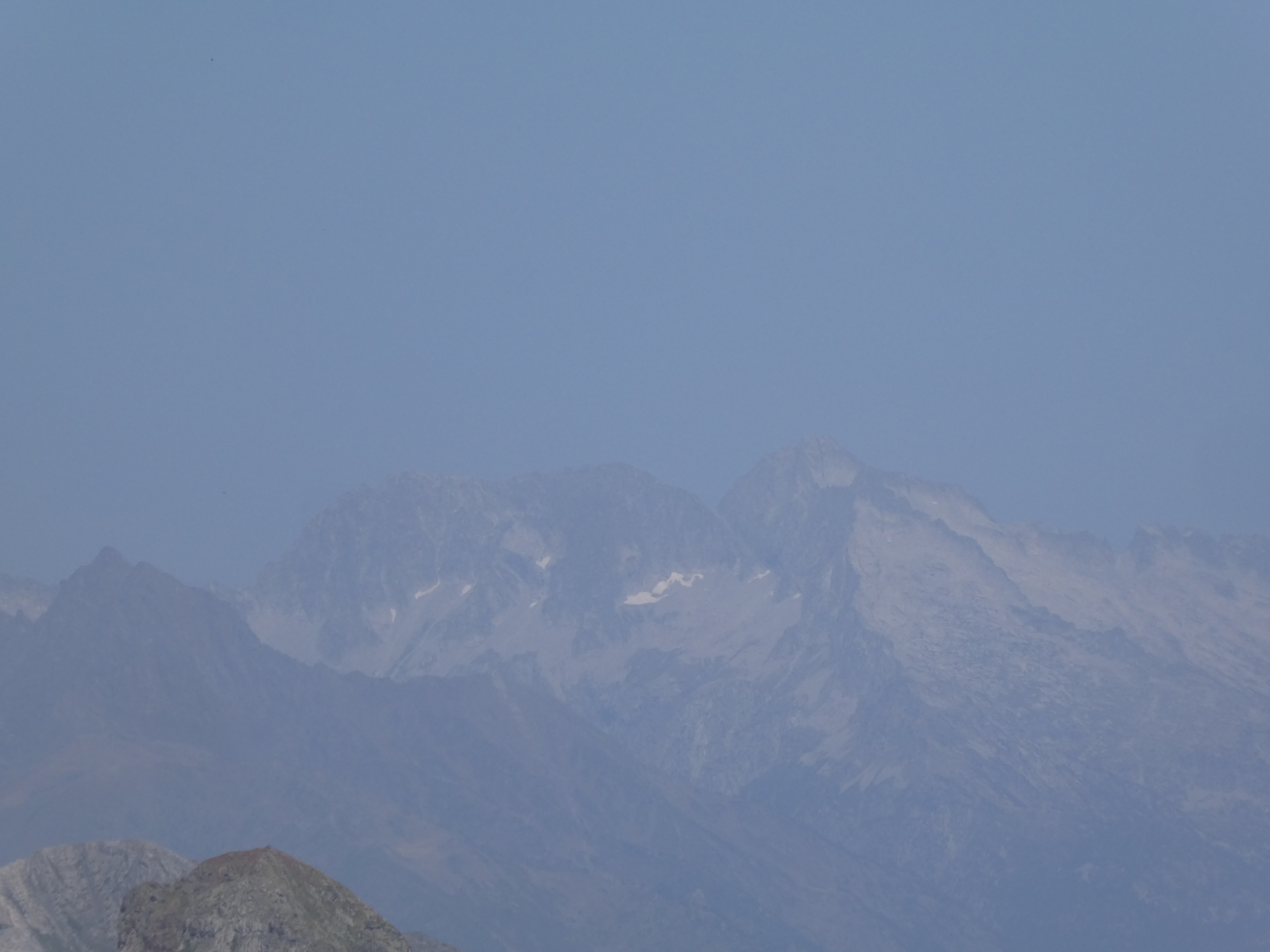Zoom sur le Pic Méchant (2944 m) au centre-gauche et le Pic de Bugatet (2877 m) à droite