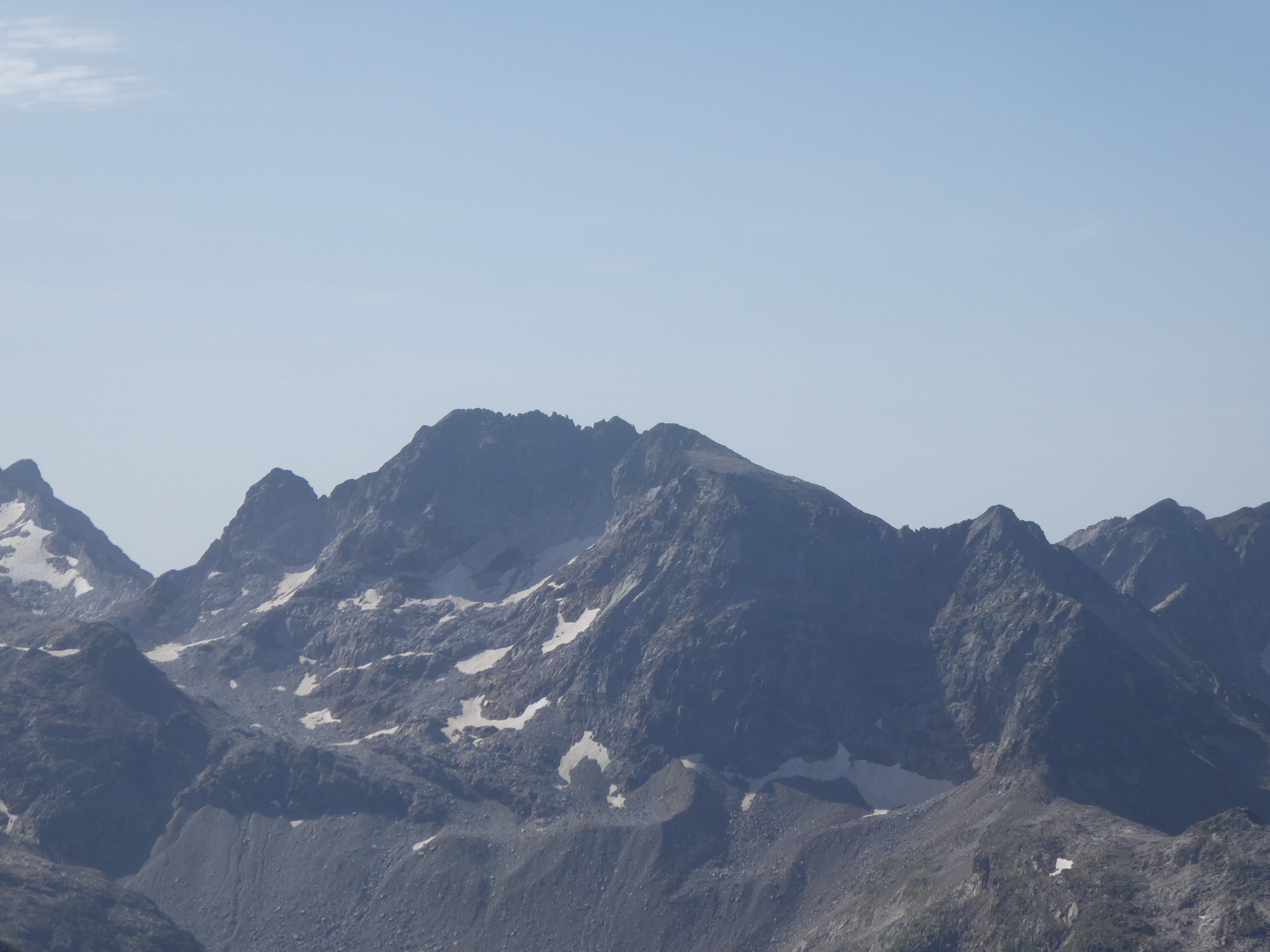 Zoom sur le Pic de Campbieil (3173 m) au centre, et le Pic Badet (3160 m) et le Pic Long (3192 m) au centre-droit
