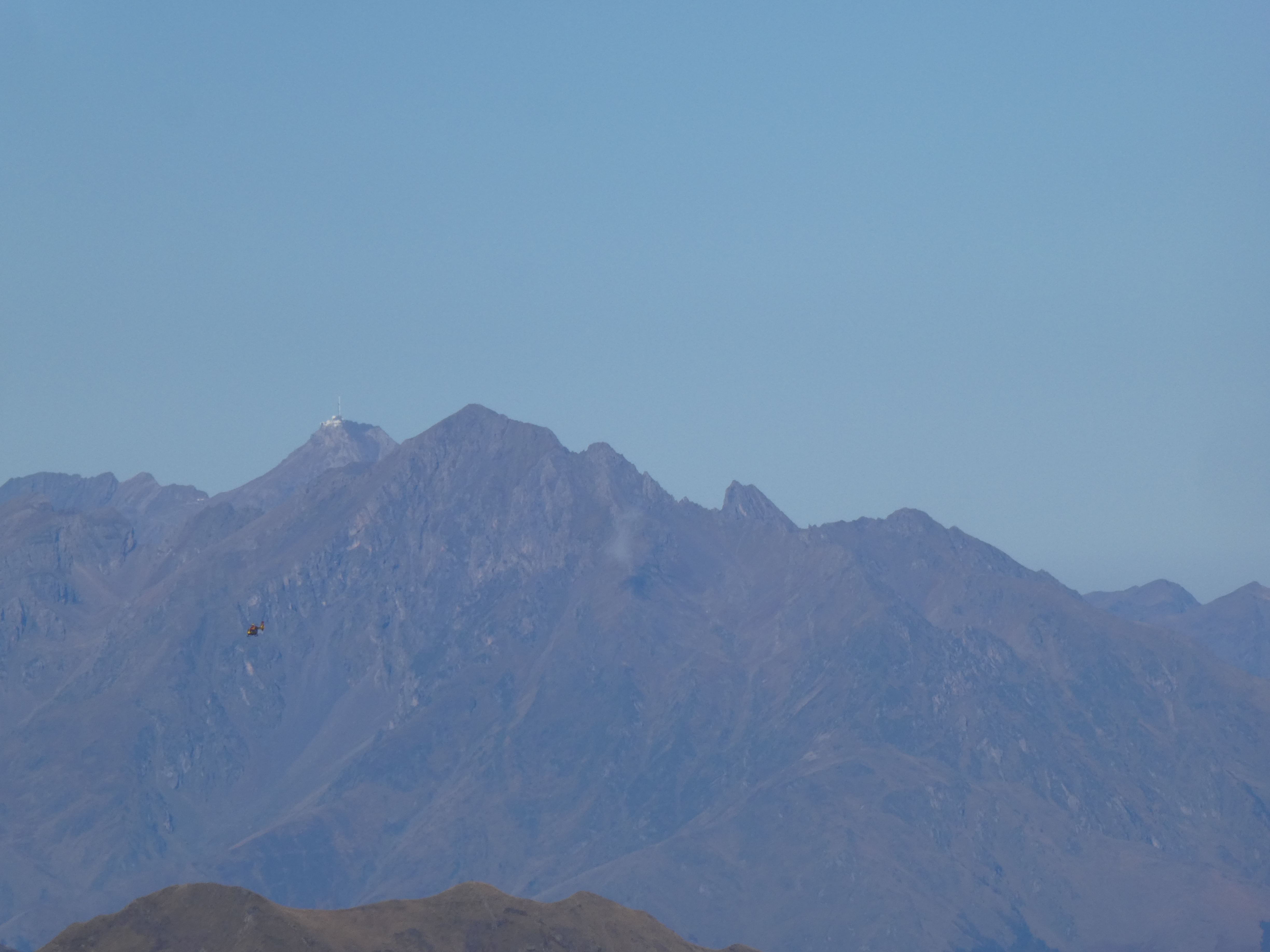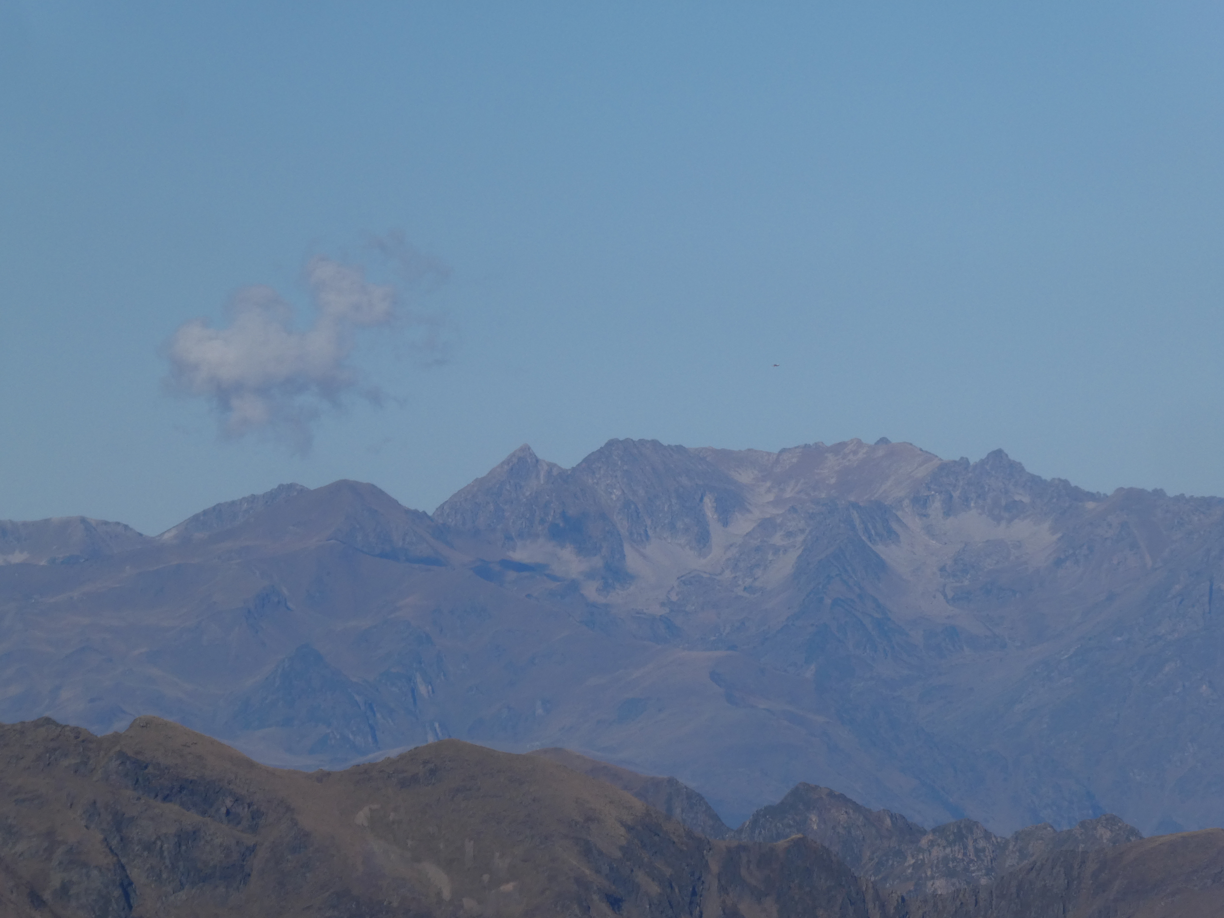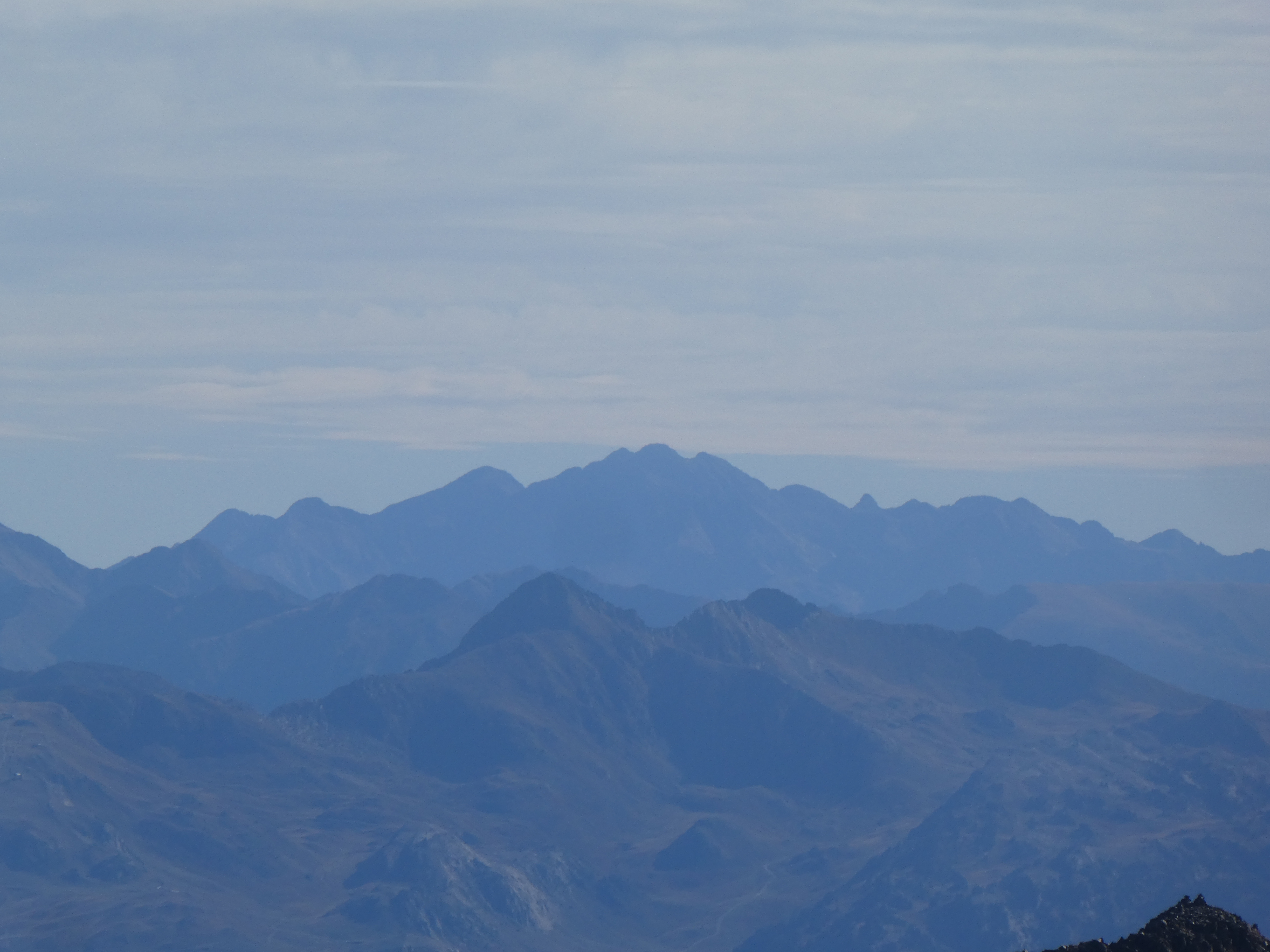 Zoom sur le Pic du Midi de Bigorre (2877 m) et l'Arbizon (2831 m) à gauche, et le Pic du Bassia (2557 m) au centre-droit