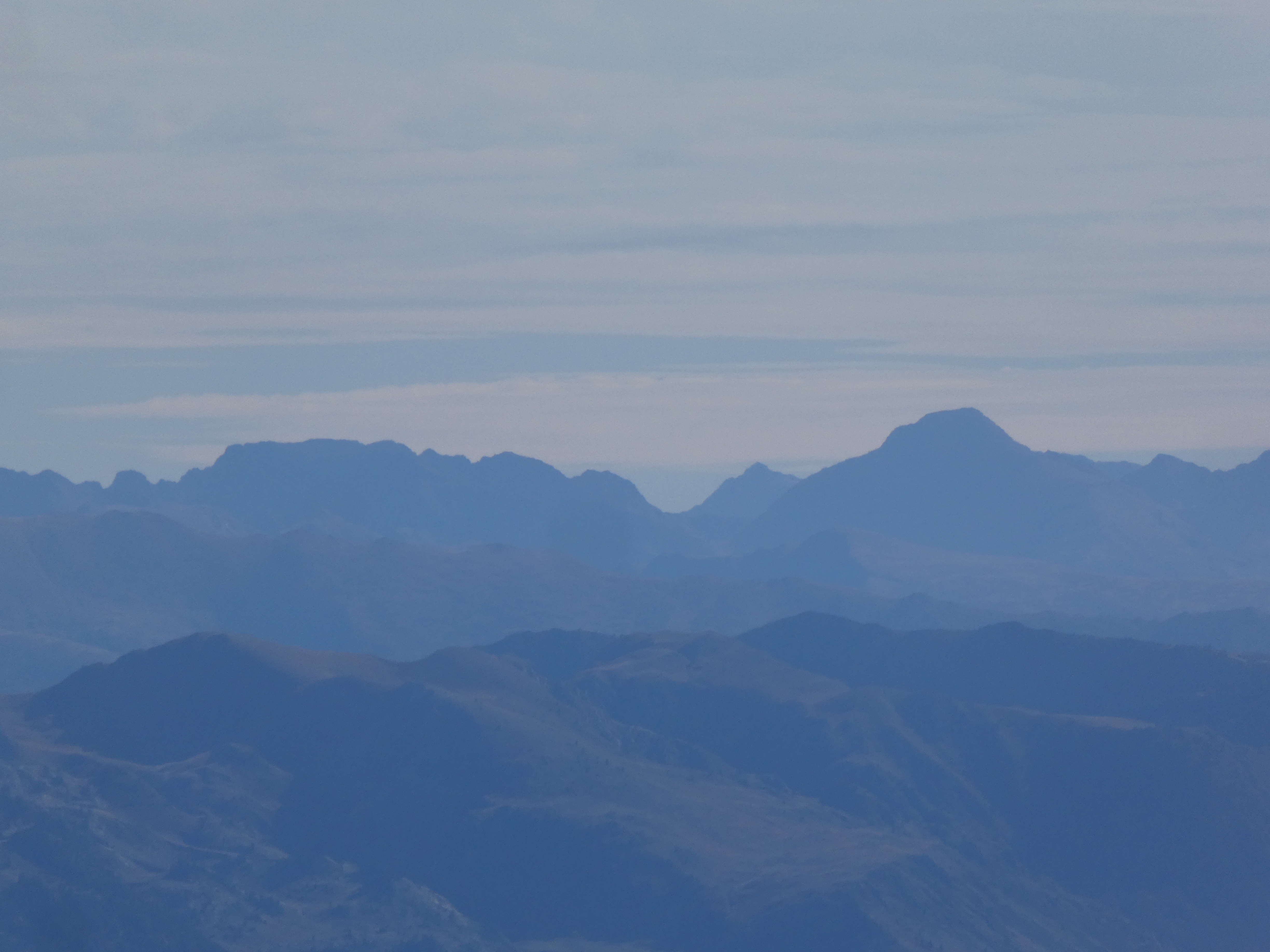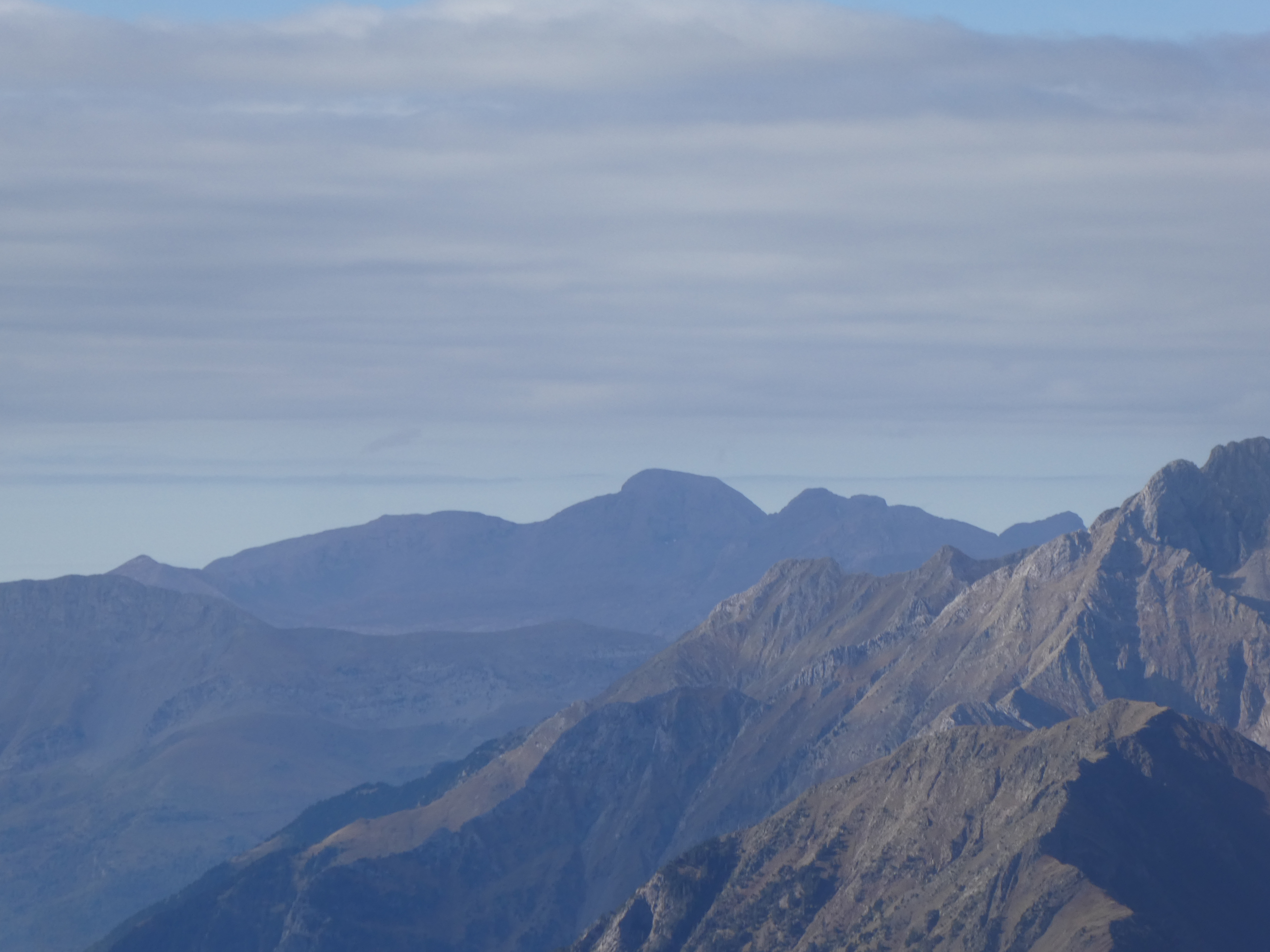 Zoom sur le Pic de Douly (1635 m) à gauche, le Pic de Pouy Usclat (1755 m) au centre et le Mont Las (1729 m) à droite