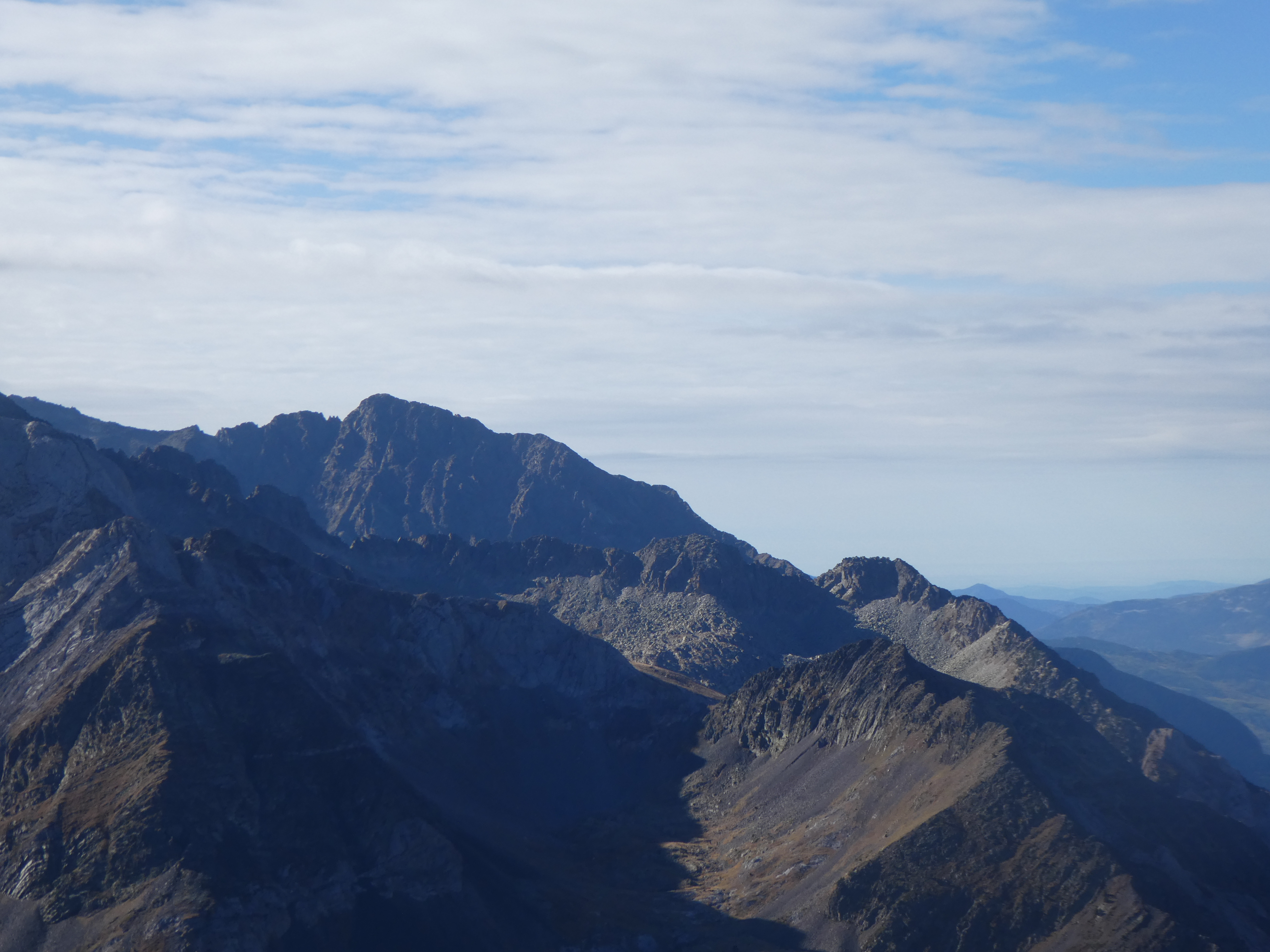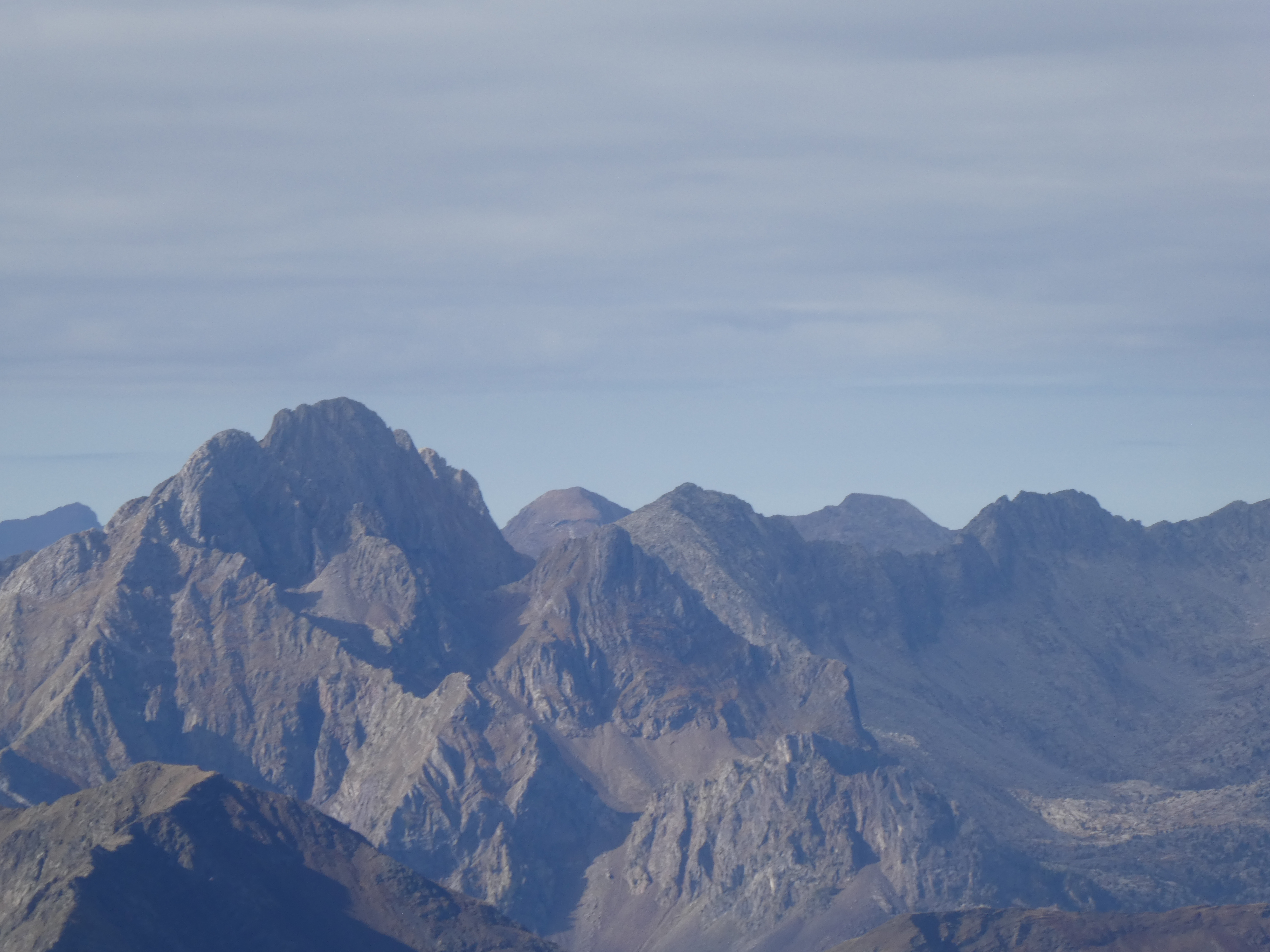 Zoom sur la Tuca des Corbets (2901 m) au centre-gauche et le Pico Gran Eriste (3056 m) au centre-droit