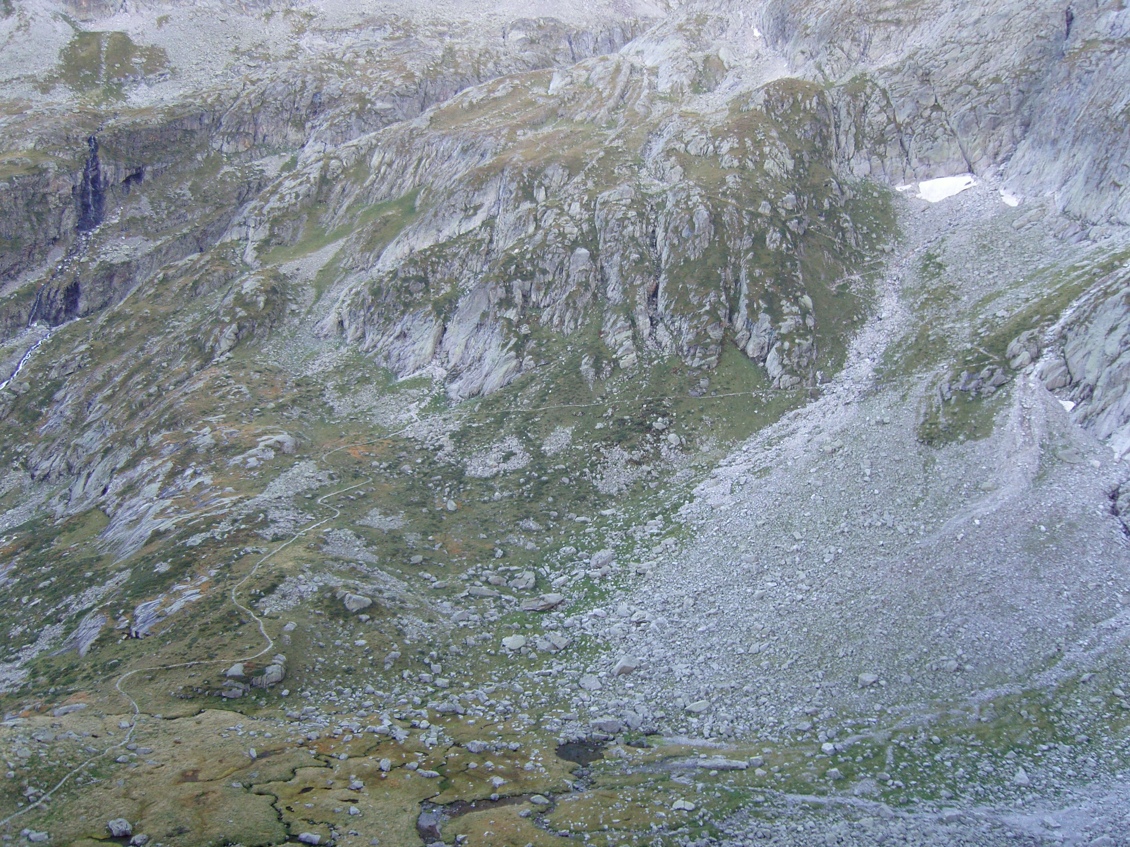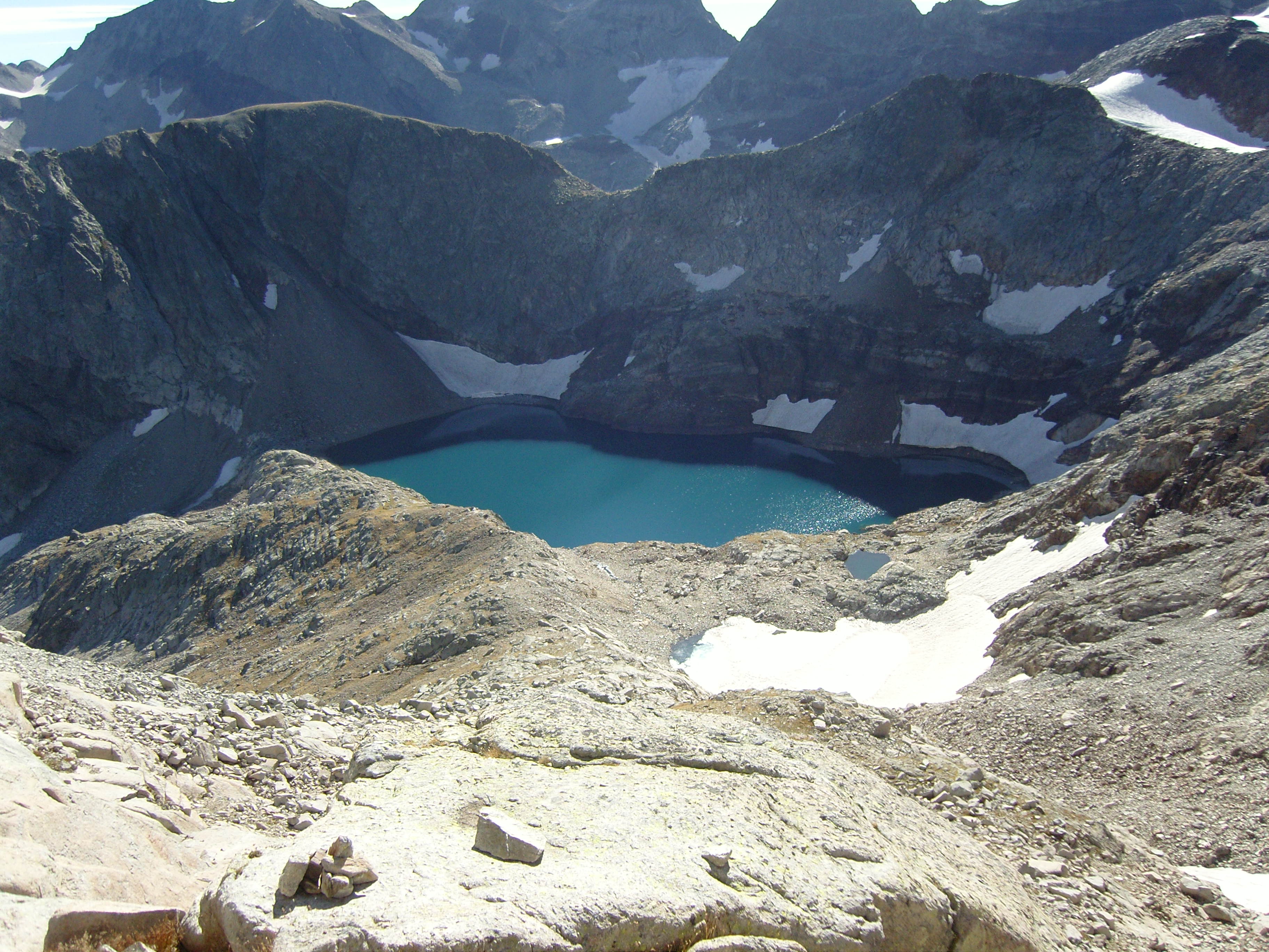 A la base de la deuxième cheminée, continuer à descendre en visant le Lac glacé du Port d'Oô puis tourner à gauche pour démarrer la descente à travers les éboulis direction Lac Saussat