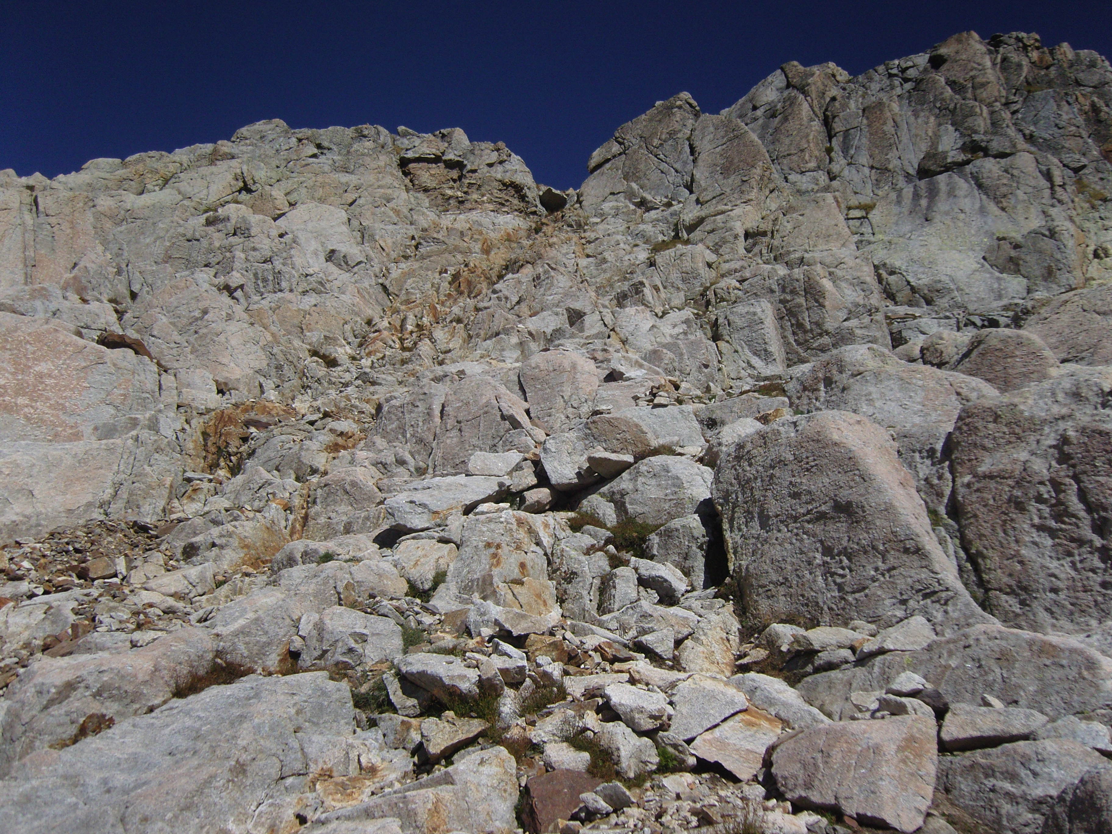 Première difficulté technique de la randonnée : grimper cette cheminée haute d'une cinquantaine de mètres (bien visible avec sa large trace marron sur toute sa longueur) sans danger en prenant son temps (pas de notion d'escalade requise) plutôt sur son côté gauche direction Pic des Spijeoles