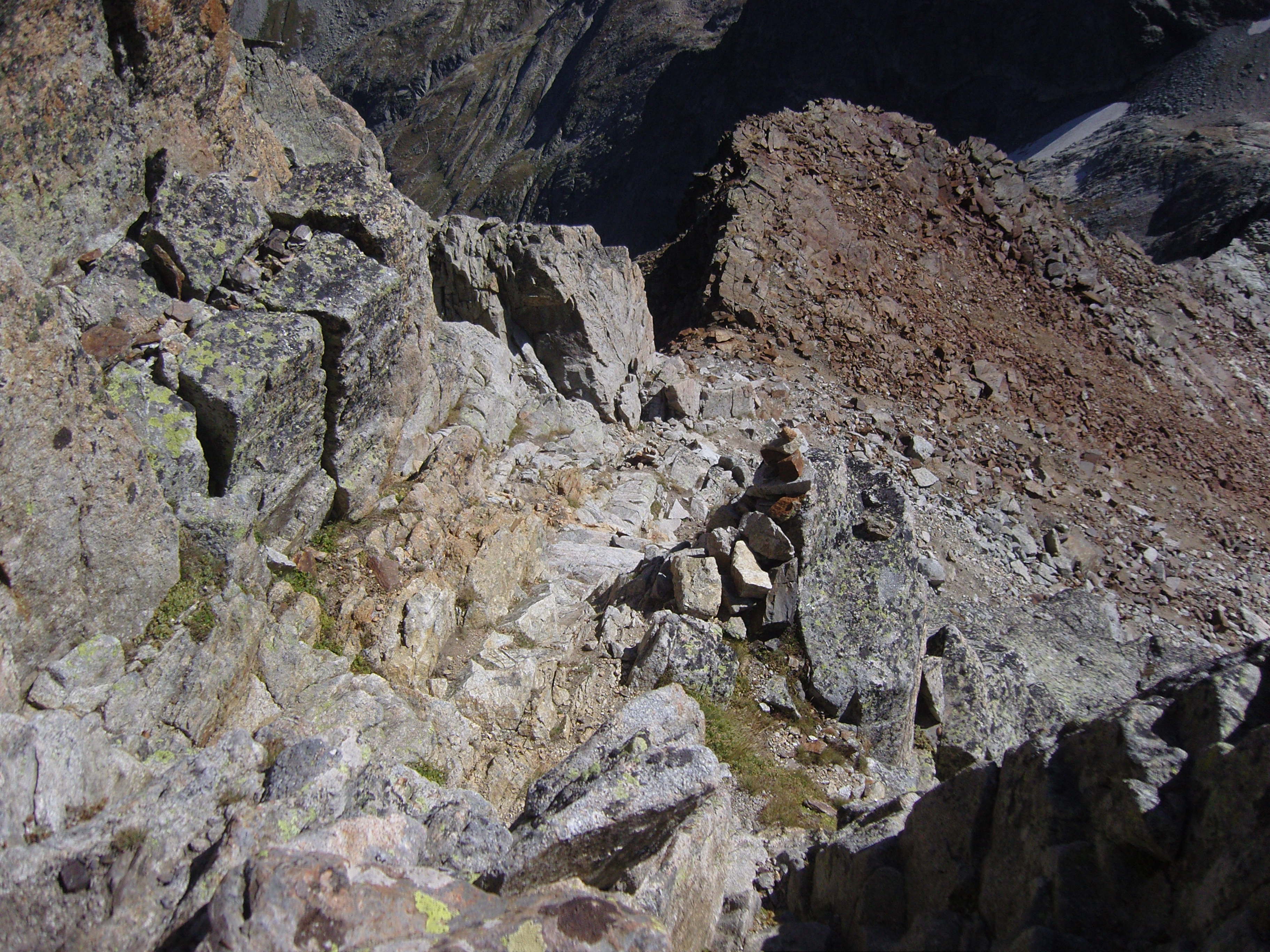 Au sommet de la cheminée, ne pas essayer d'escalader ce rocher trop dangereux : redescendre de 2 ou 3 mètres et quitter le couloir de la cheminée sur la gauche (petit cairn) pour contourner cette difficulté direction Pic des Spijeoles