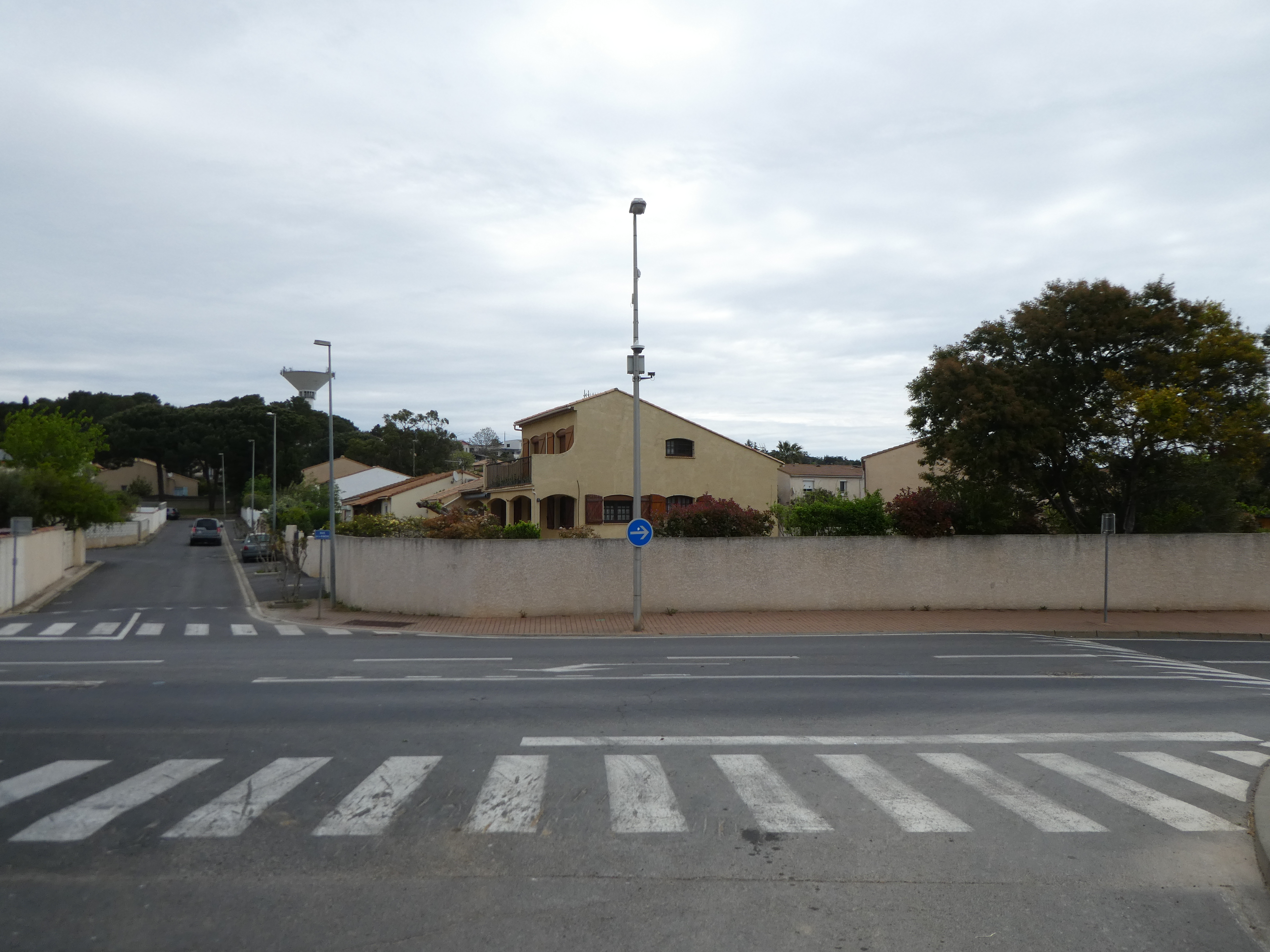 A cette intersection avec un pont enjambant le Canal du Midi marqué par la présence d'un panneau directionnel (950 mètres après le précédent croisement mentionné), suivre la route partant tout droit et empruntant ce pont direction Portiragnes - Mairie, aucun balisage dorénavant