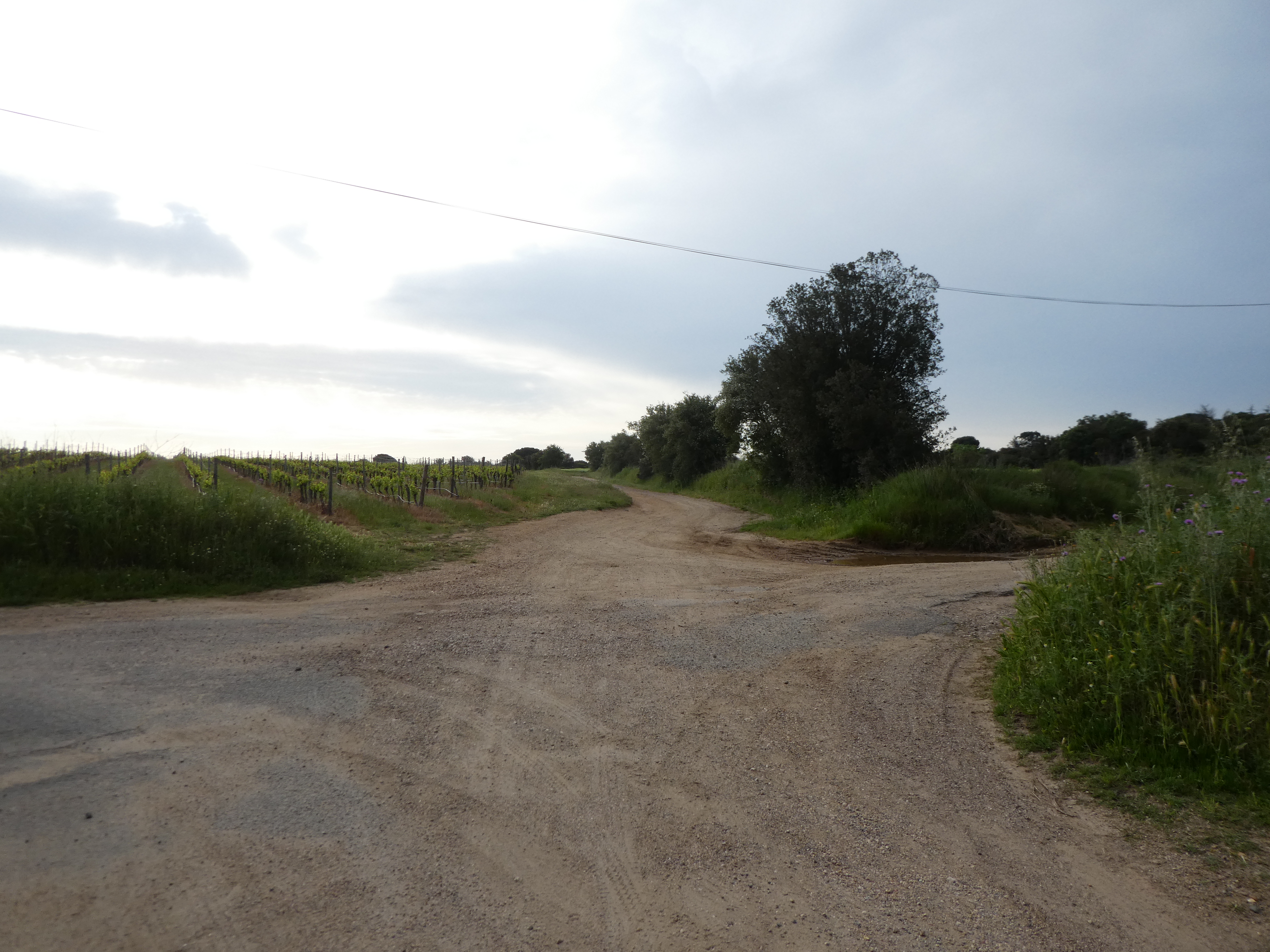 A ce croisement situé au niveau du Domaine de Médeilhan (750 mètres après la précédente intersection), suivre le chemin partant sur la gauche et traversant le domaine direction Ouvrages du Libron