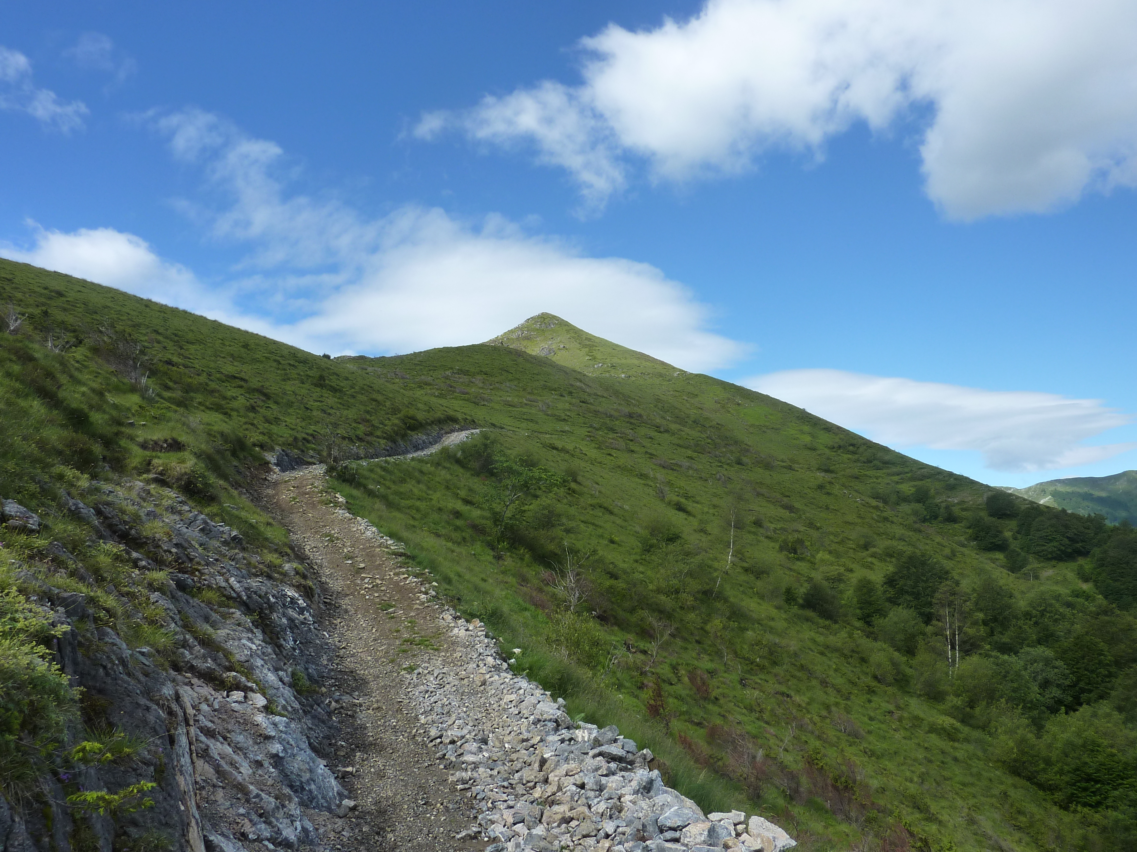 Le chemin va contourner le pic par le Sud-Est avant de passer près d'une cabane (par ailleurs, il est également possible de grimper au sommet directement par la crête de droite avec des pentes beaucoup plus raides !)
