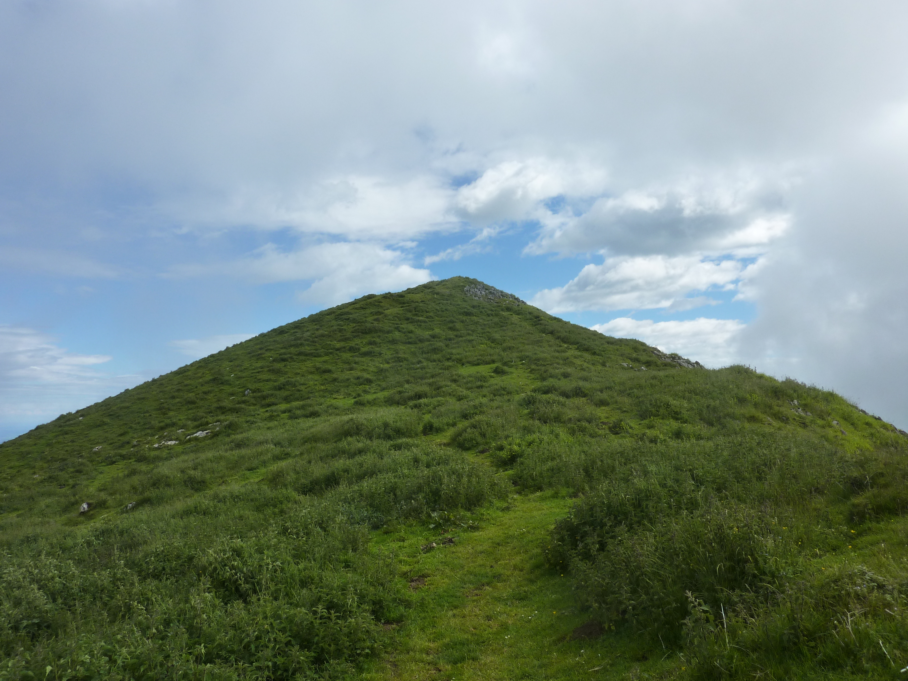 - Montée finale à vue sur pentes mêlant herbe et rochers : attention à ne pas glisser !