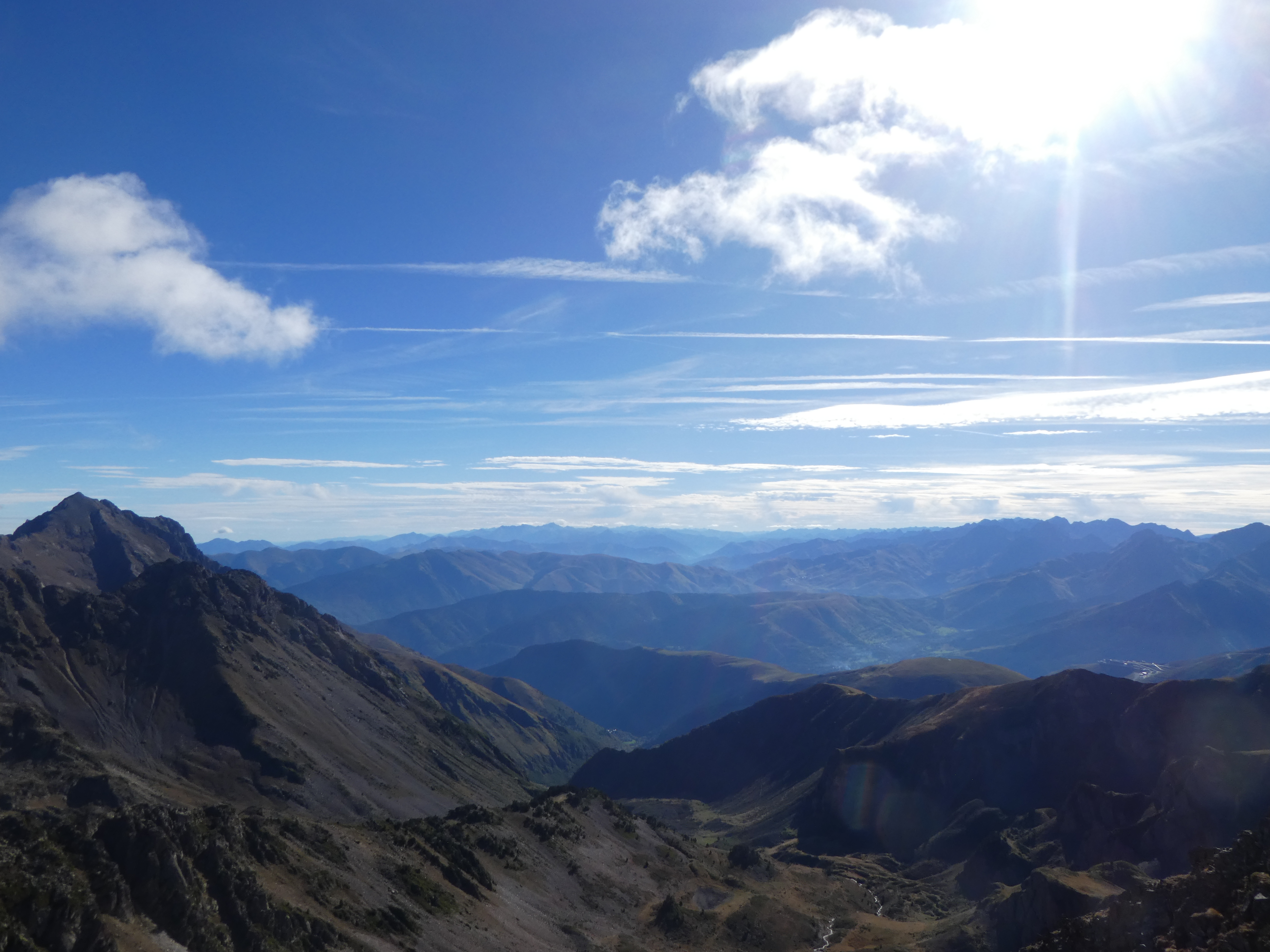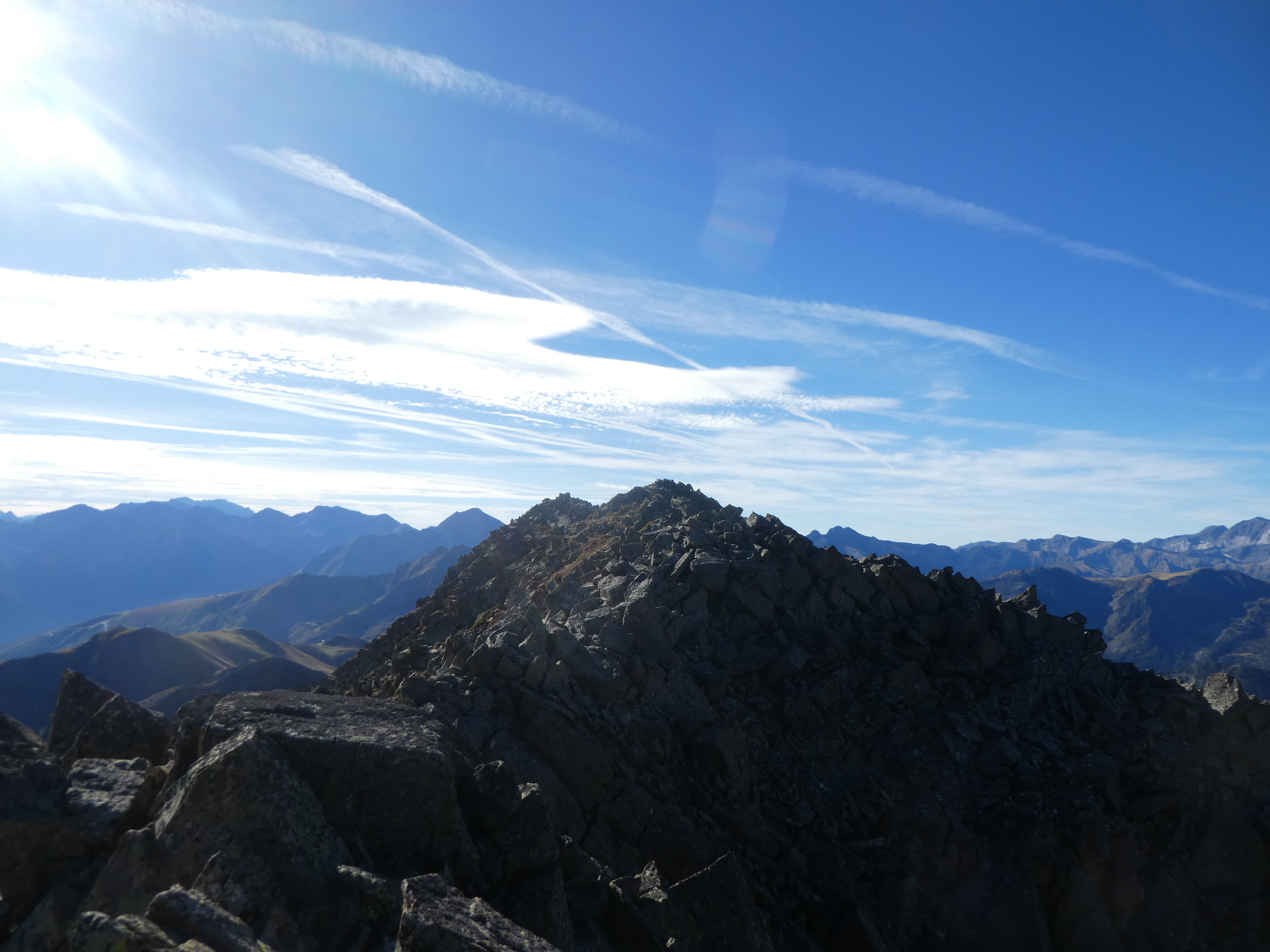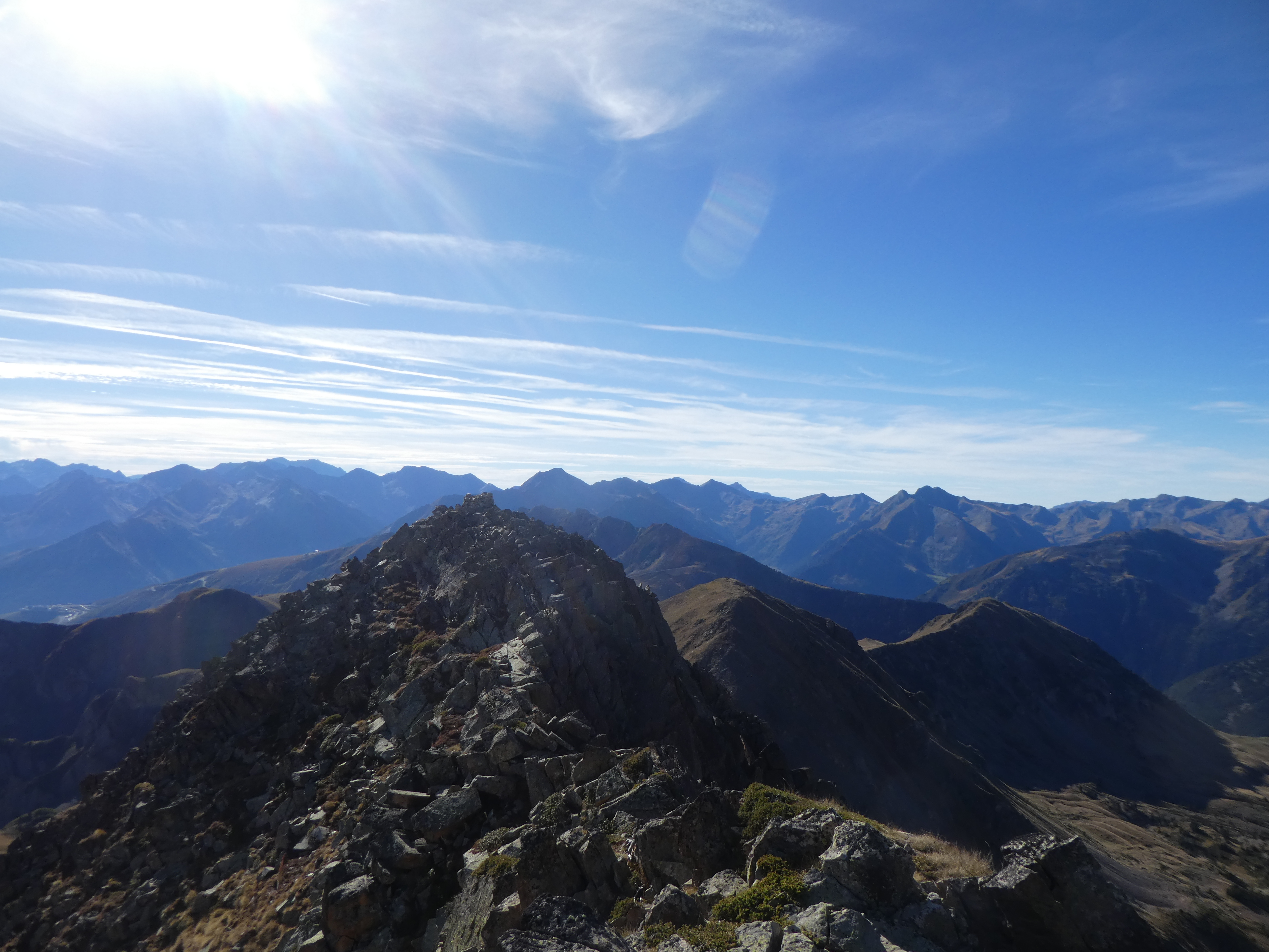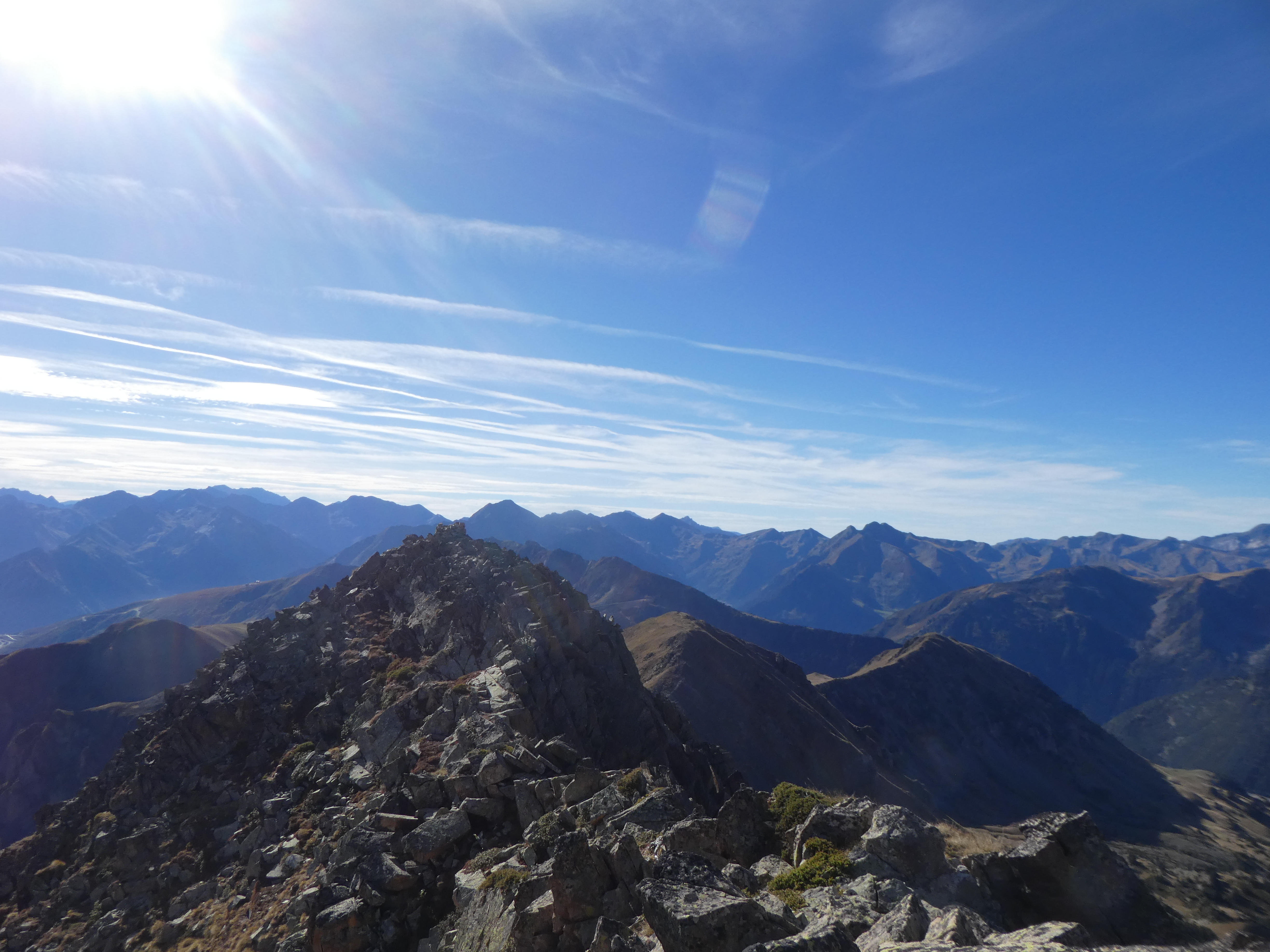 Arrivée au sommet du Pic de Portarras (2697 m) : beau panorama avec le soleil revenu sur les sommets de la Vallée d'Aure, des Pyrénées Haut-Garonnaises, du Couserans, du Val d'Aran, du Pallars Sobirà, du Sobrarbe, de la Réserve Naturelle du Néouvielle, de la Haute-Bigorre et de la Vallée des Gaves