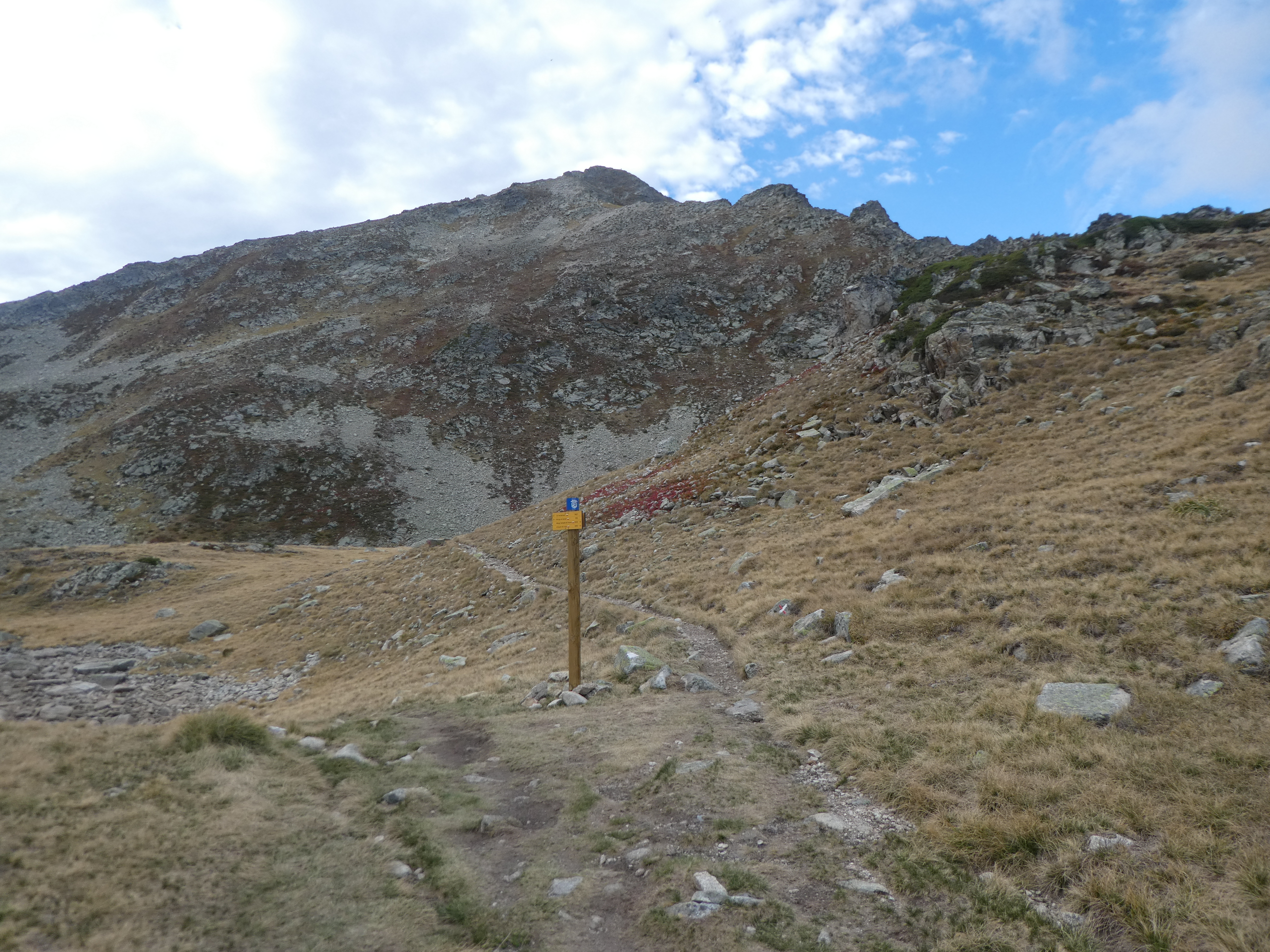 A ce croisement avec le GR10 accès marqué par la présence d'un panneau directionnel (800 mètres après le départ) (1558 m), suivre ce dernier partant sur la droite direction Refuge de Campana de Cloutou, balisé en rouge et blanc dorénavant