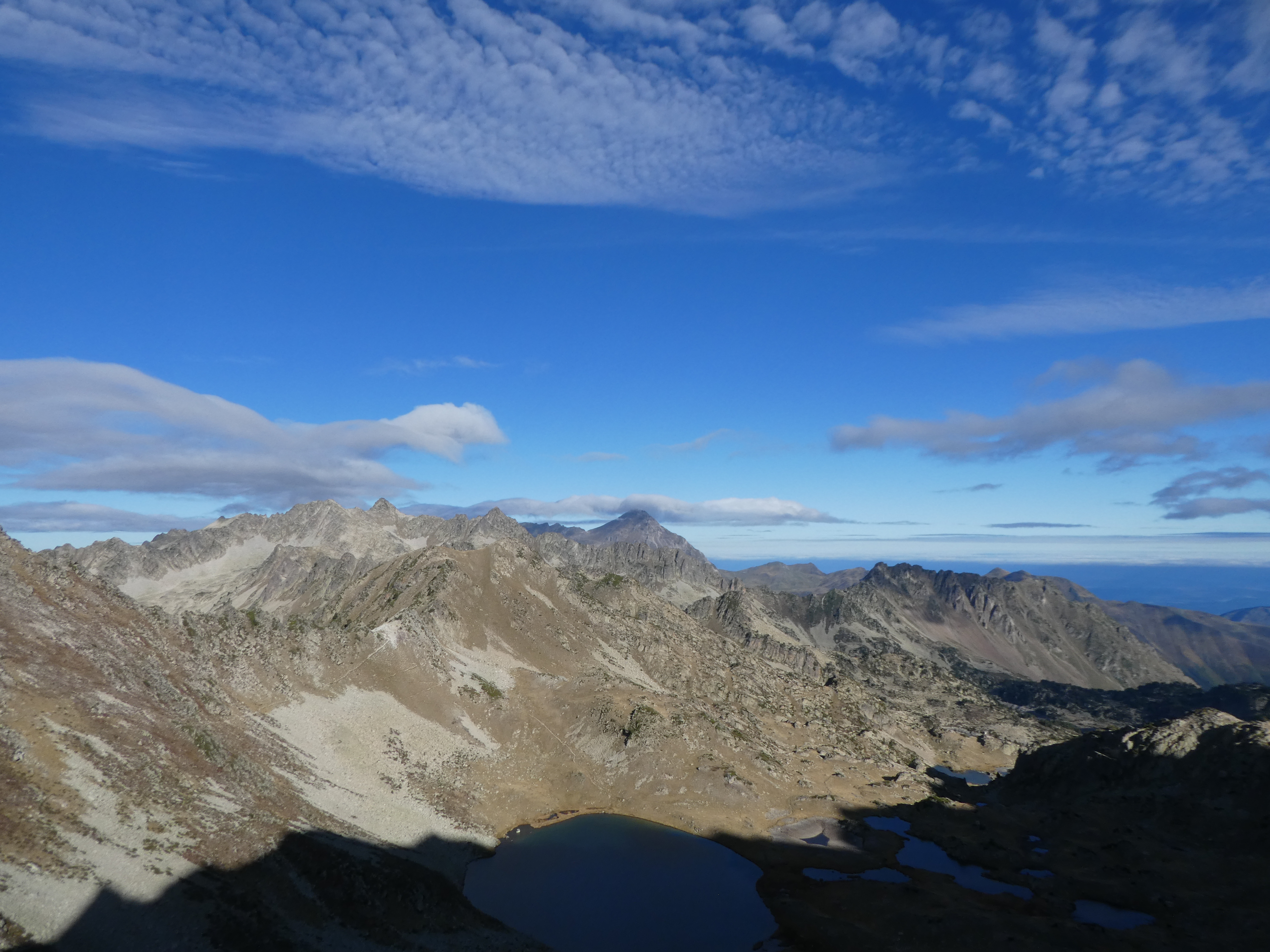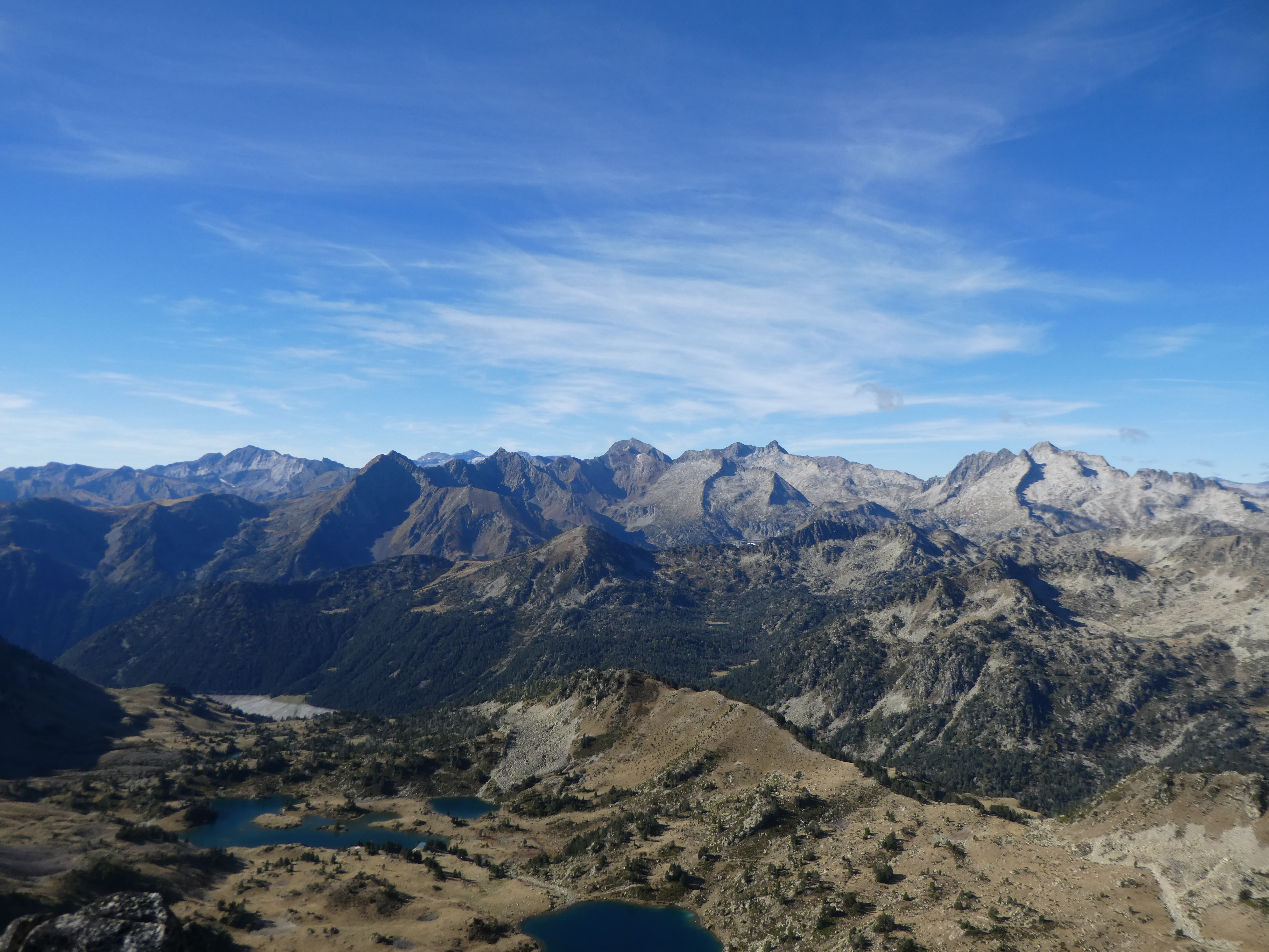 Zoom sur le Montardo (2833 m) et le Tuc de Ratèra (2863 m) à gauche, le Pic de Fonguera (2883 m) et le Gran Tuc de Colomèrs (2933 m) au centre, et le Pa de Sucre (2864 m) et le Pic de Contraix (2958 m) à droite