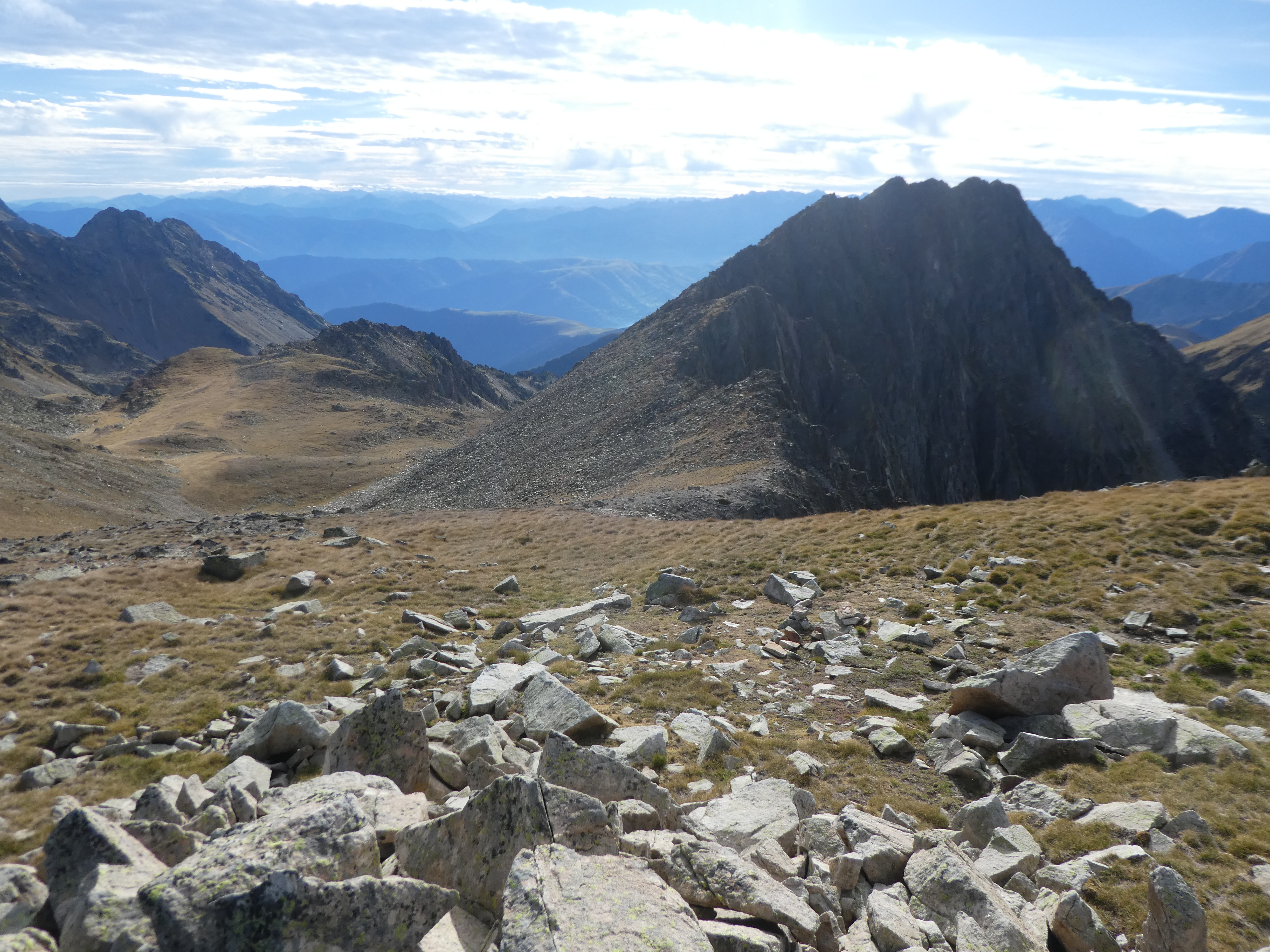 La descente à travers les blocs rocheux vers le col séparant le Pic de Bastan d'Aulon du Pic de Portarras
