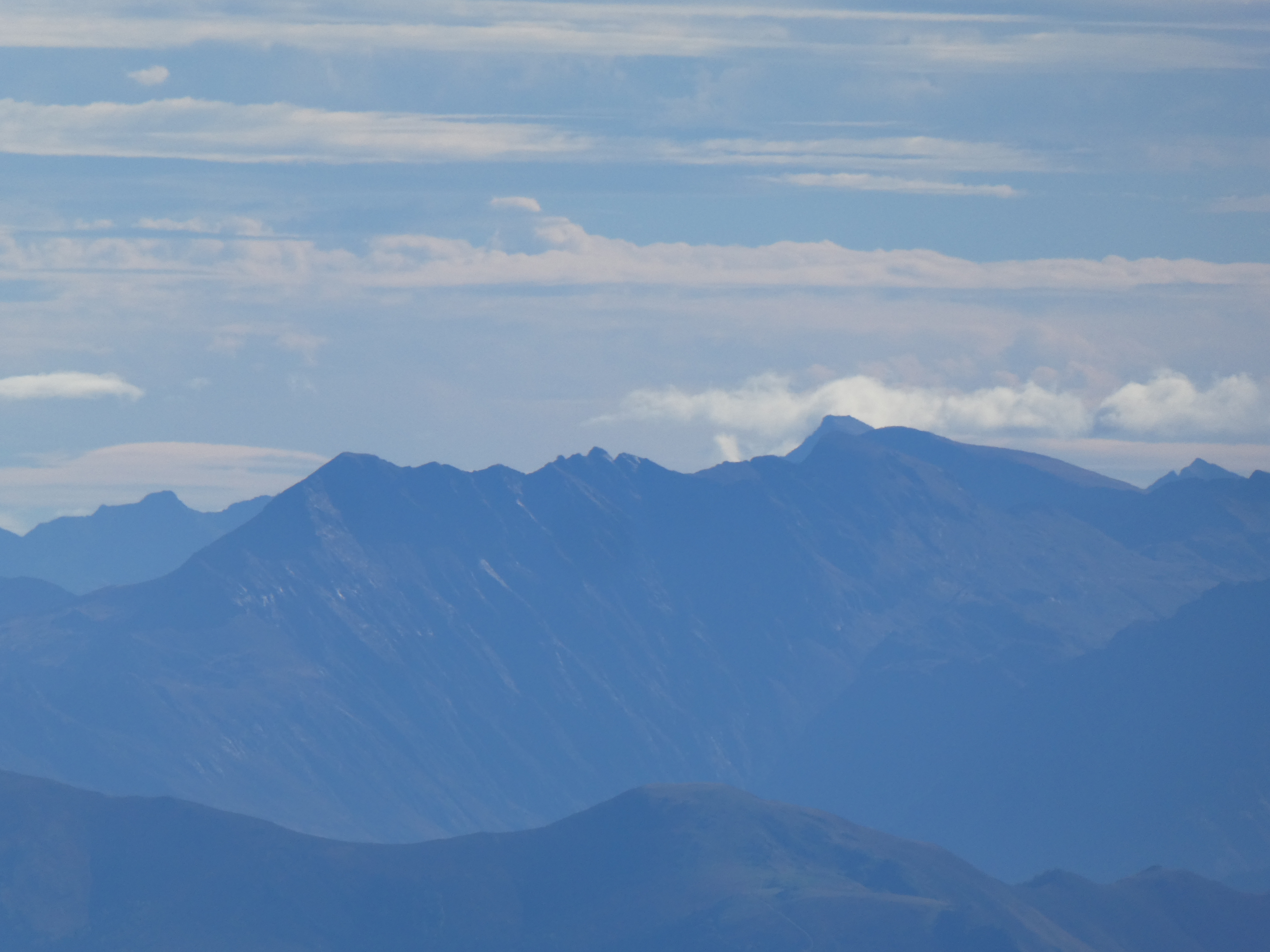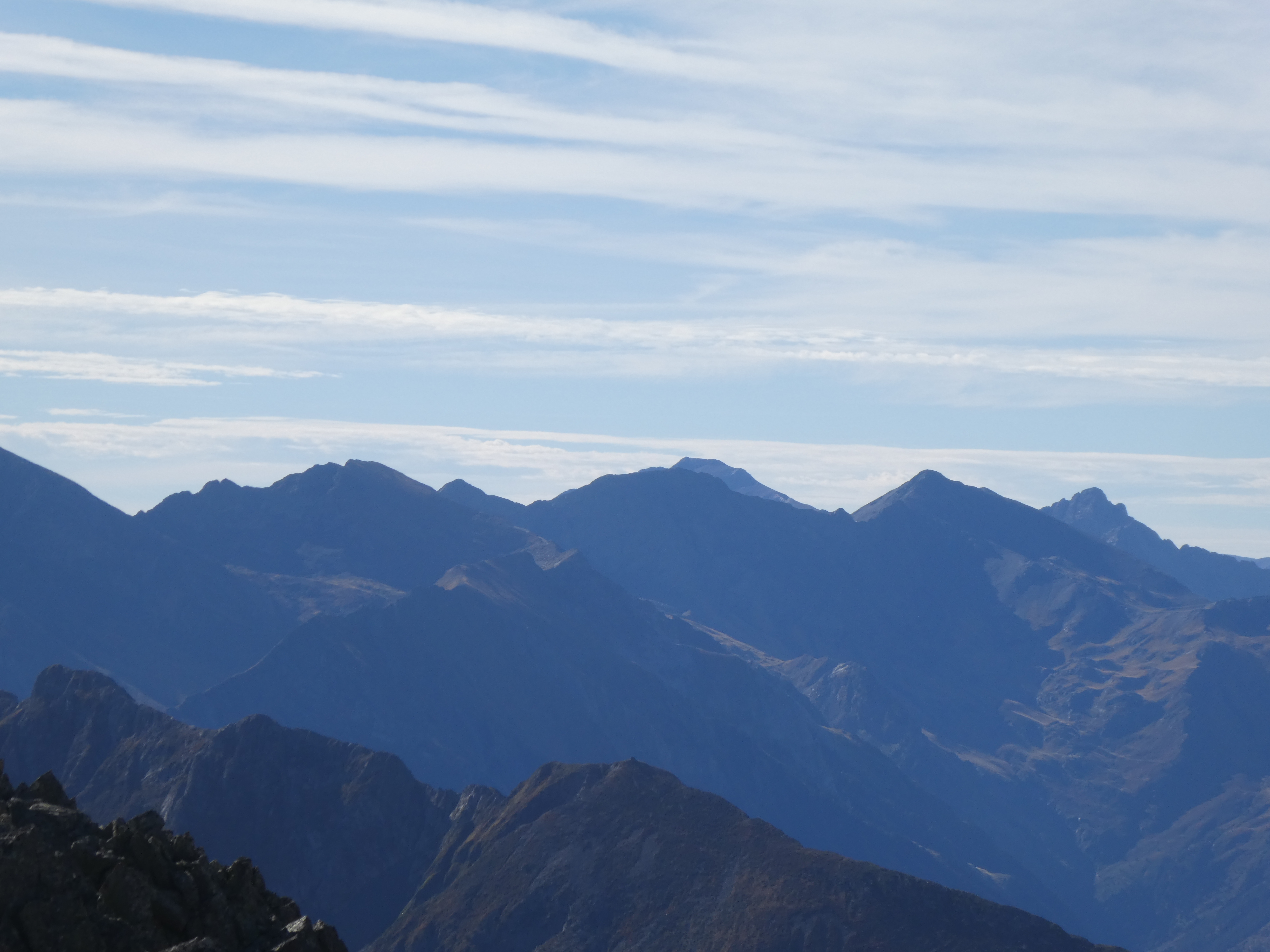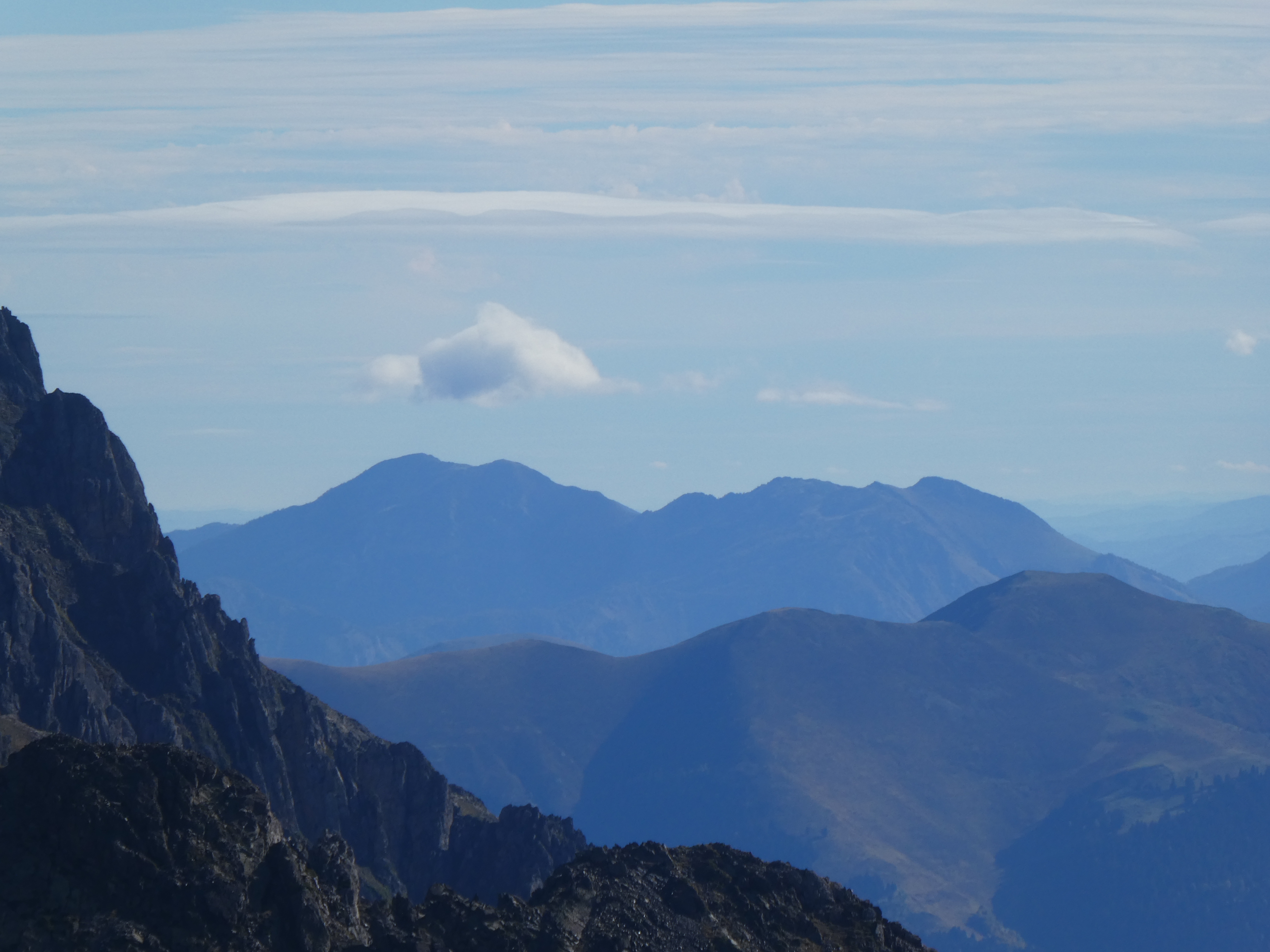 Zoom sur le Pic de Palada (2681 m) au centre-gauche, le Milhas (2739 m) au centre et le Pic des Tourettes (2771 m) au centre-droit