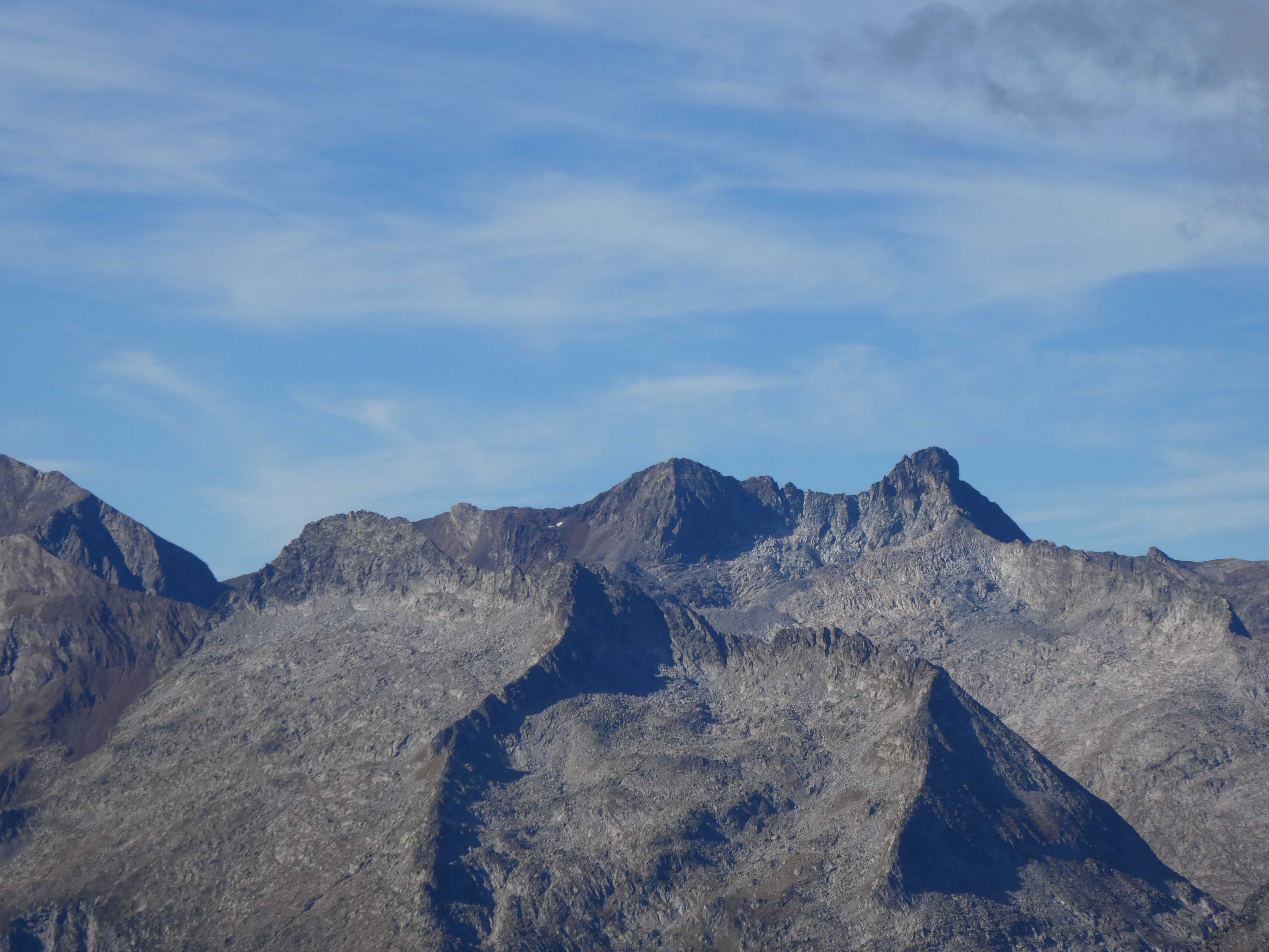 Zoom sur le Pui de la Bonaigua (2776 m) à gauche, le Pic de Xemeneies (2828 m) au centre-gauche, los Tres Puis (2821 m) au centre-droit et le Pic de Bassiero (2903 m) à droite