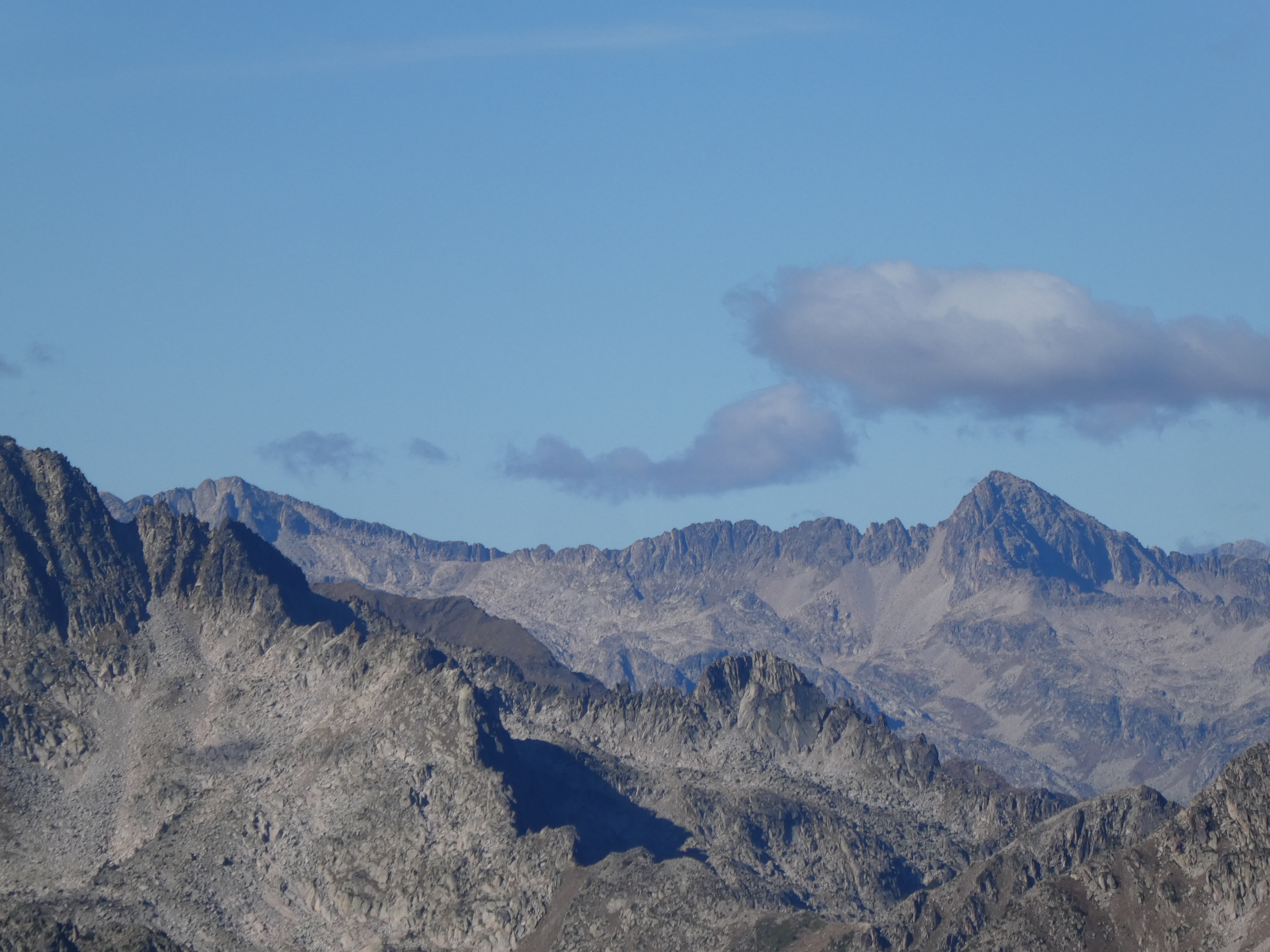 Zoom sur la Muga (2861 m) et le Tossal de Vallcivera (2846 m) à gauche, la Tossa Plana de Lles (2905 m) au centre-gauche, et la Torre de Cabús (2780 m) et les Bassiets (2760 m) à droite
