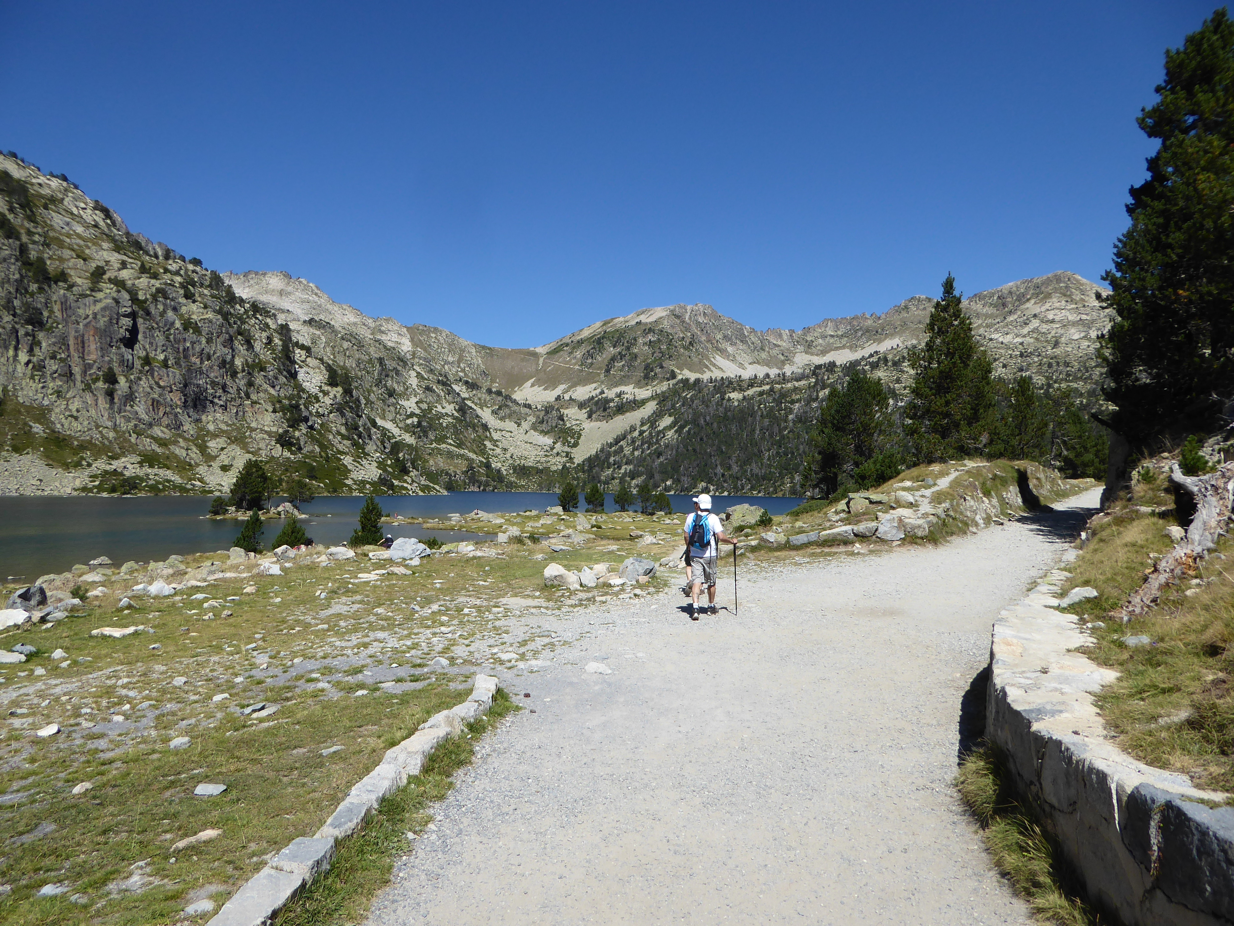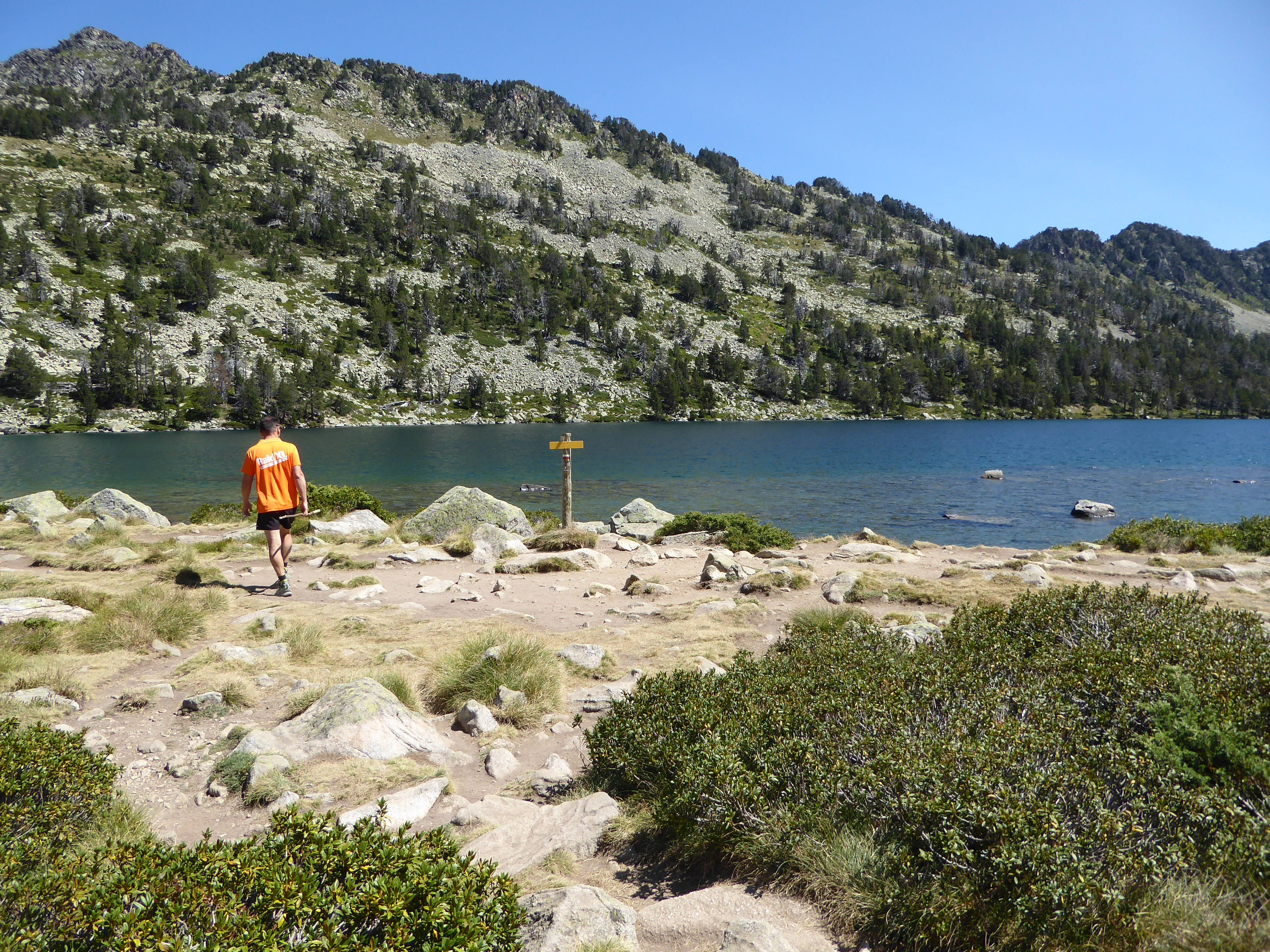 Lac d'Aumar (2195 m) : suivre le chemin partant à droite et longeant le lac direction Col d'Estoudou, balisé en rouge et blanc dorénavant