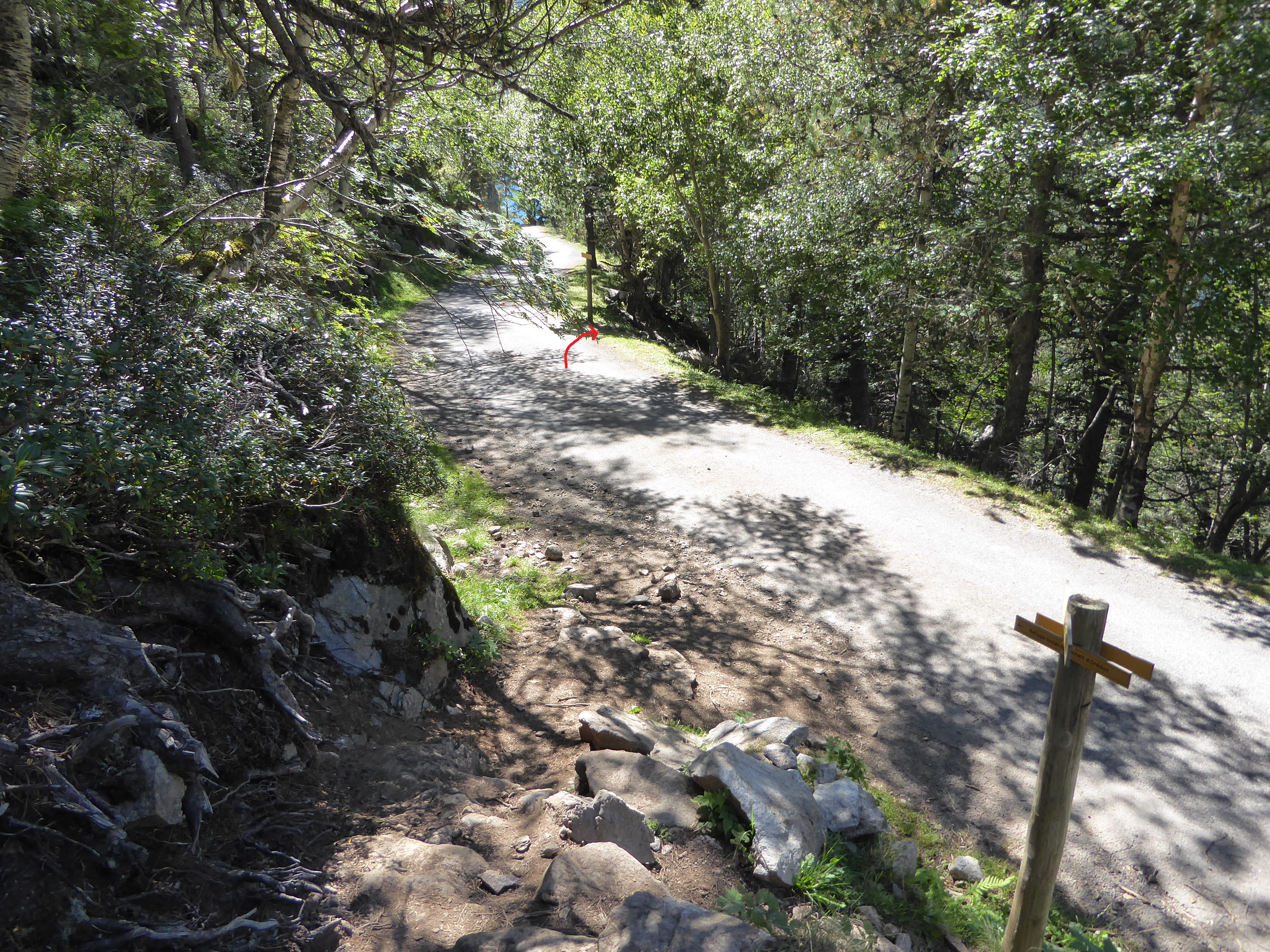 A ce croisement avec la Route des Lacs, la suivre sur une vingtaine de mètres puis suivre le chemin descendant sur la droite direction Lac d'Orédon