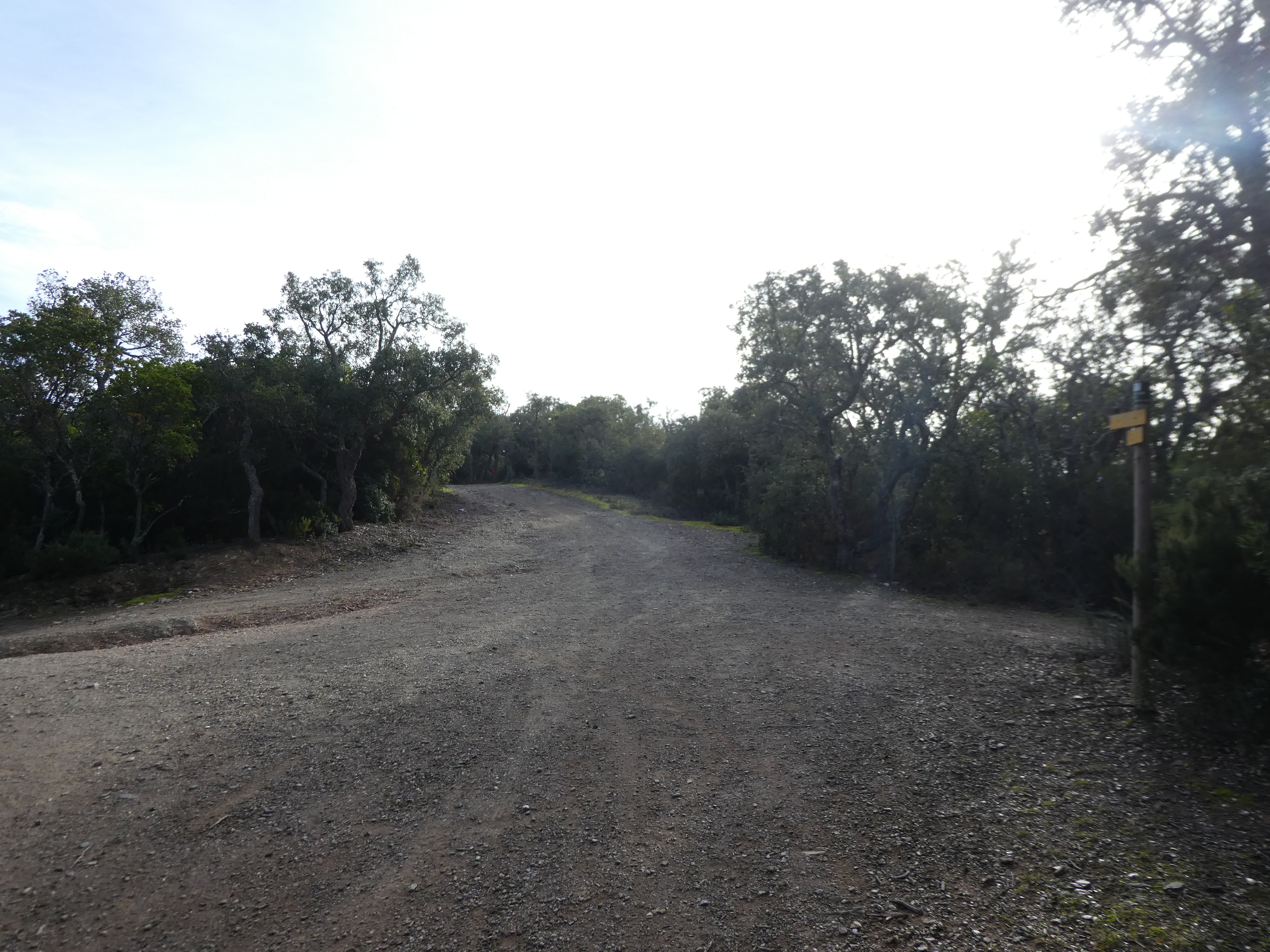 A ce croisement marqué par la présence d'un panneau directionnel (1000 mètres après la précédente intersection) (292 m), suivre la piste partant tout droit direction Vivès (par le Sentier du Liège), balisé en jaune et blanc