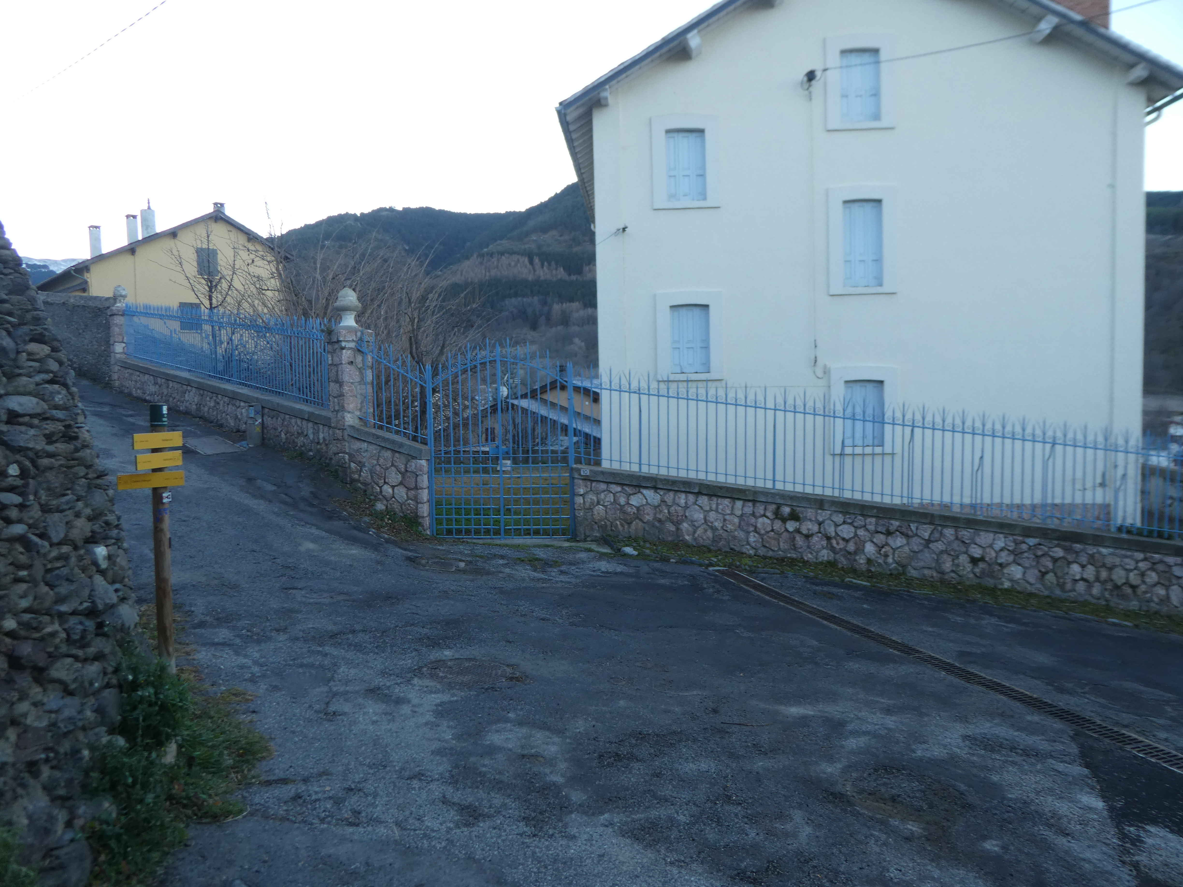 A cette intersection marquée par la présence d'un panneau directionnel (100 mètres après la précédente mentionnée), suivre la rue partant sur la droite direction Saillagouse, balisé en jaune (direction non mentionnée sur le panneau directionnel)
