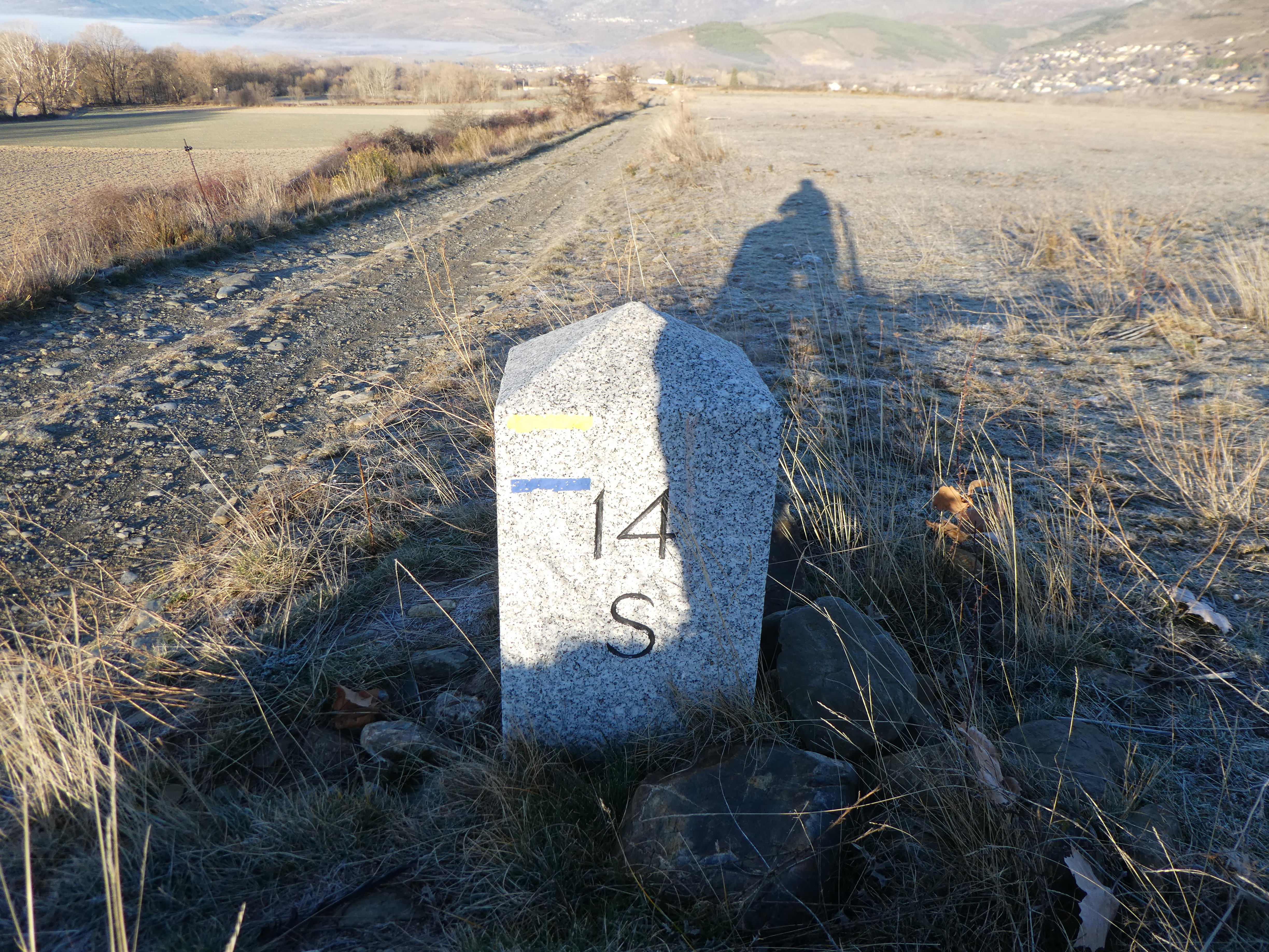 A ce croisement marqué par la présence d'une borne frontière (1000 mètres après avoir traversé la N116), suivre le chemin partant tout droit direction Llívia, balisé en jaune (frontière franco-espagnole : entrée en Espagne)