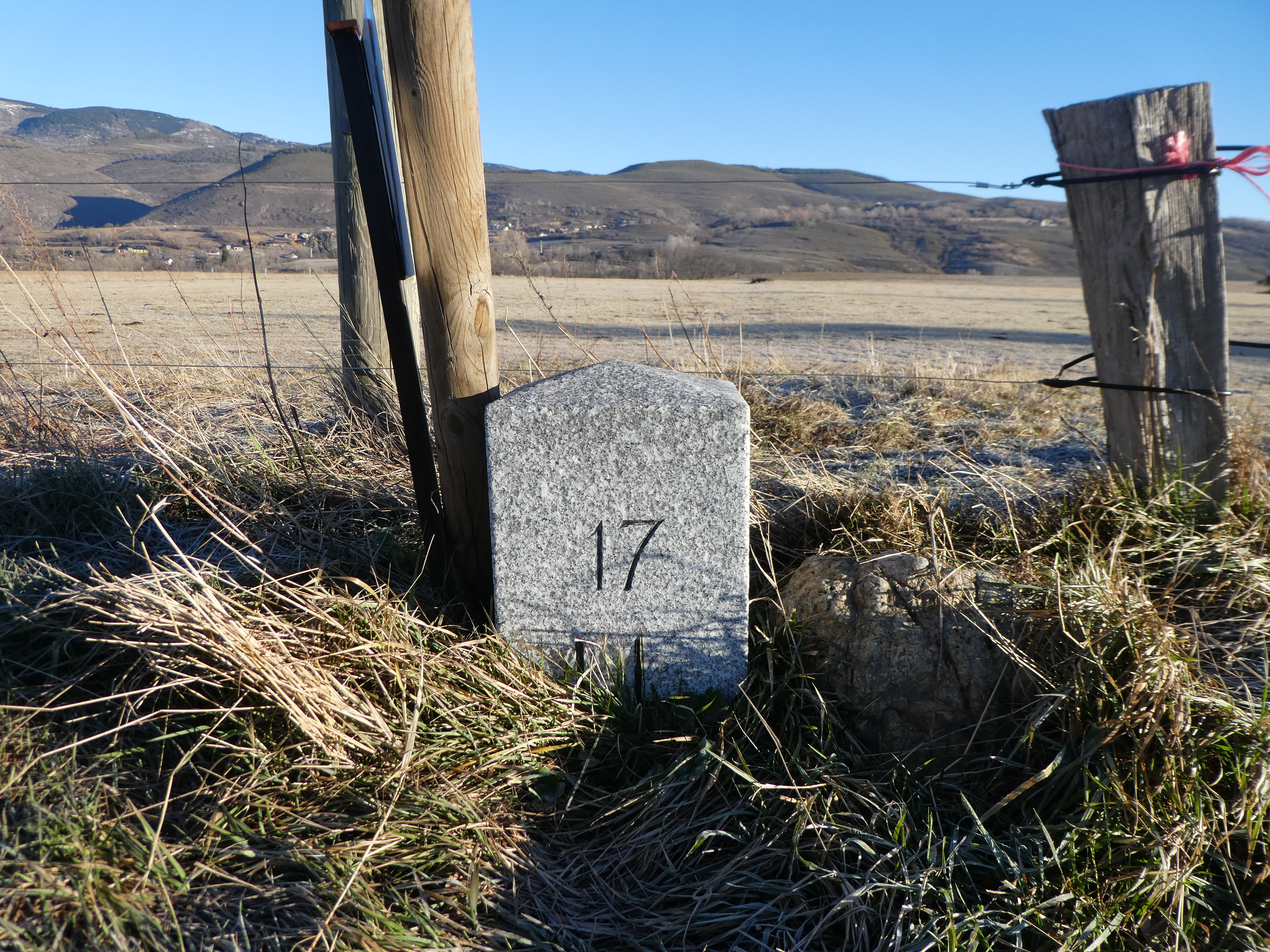A ce croisement avec la N-154 situé au niveau de la Borne Frontière n°17 (900 mètres après le précédent), suivre le chemin partant légèrement sur la gauche en face de la route direction Llívia, balisé en jaune