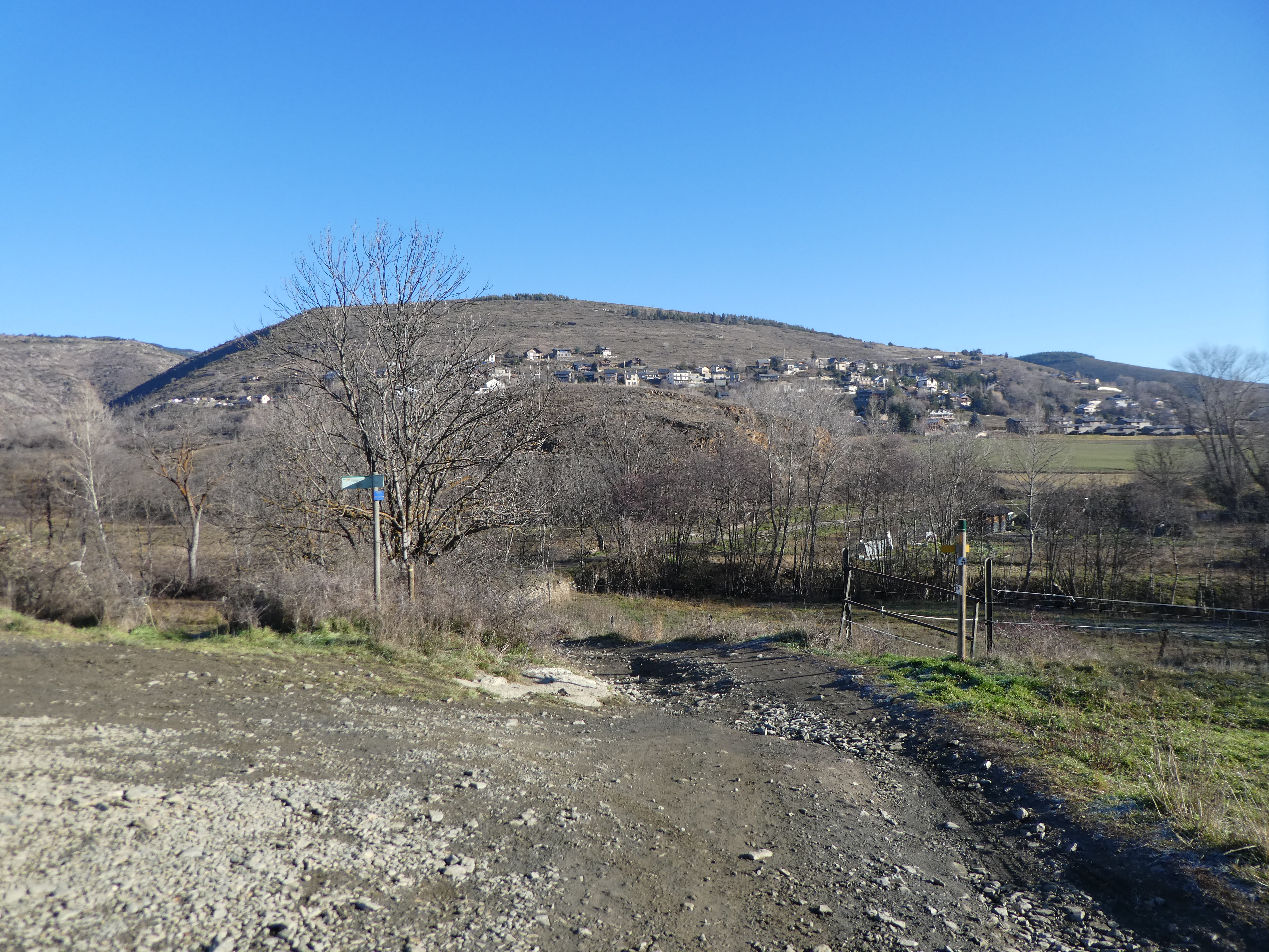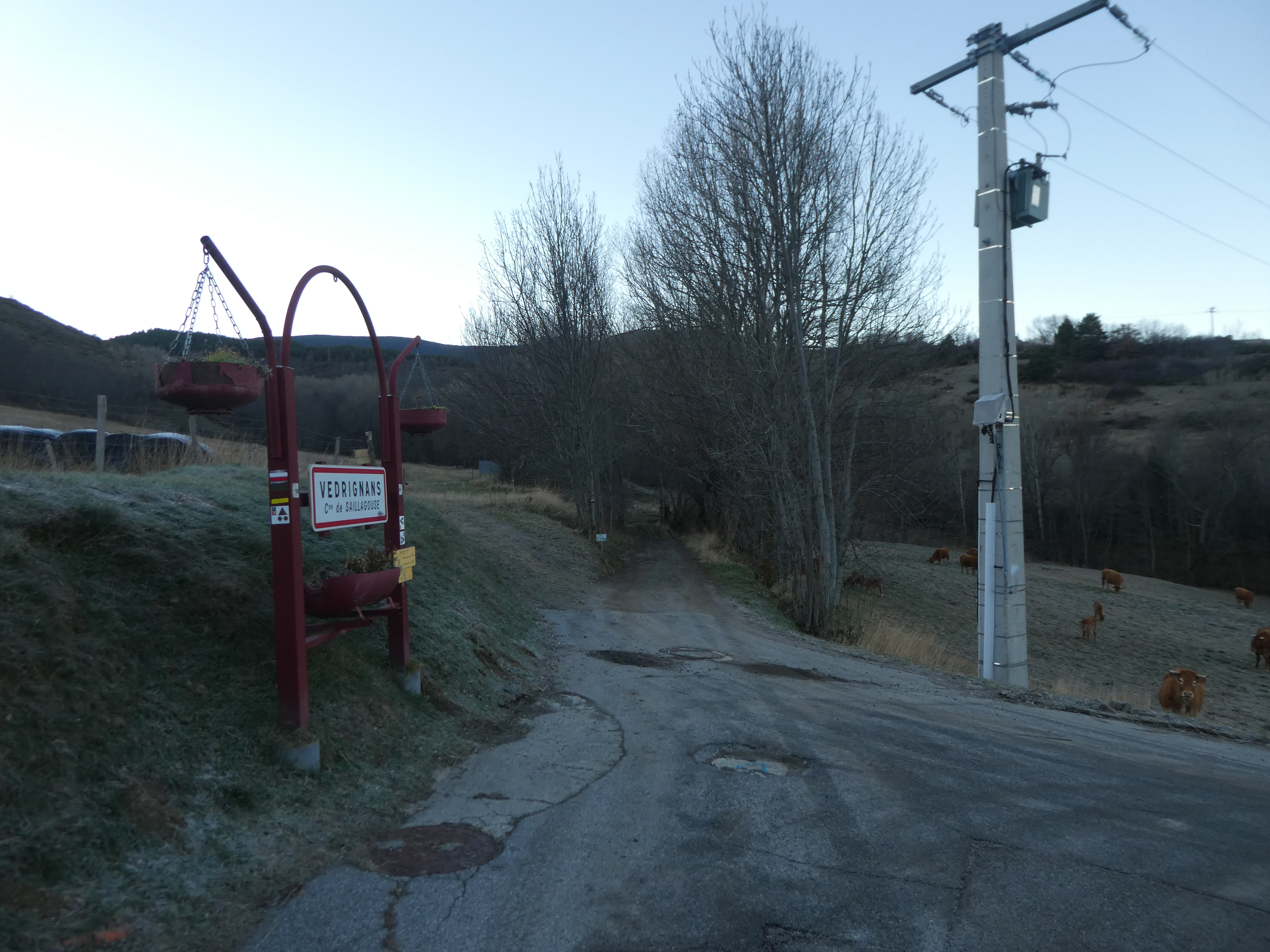 A ce croisement situé à la sortie de Vedrinyans marquée par la présence d'un panneau directionnel (250 mètres après la précédente intersection mentionnée), suivre le chemin partant tout droit direction Err, balisé en rouge et blanc, et en jaune