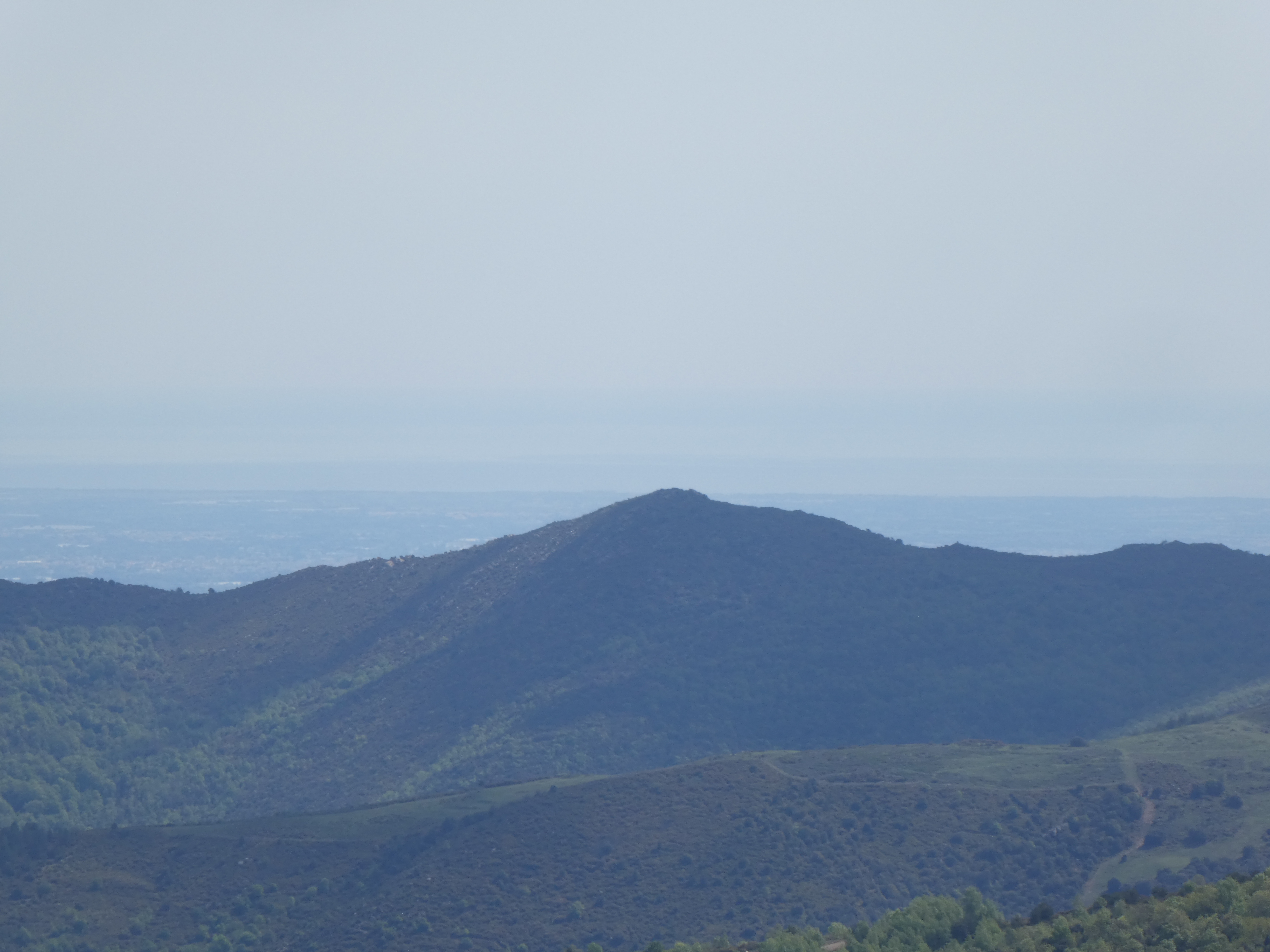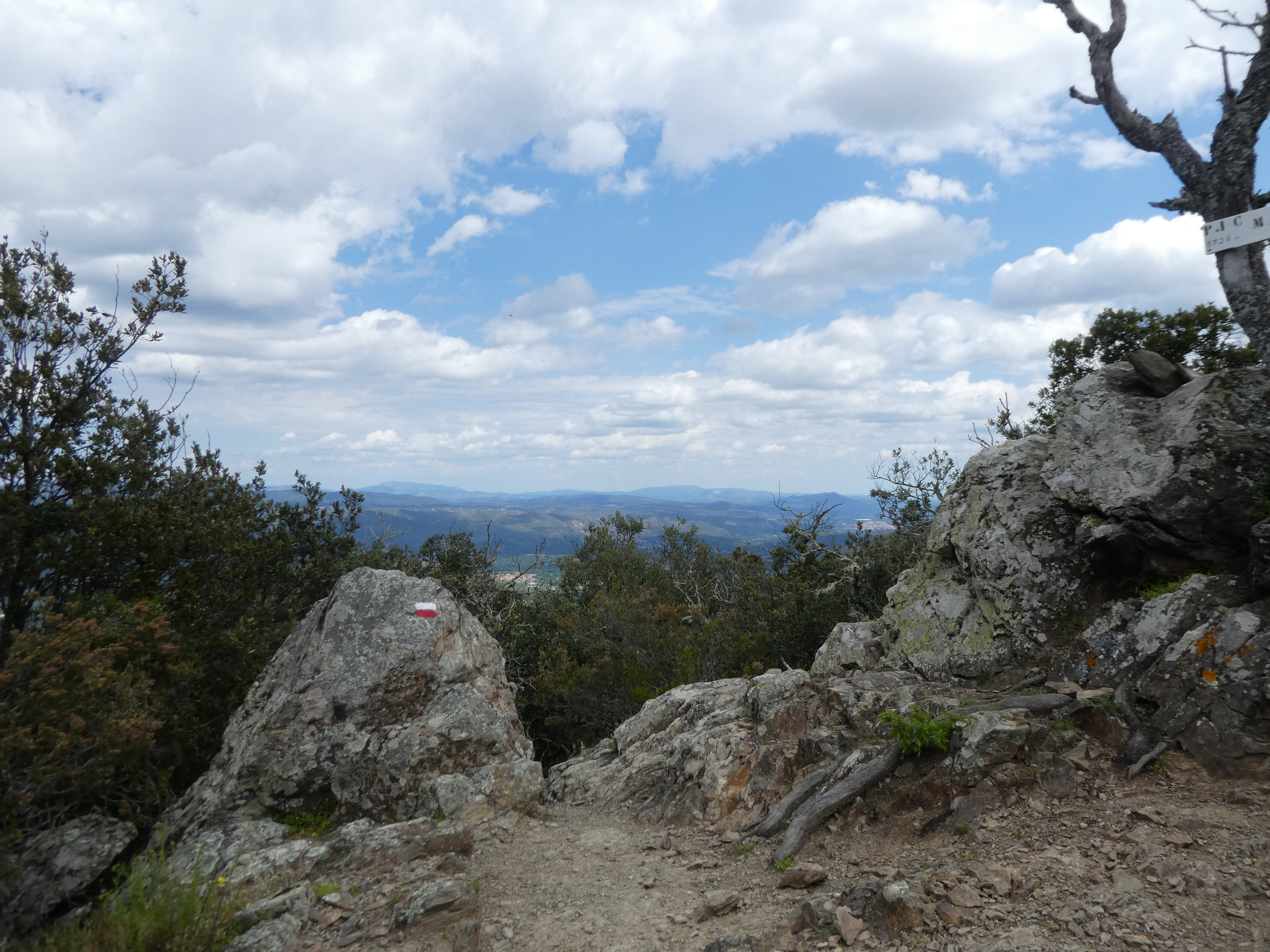 Arrivée au sommet du Puig de Marbet (726 m) : beau point de vue sur les sommets du Conflent, des Pyrénées Audoises, du Fenouillèdes, des Corbières ainsi que sur la Vallée de la Têt