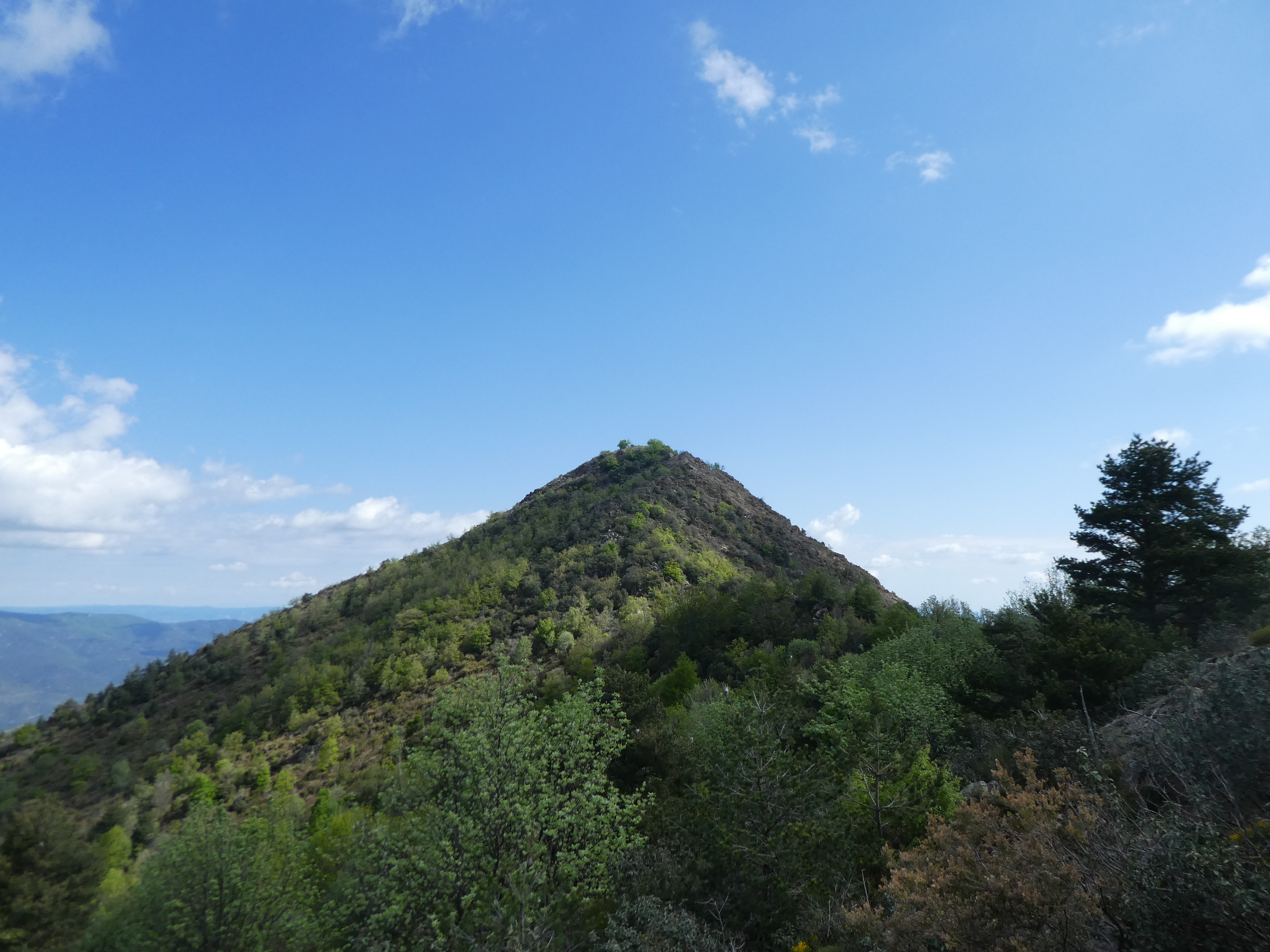 Zoom sur le Pech de Picheric (621 m) au centre-gauche, la Roque de la Pourcatière (773 m) au centre et le Pech de Guilloumet (633 m) à droite