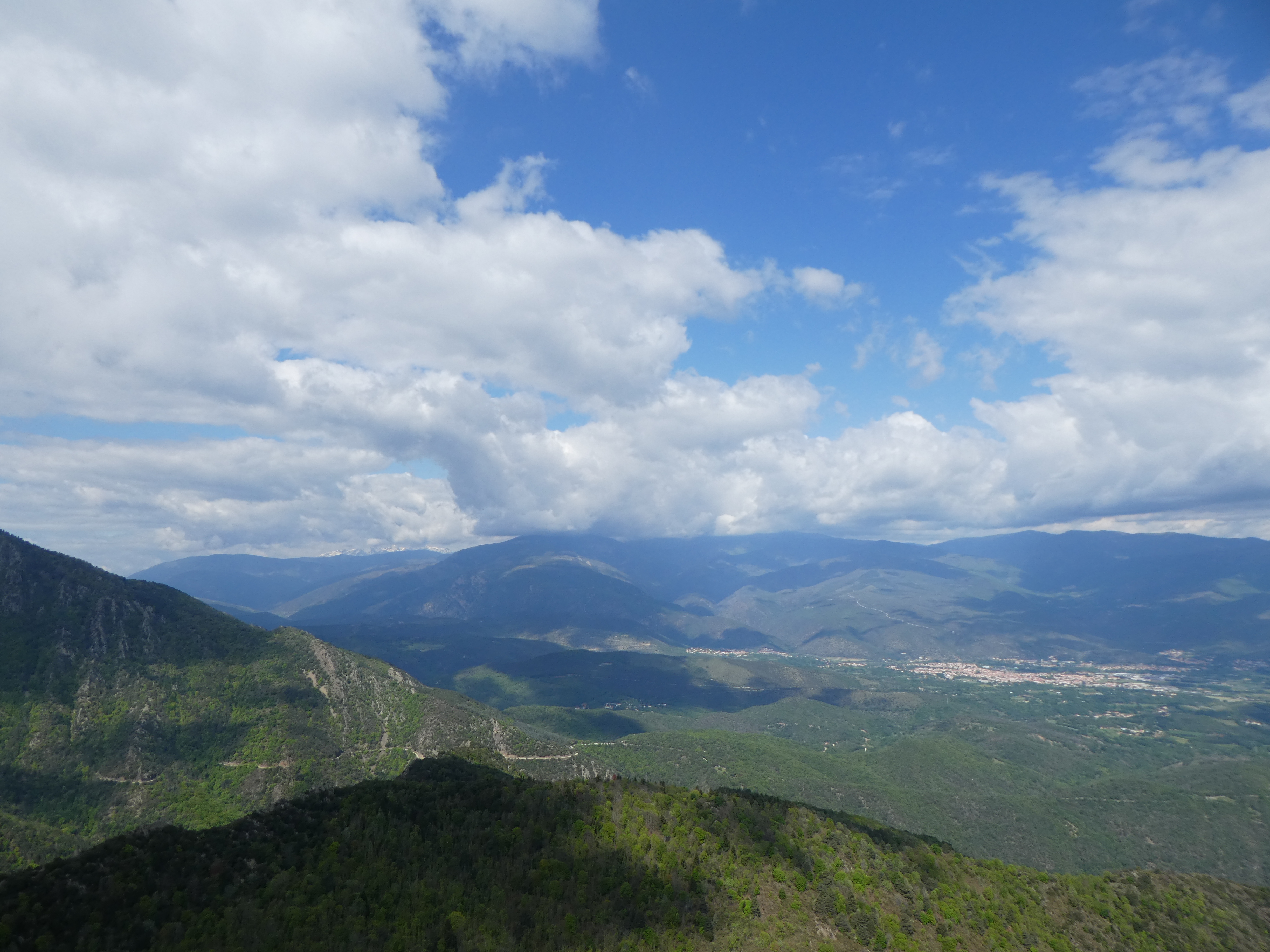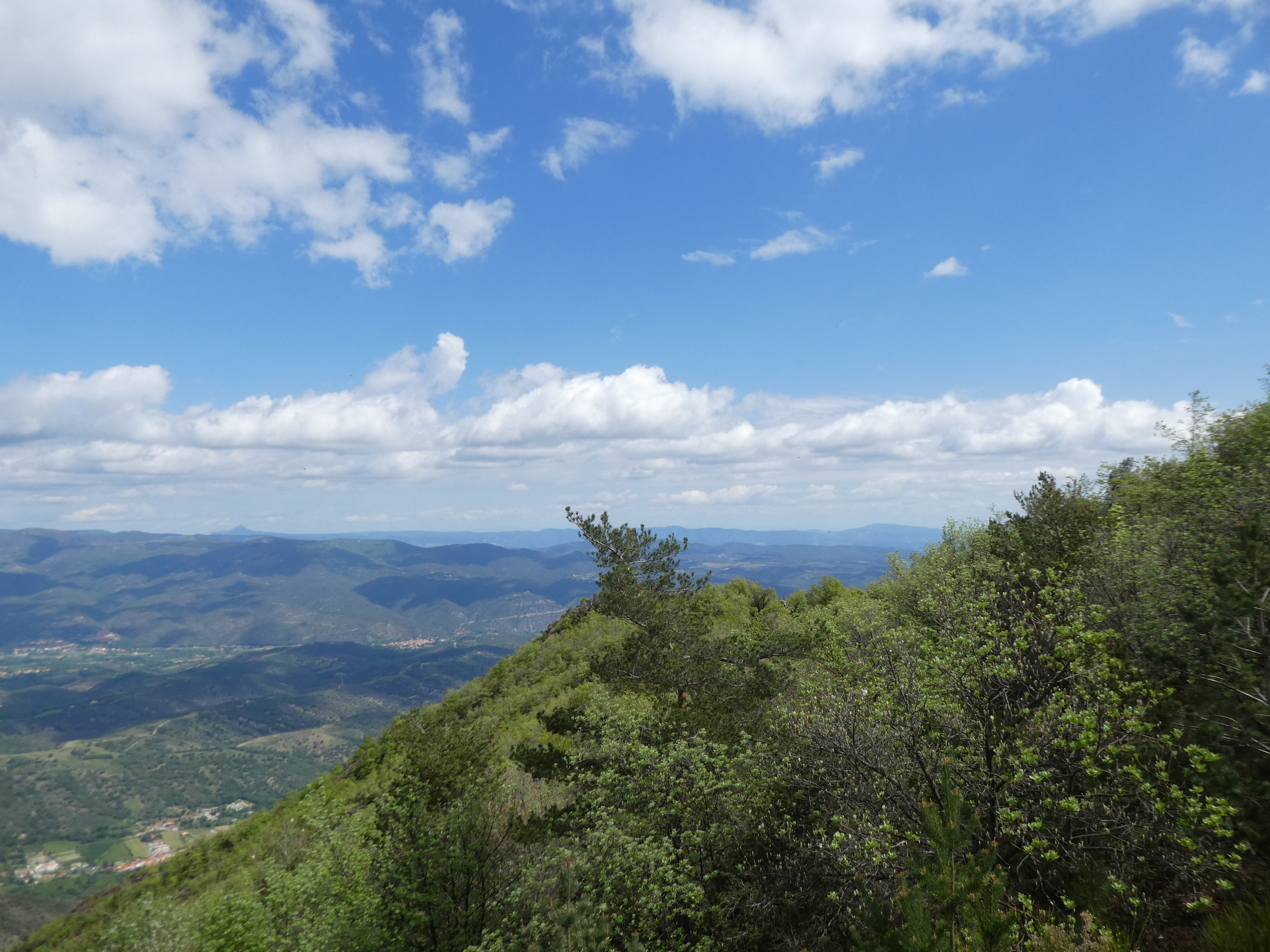 Arrivée au sommet du Puig dels Moros (1211 m) : beau panorama malgré la présence de végétation sur les sommets du Conflent, des Pyrénées Audoises, du Fenouillèdes, des Corbières, des Aspres ainsi que sur la Vallée de la Têt et la plaine du Roussillon .. le massif du Canigou est partiellement dans les nuages