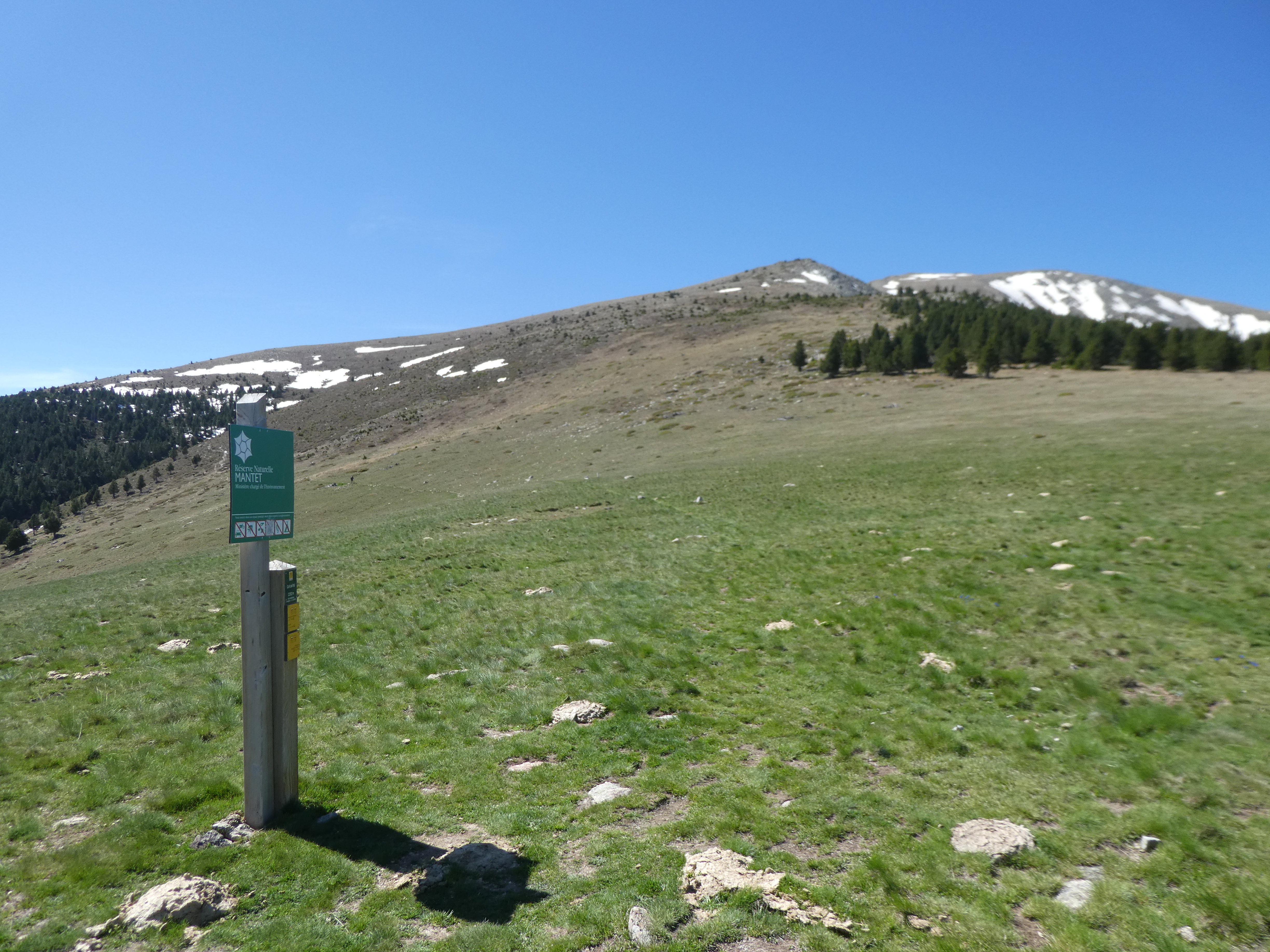 A ce croisement avec le sentier venant de la Baraque des Allemands (1700 mètres après le lieu-dit "l'Alemany"), continuer à suivre le GR10 partant tout droit direction Mantet, balisé en rouge et blanc (sortie de la Réserve Naturelle de Mantet)