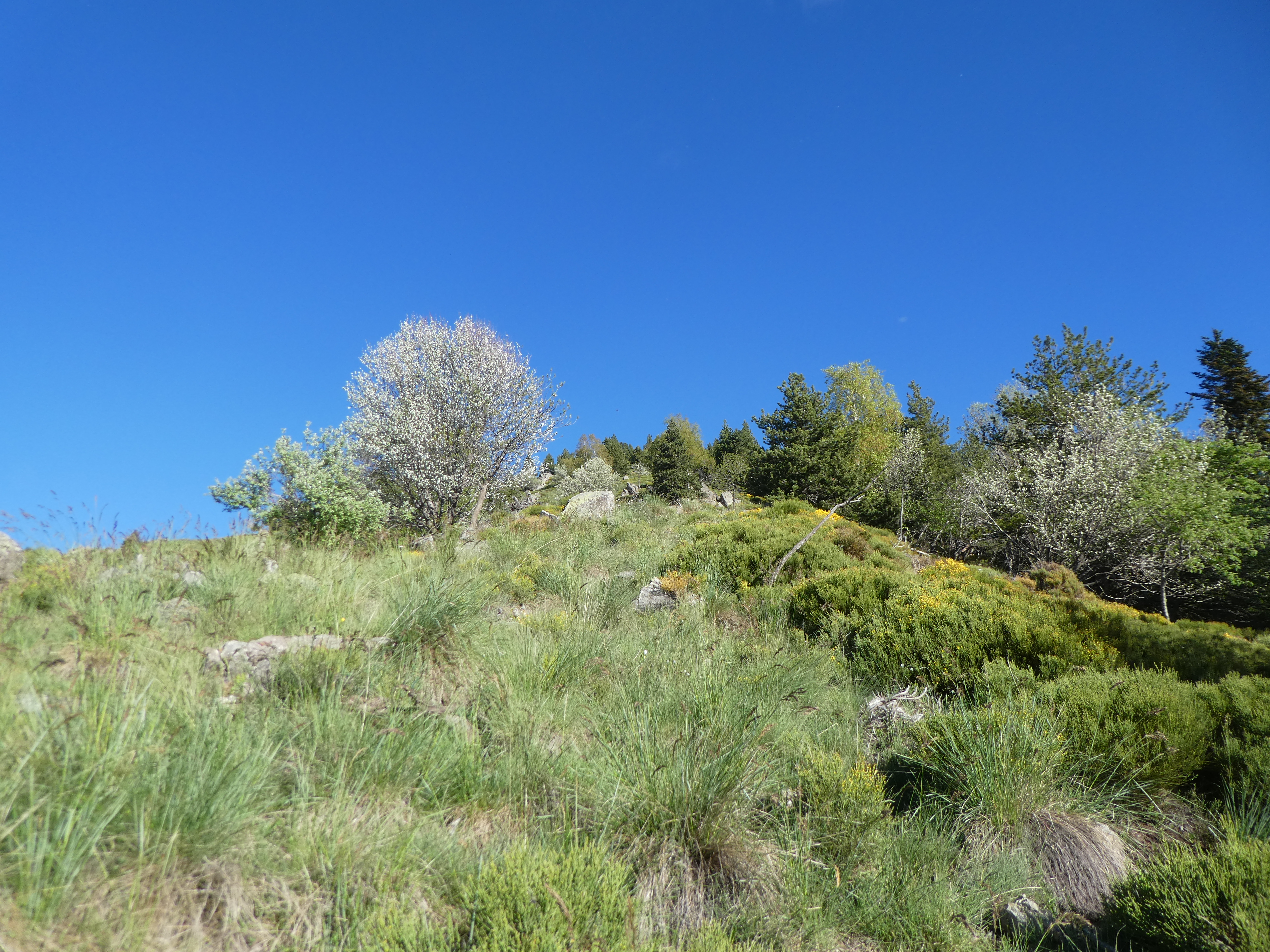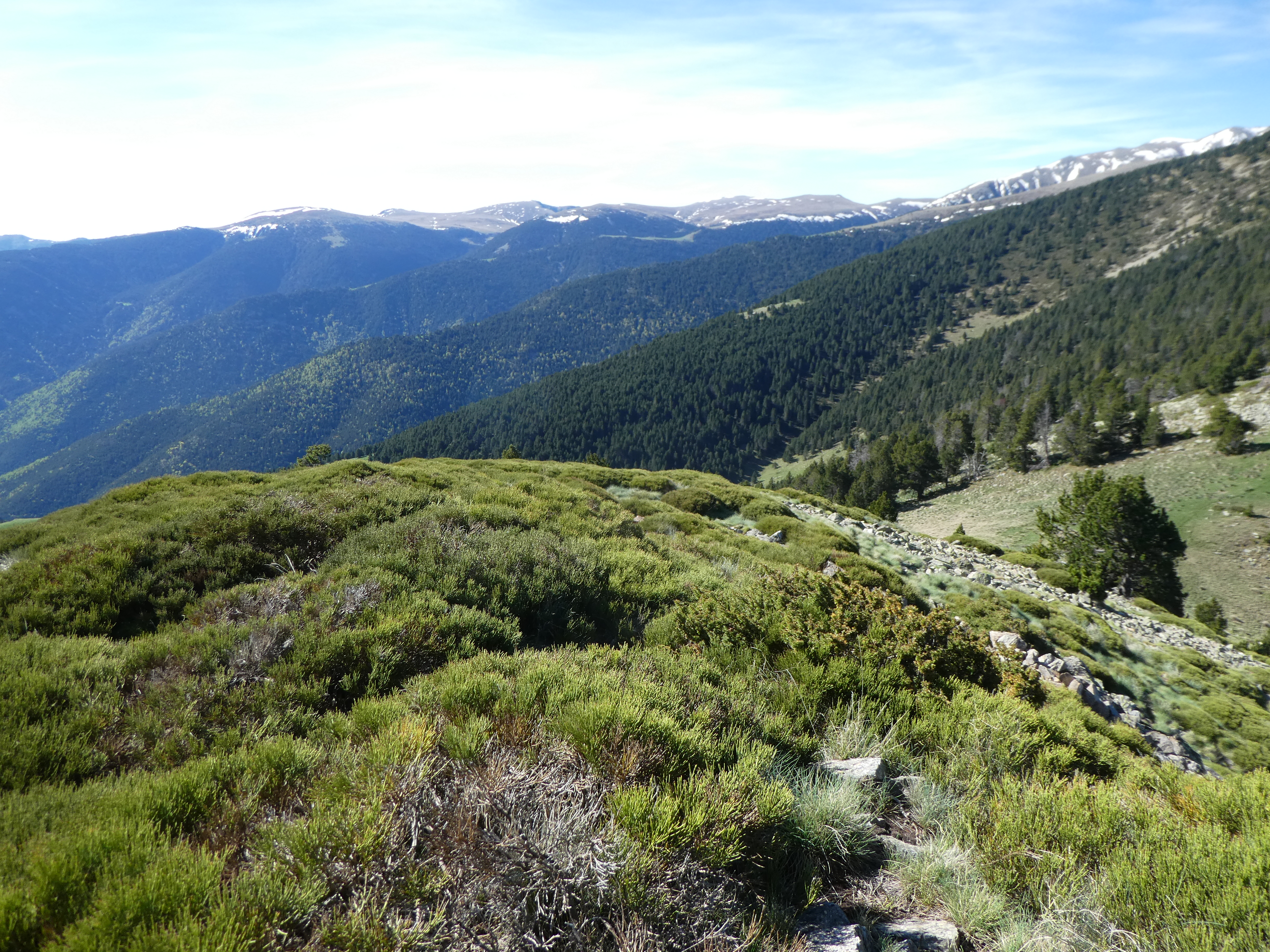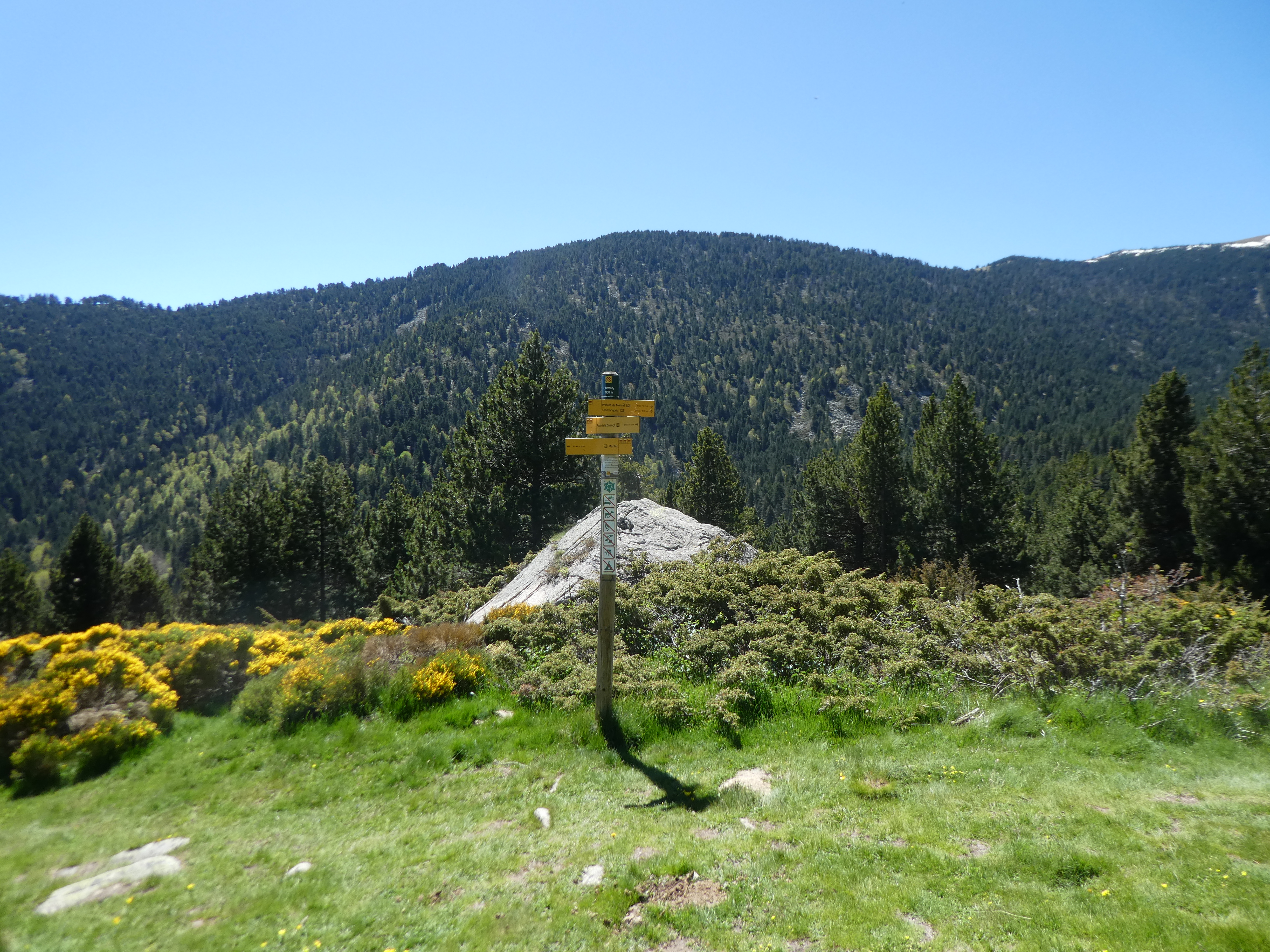 Dès que la progression n'est plus possible à cause de la végétation à proximité de la cote 1796 m (1100 mètres après la précédent croisement), monter à vue sur la droite pour atteindre le sommet de la crête du Puig de l'Orri direction Puig de l'Orri (le semblant de chemin partant tout droit commence à perdre de l'altitude)