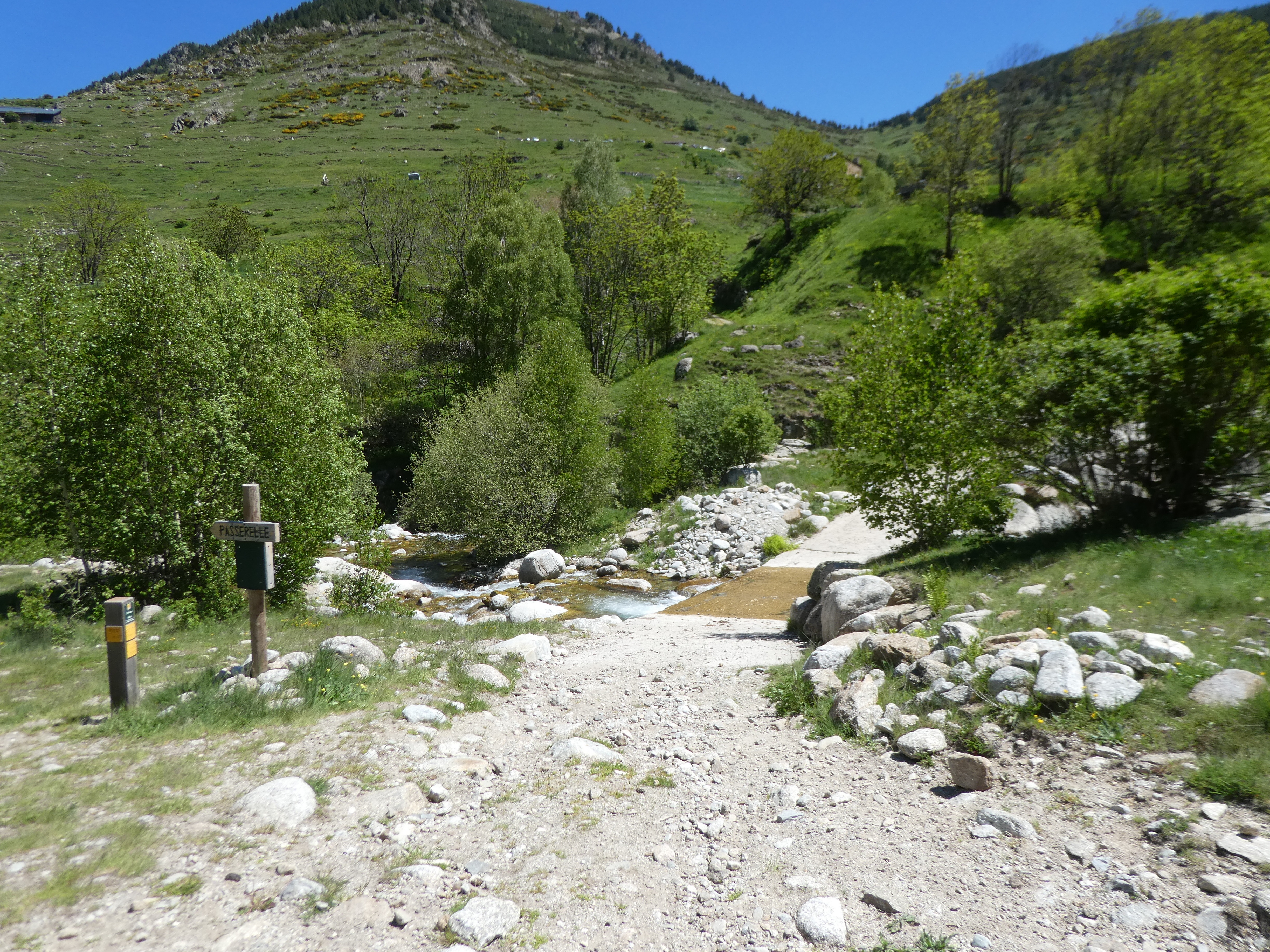 A ce croisement marqué par la présence d'un panneau directionnel (450 mètres après le lieu-dit "Mantet"), suivre le chemin partant sur la droite vers la petite passerelle de la Ribera de Ressec direction Portella de Mentet, balisé en jaune dorénavant