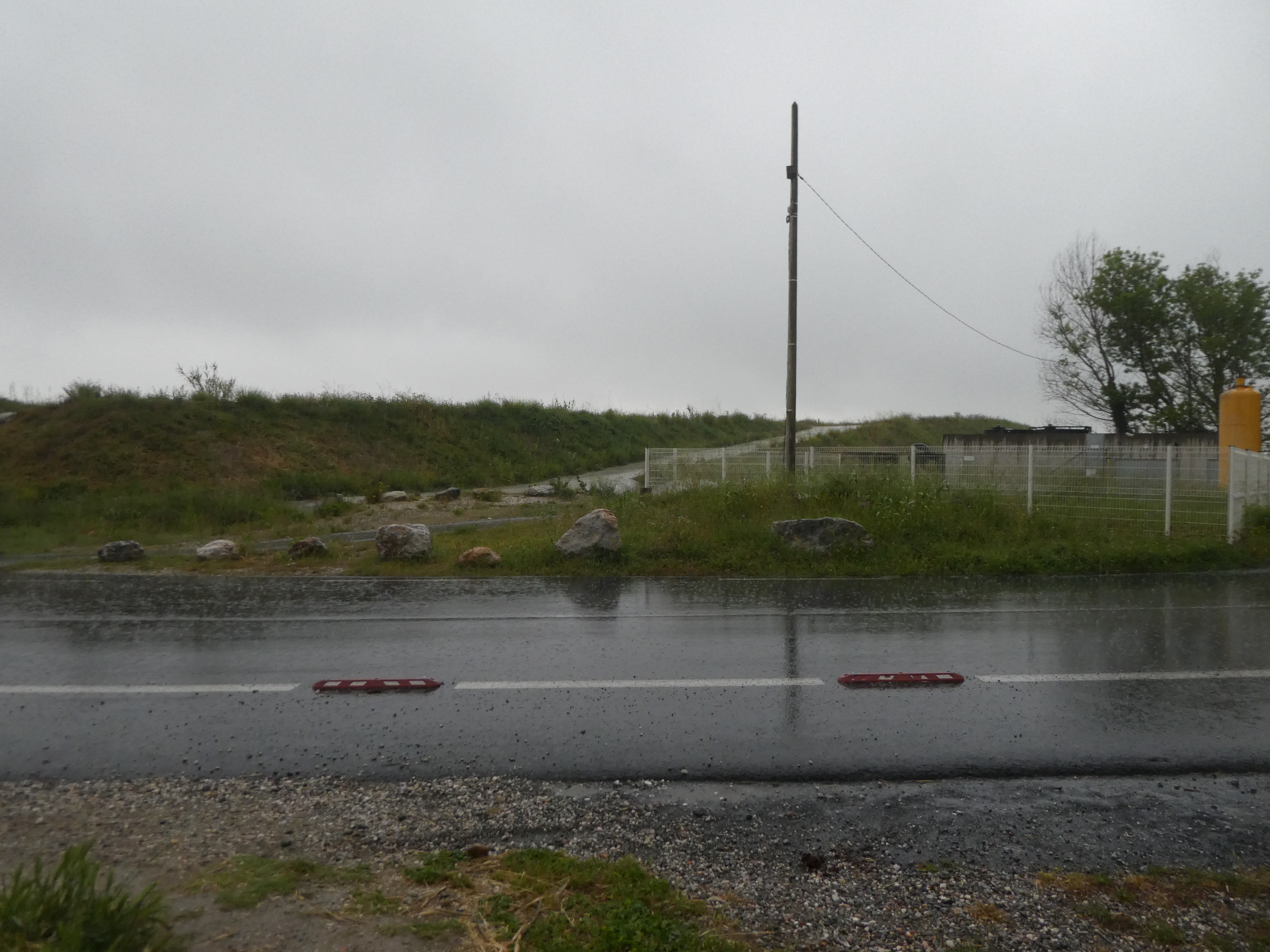 Au niveau de ce rond-point (250 mètres après le précédent croisement), suivre la piste cyclable partant sur la droite sous la D81 direction Canet-en-Roussillon (la pluie déluge de nouveau !)