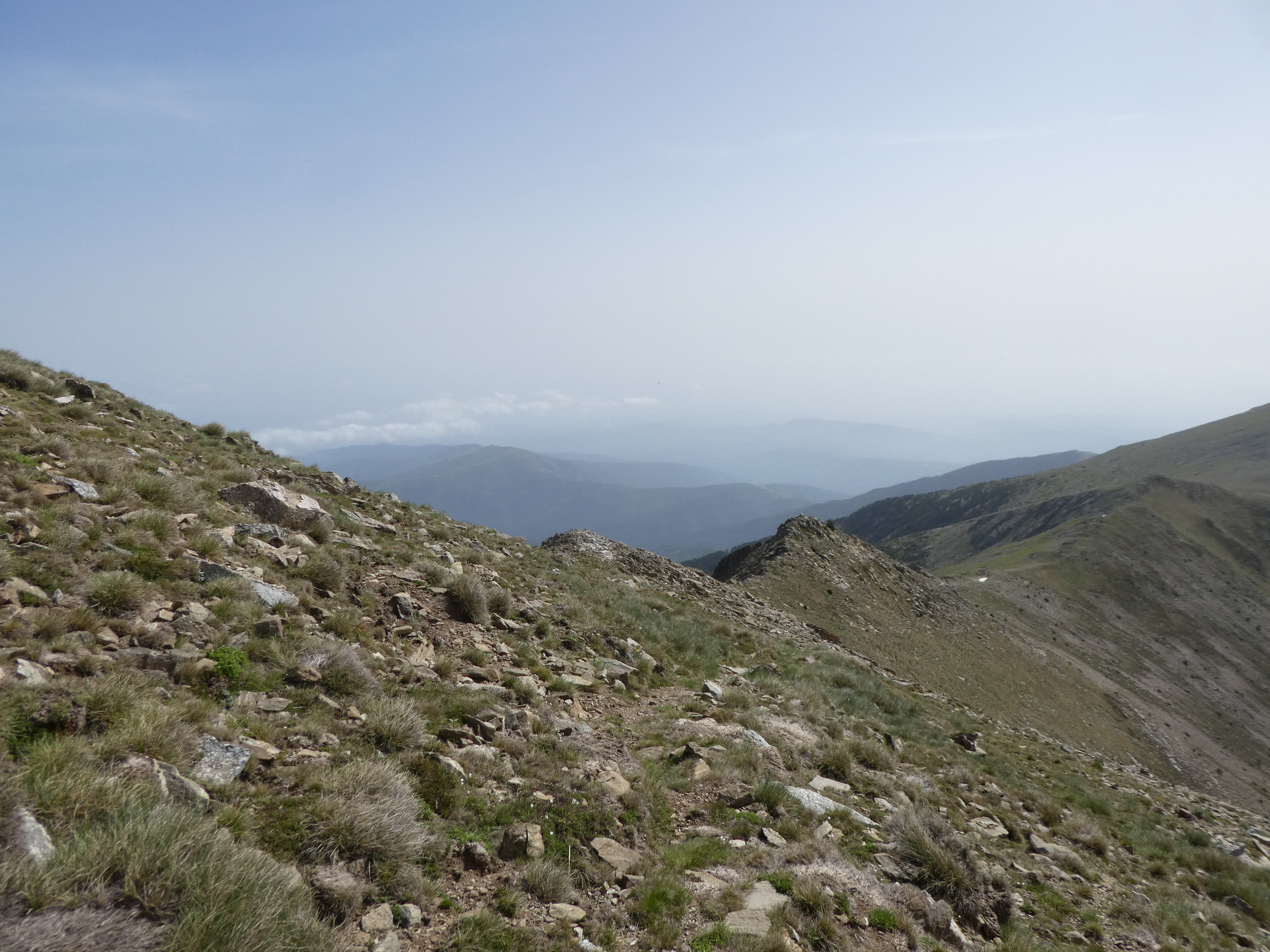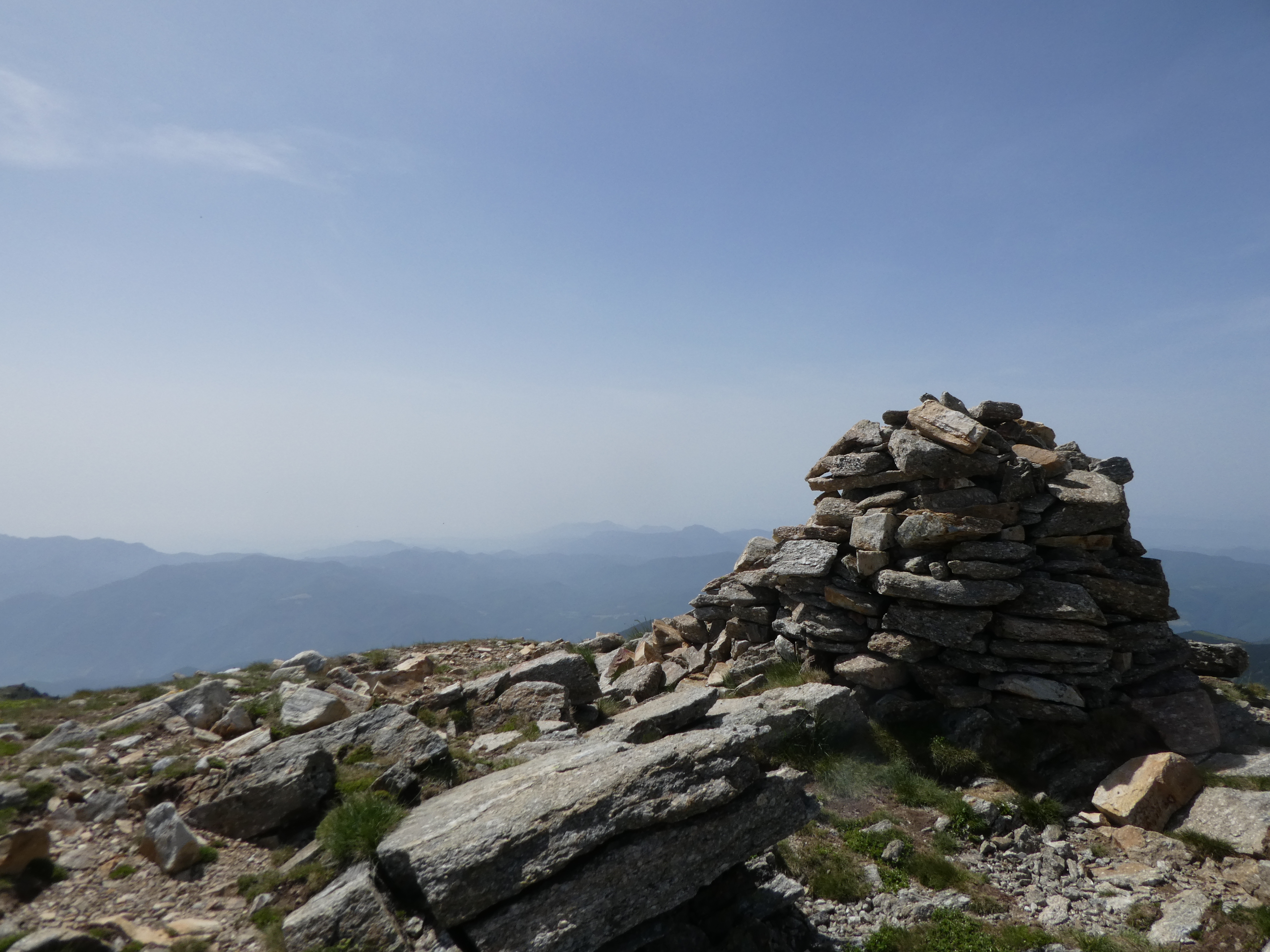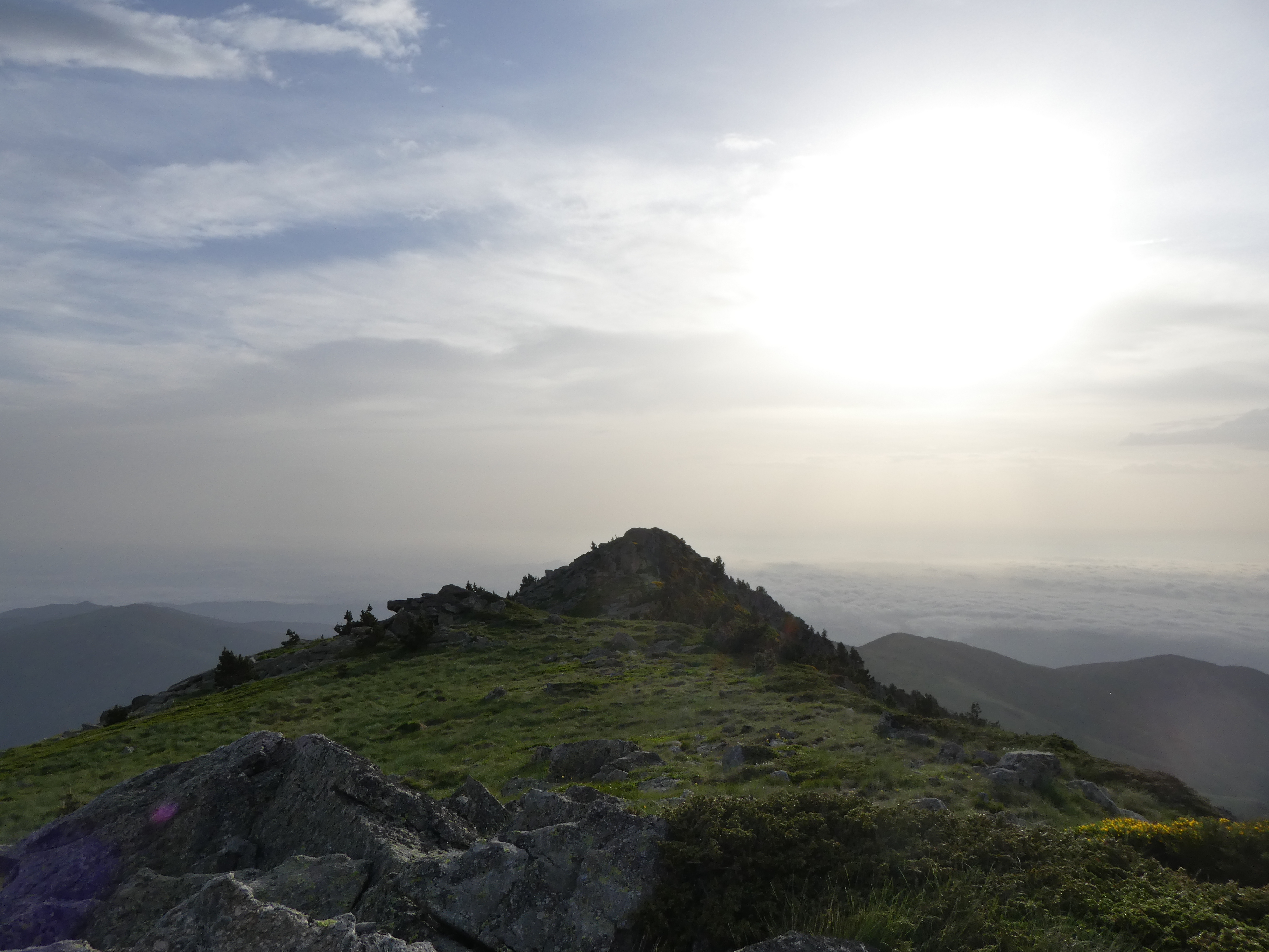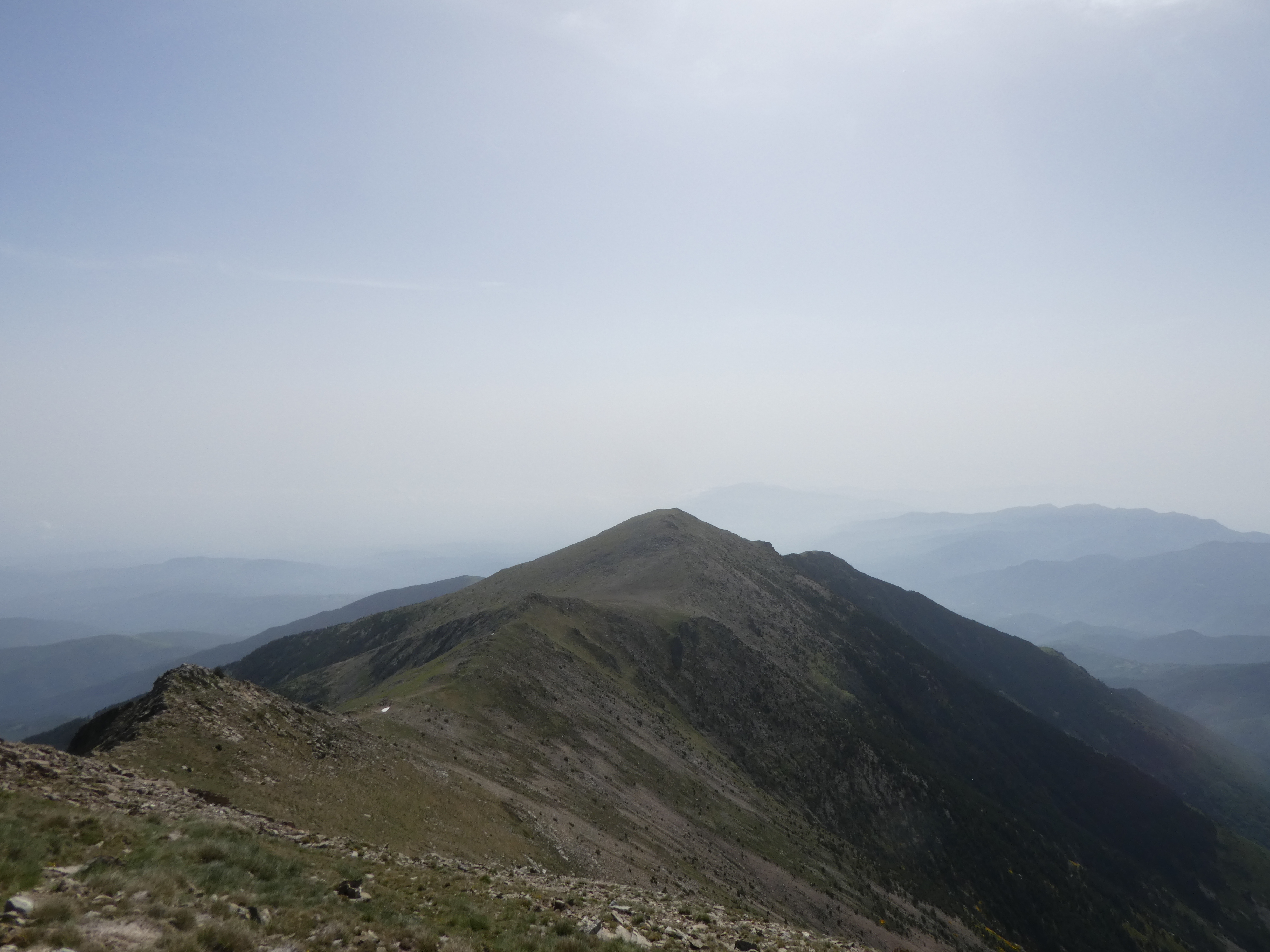 Arrivée au sommet du Puig de Pèl de Ça (2105 m) : beau panorama sur les sommets du Conflent, des Aspres, des Albères, du Vallespir ainsi que sur le massif du Pic Gallinàs malgré la présence de sable dans l'atmosphère