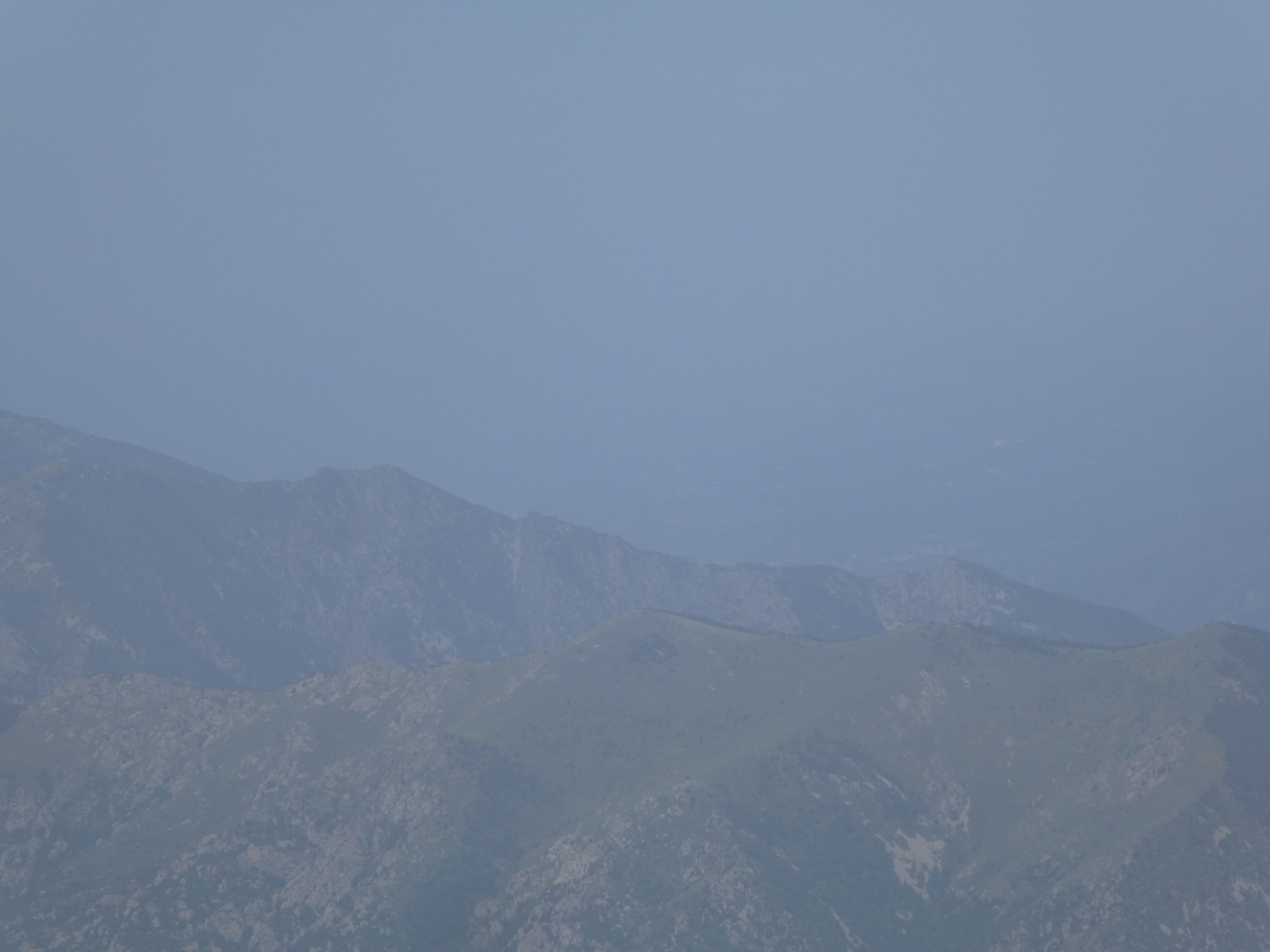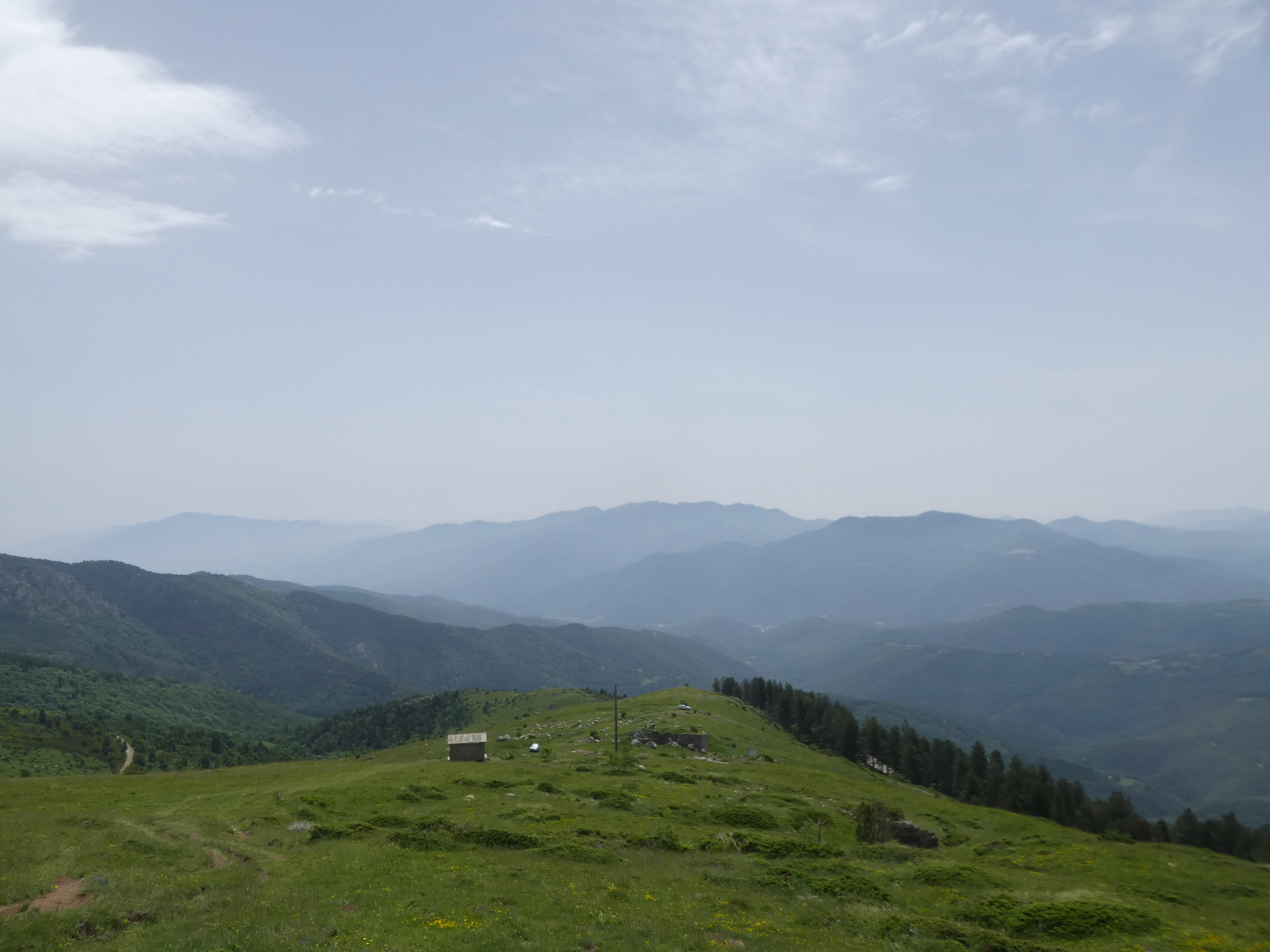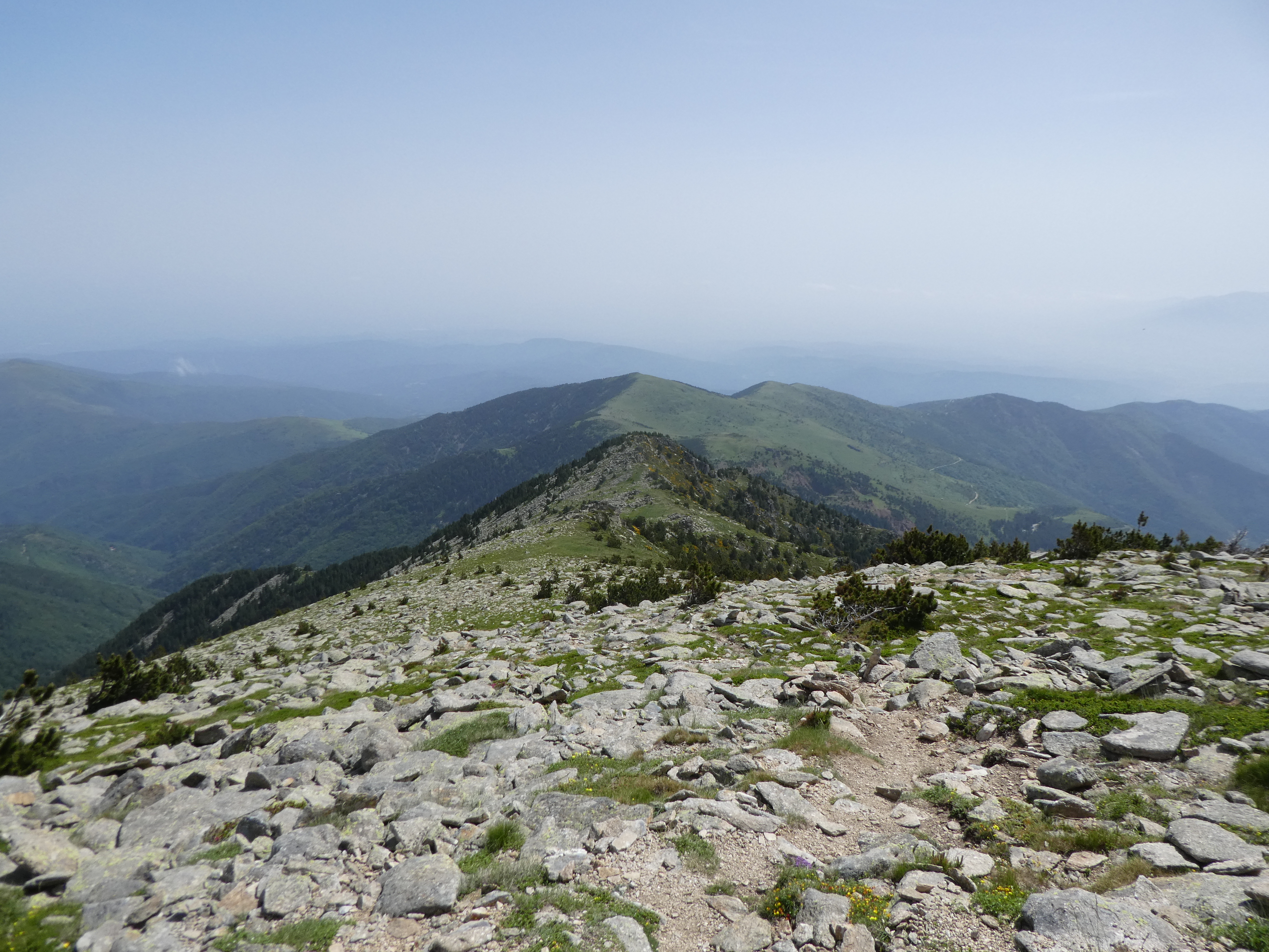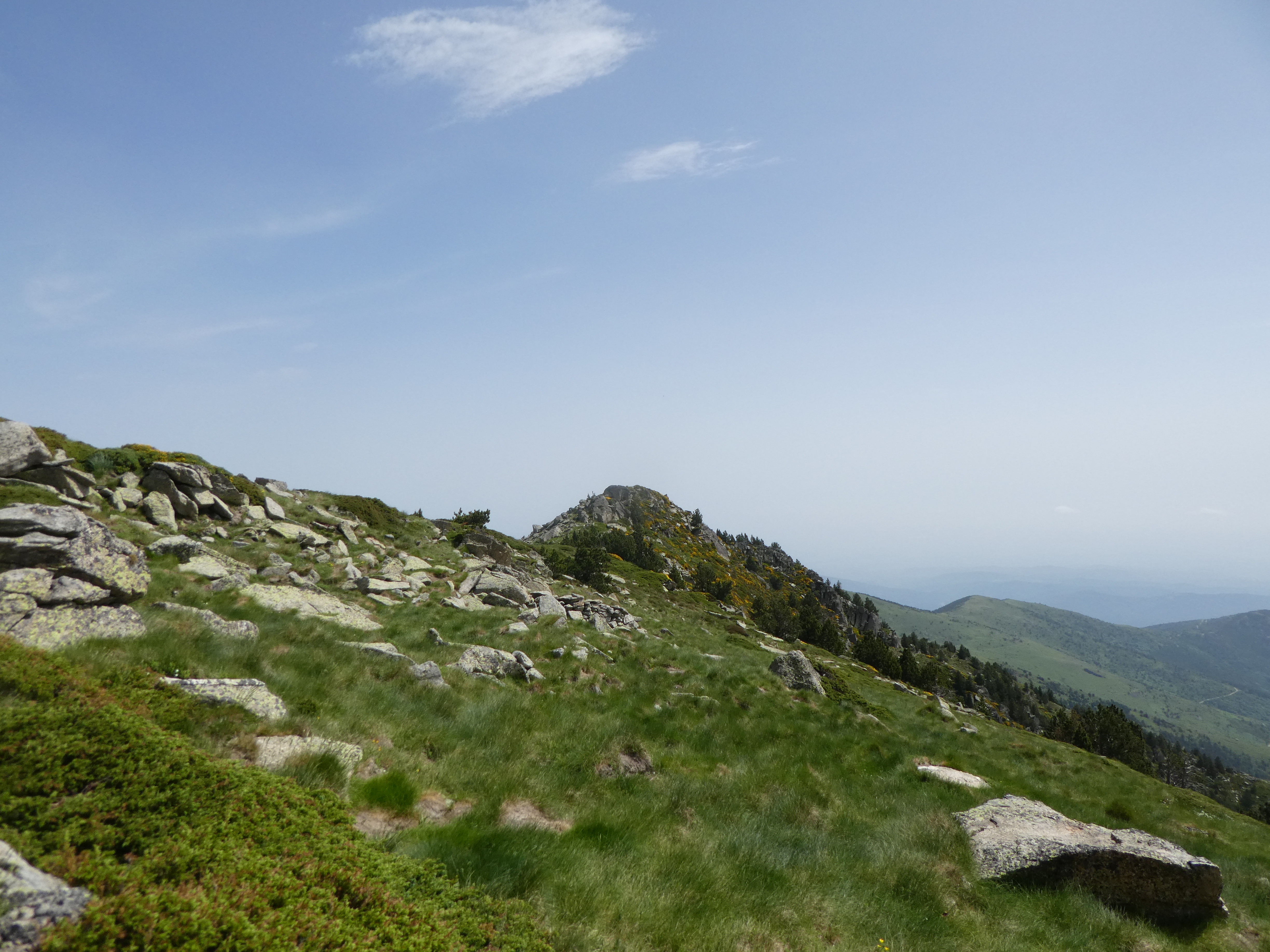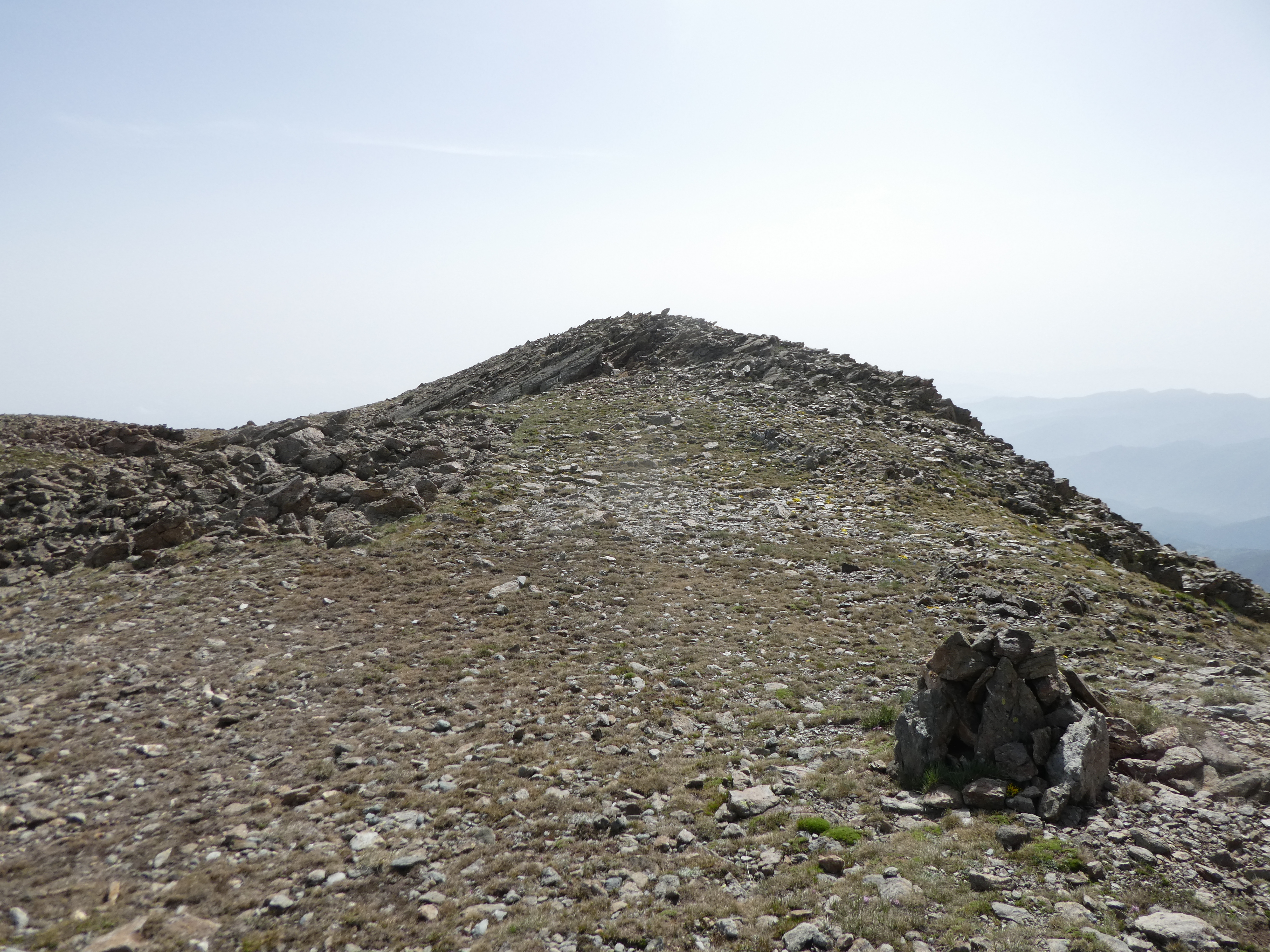 Arrivée au sommet du Puig de Pèl de Ça (2105 m) : beau panorama sur les sommets du Conflent, des Aspres, des Albères, du Vallespir ainsi que sur le massif du Pic Gallinàs malgré la présence de sable dans l'atmosphère
