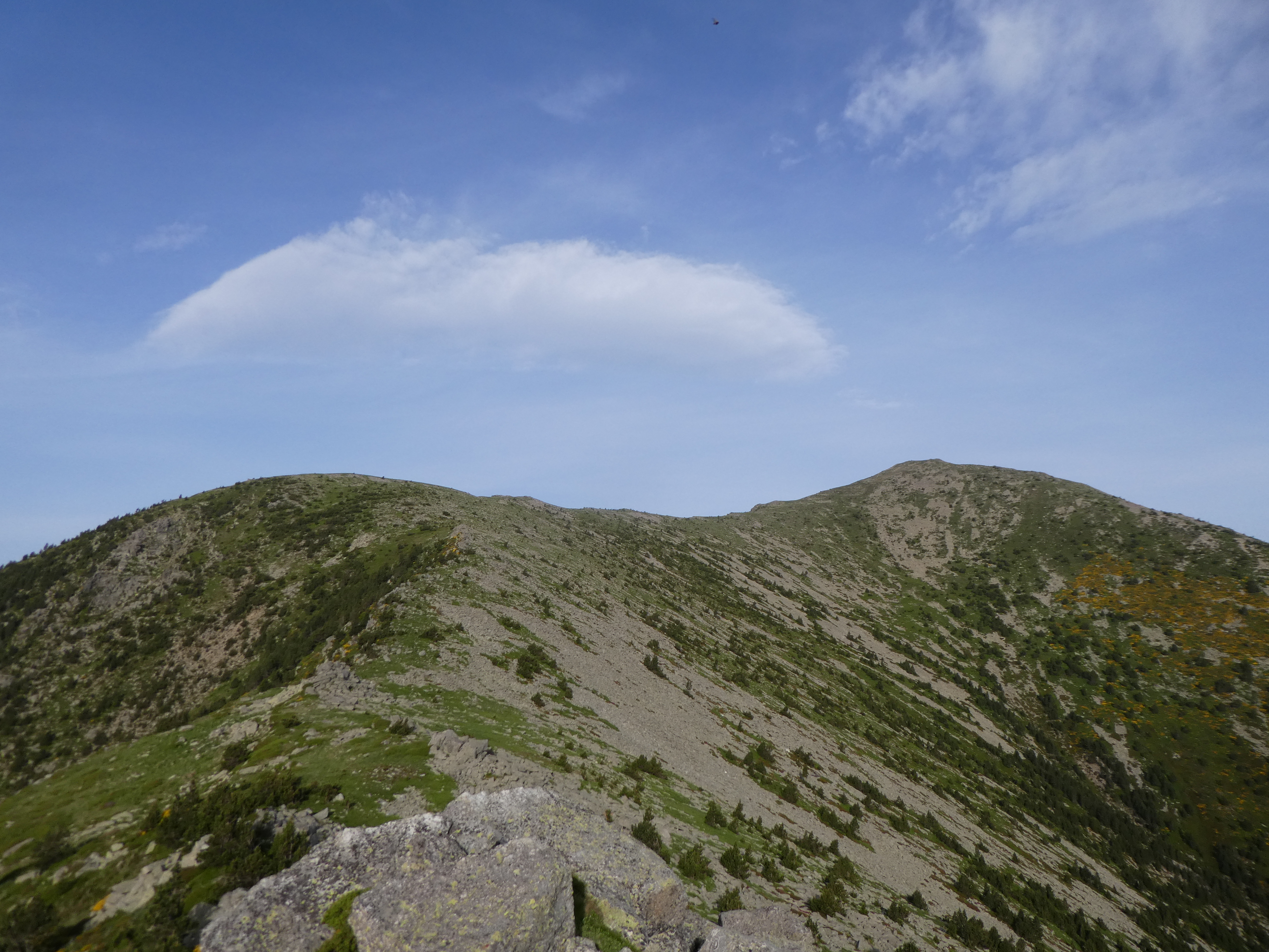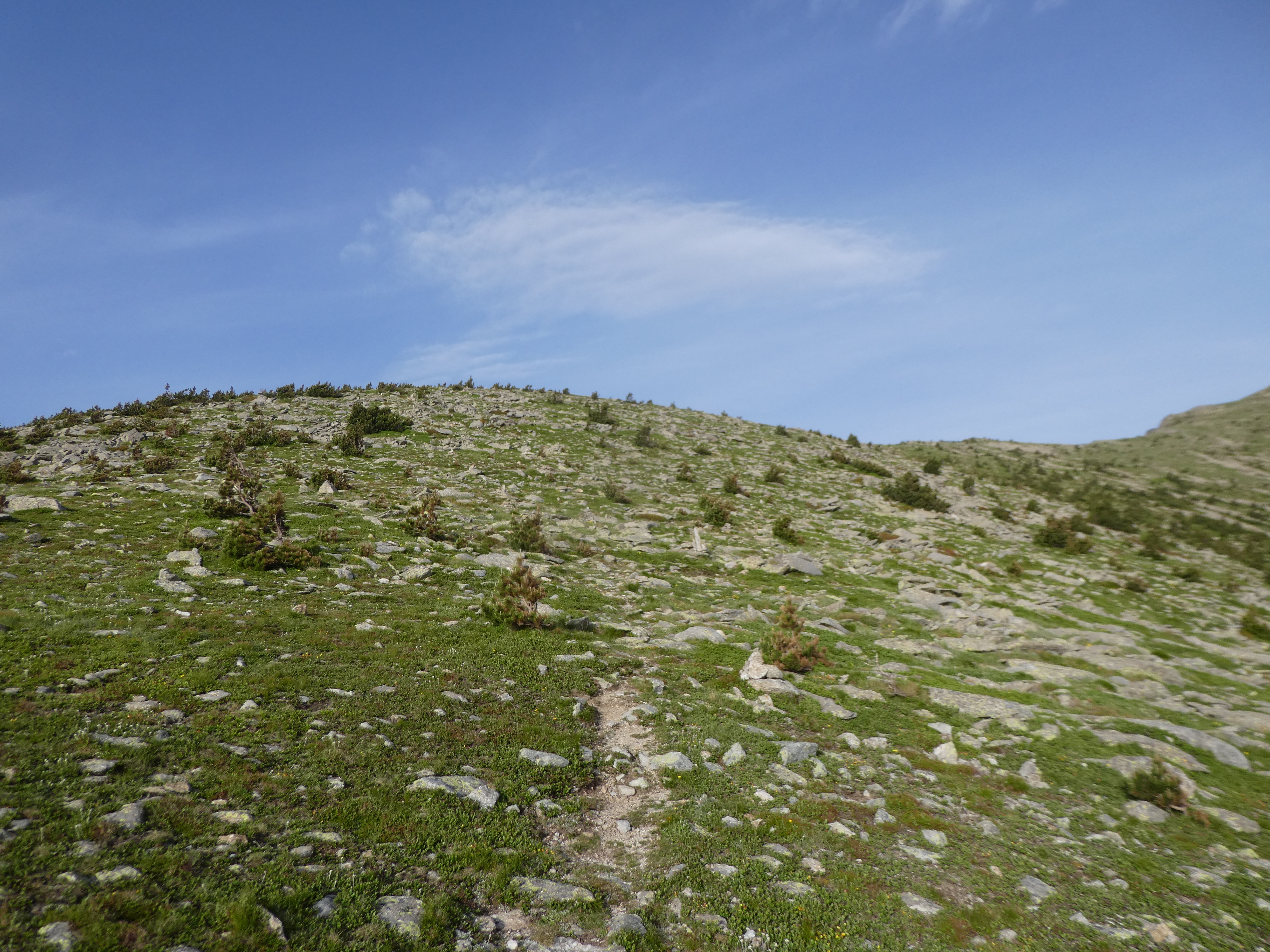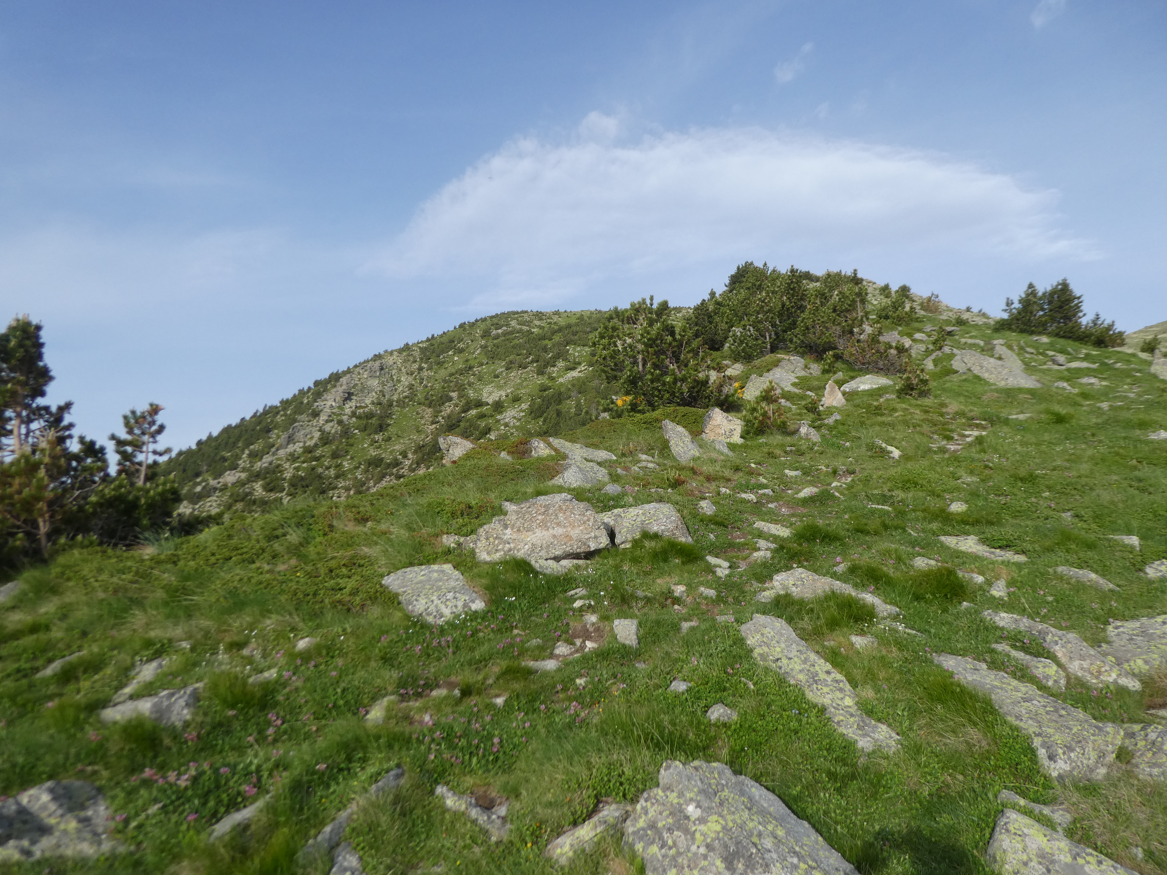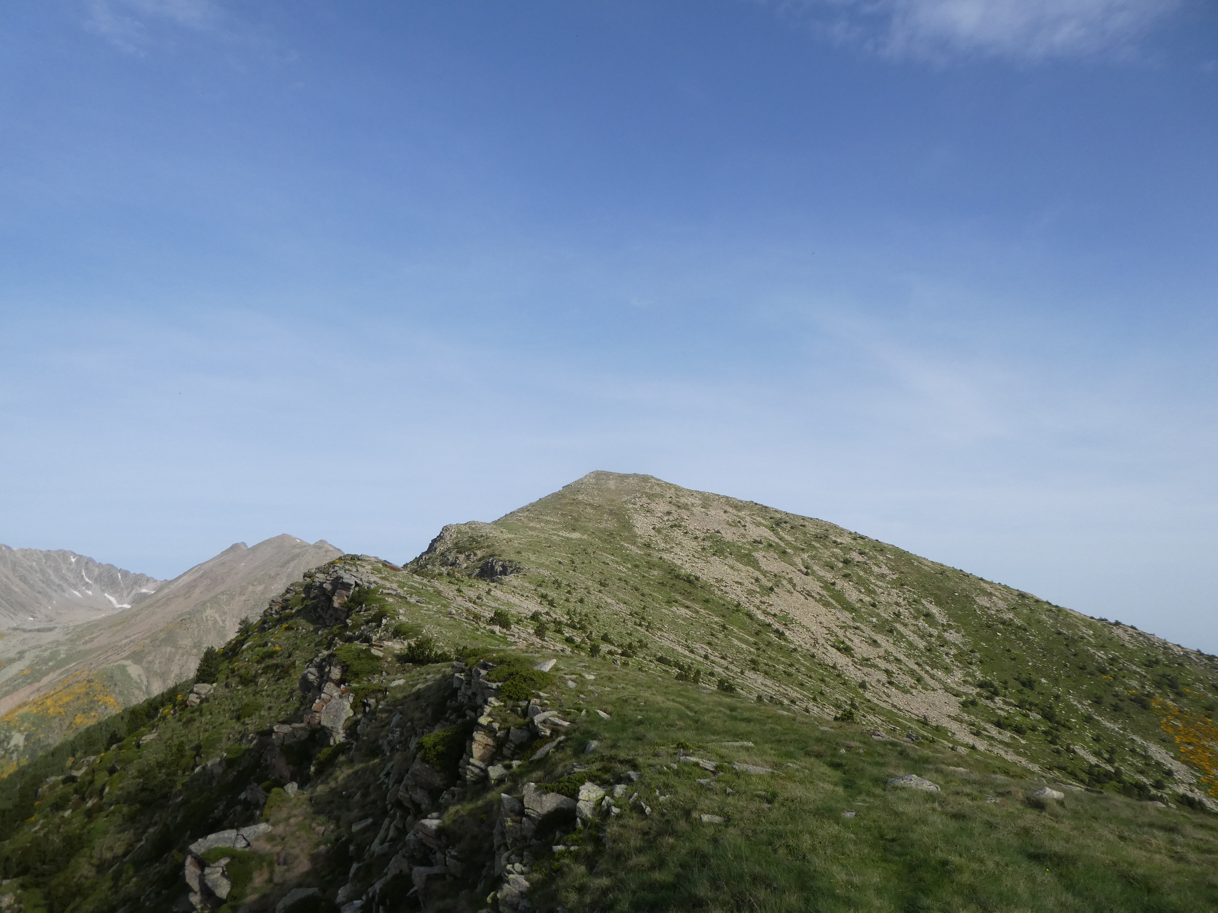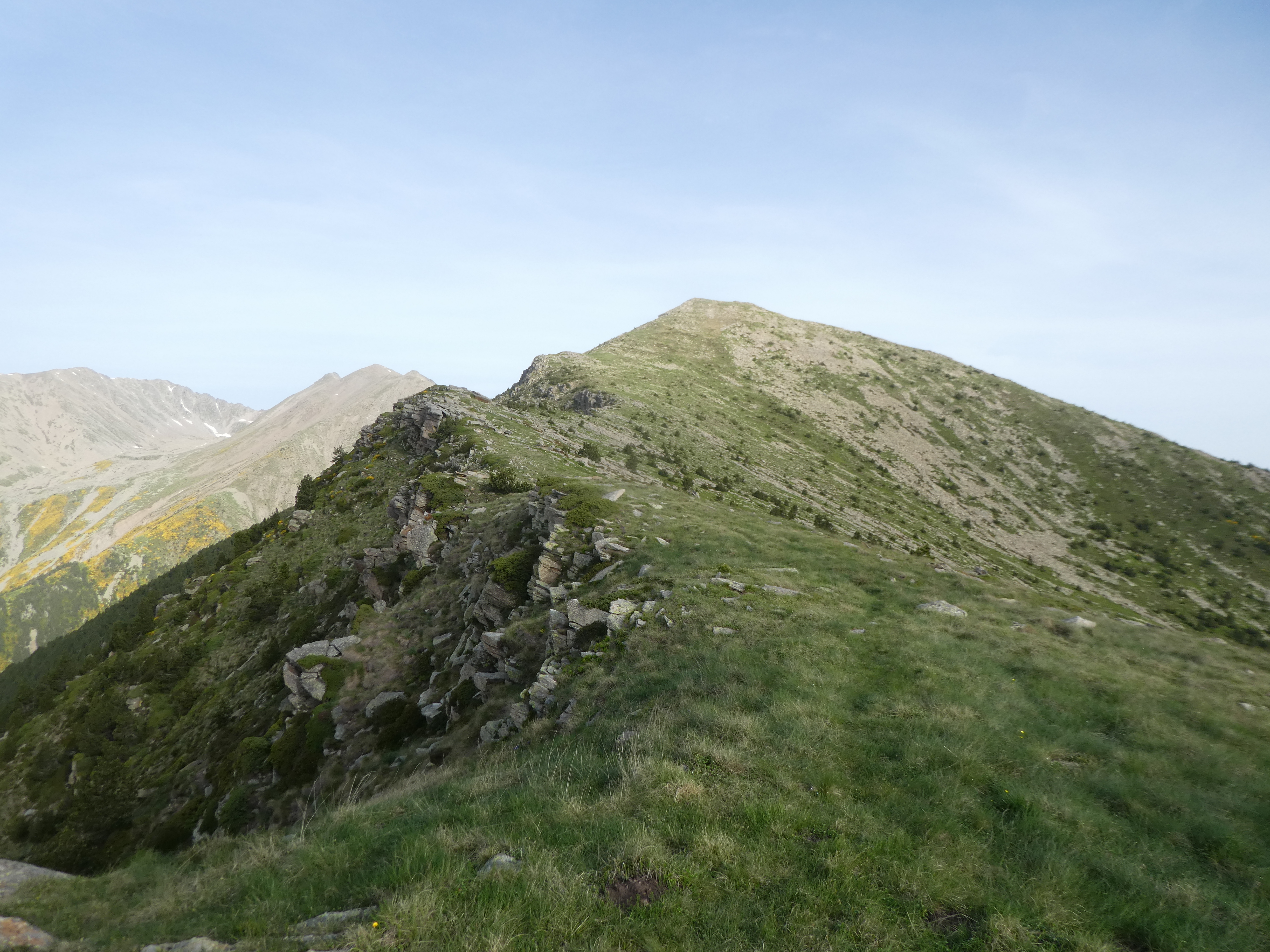 Pla de les Eugues (2371 m) : continuer à suivre le chemin de crête partant tout droit direction Puig del Roc Negre (portions de montée raide jusqu'au Puig del Roc Negre)