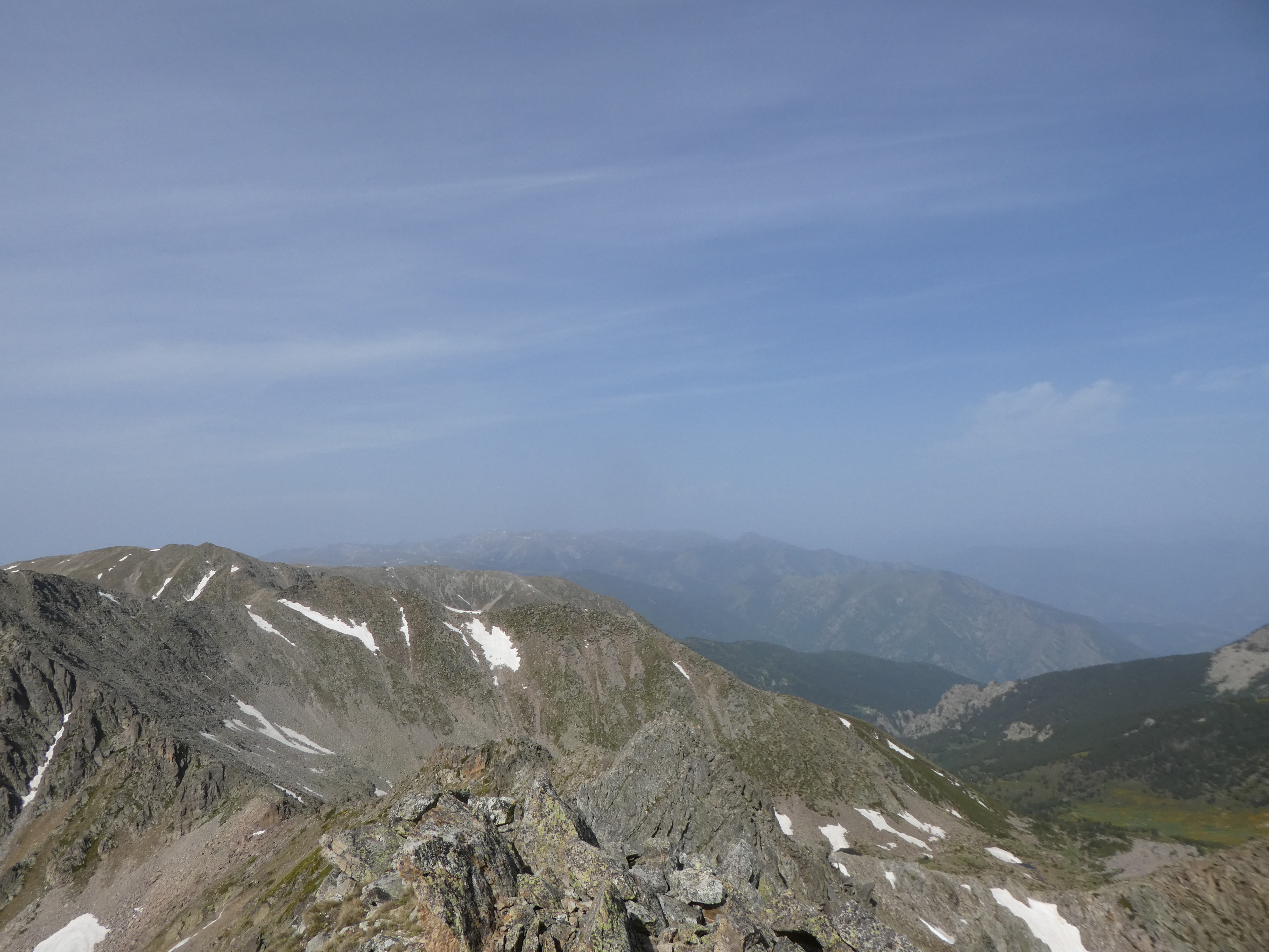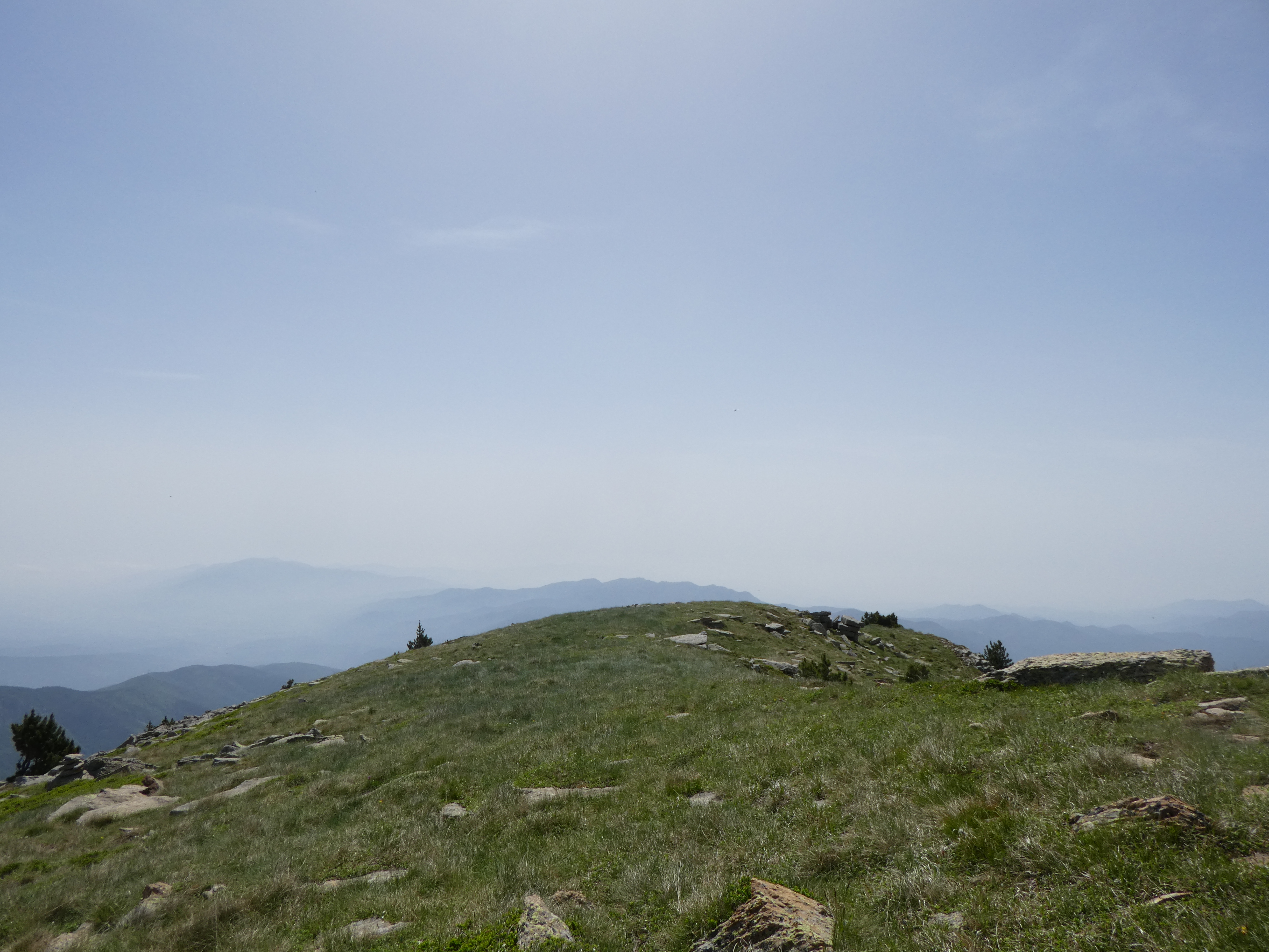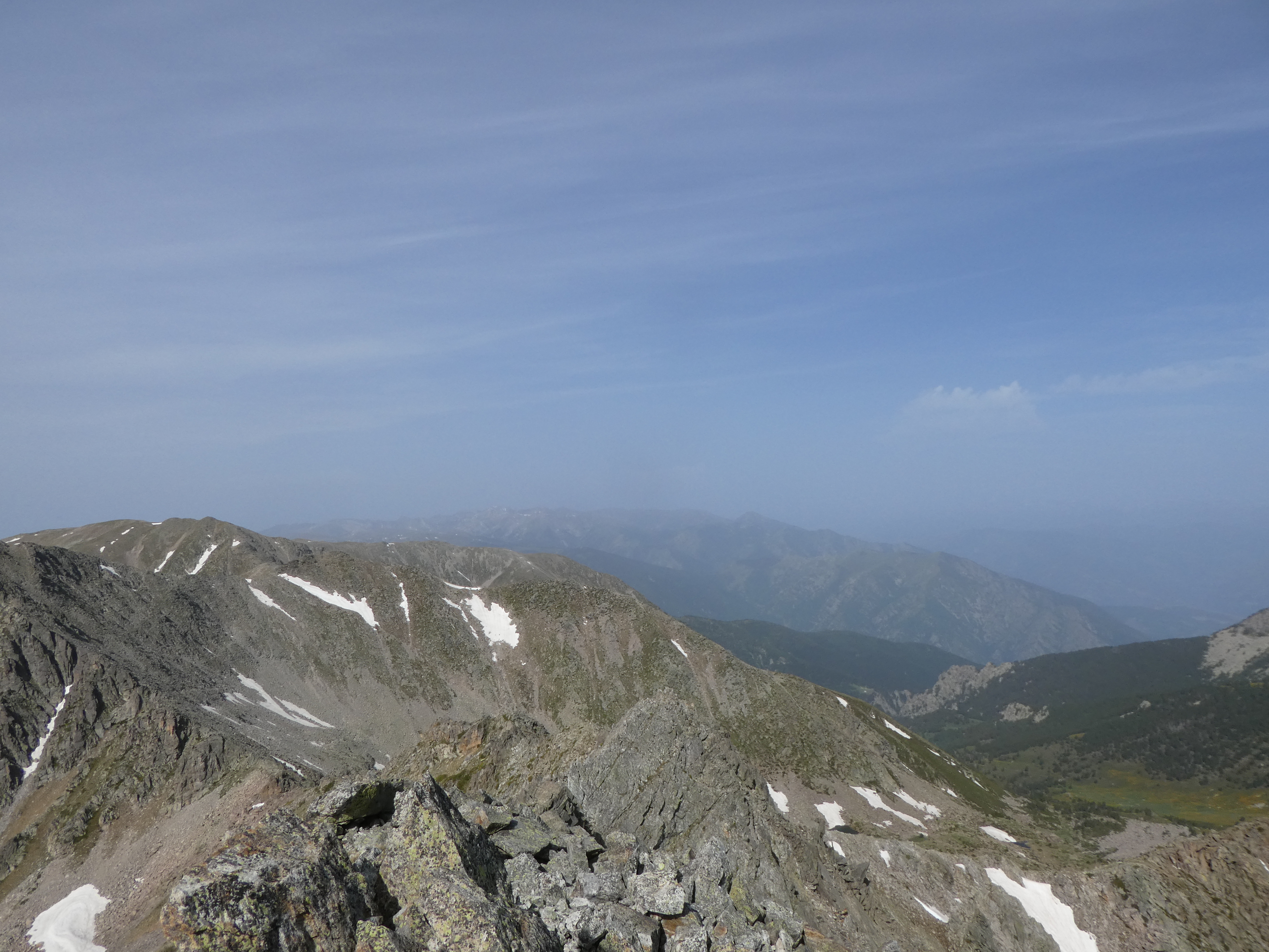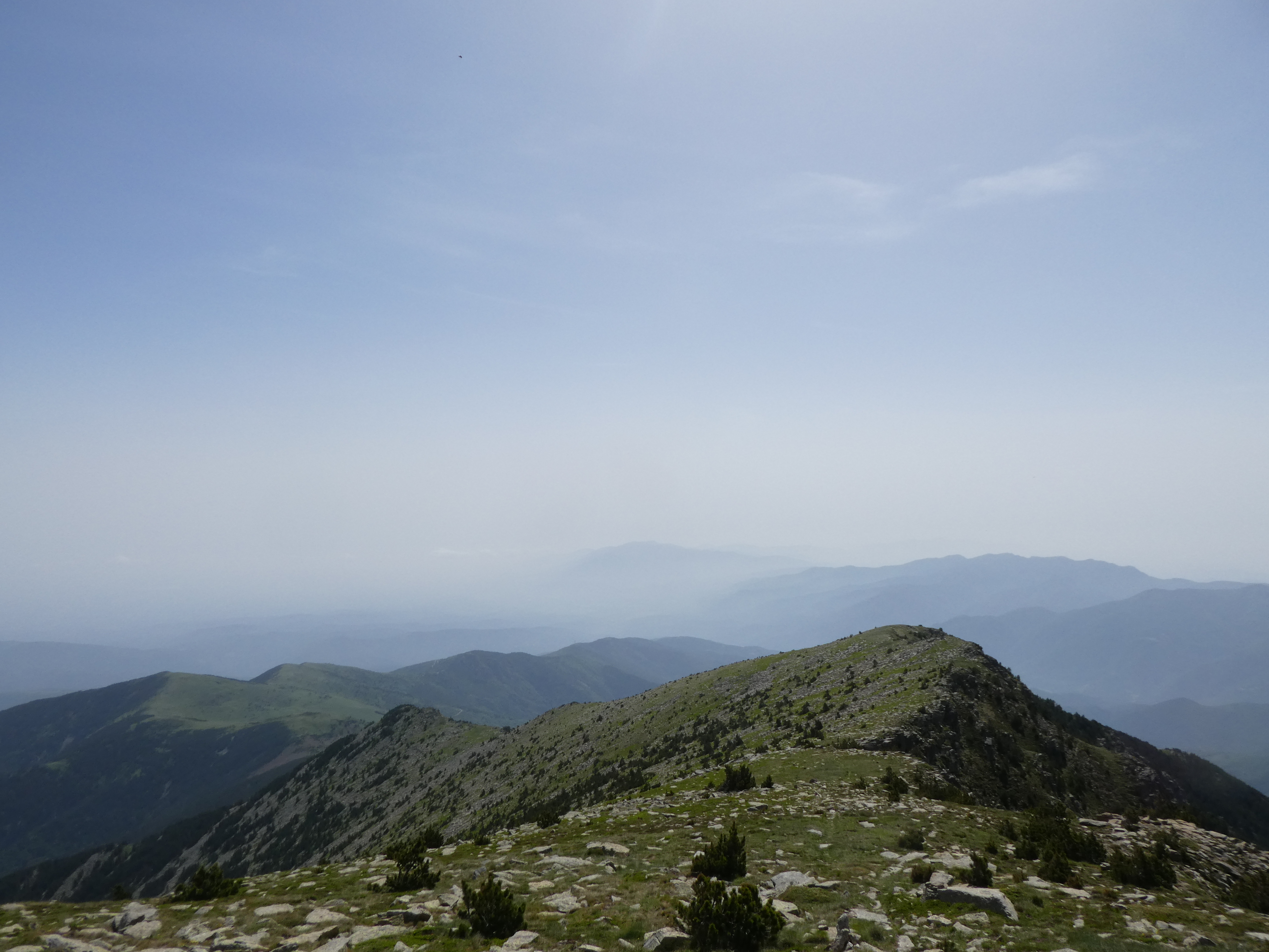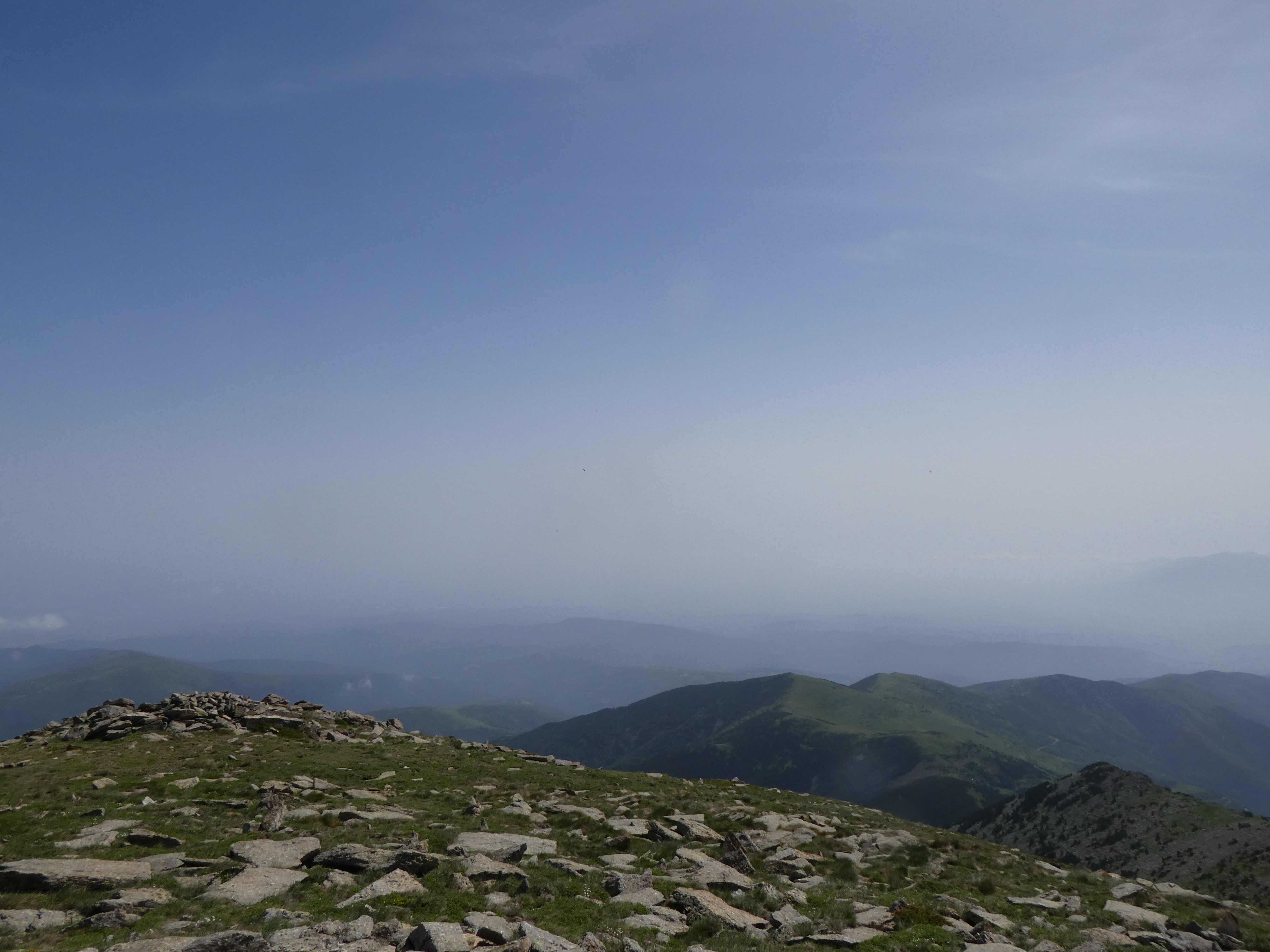 Arrivée au sommet du Puig del Roc Negre (2714 m) : beau panorama malgré la présence de sable dans l'atmosphère sur les sommets du Vallespir, du Ripollès, du massif du Canigou et du Conflent
