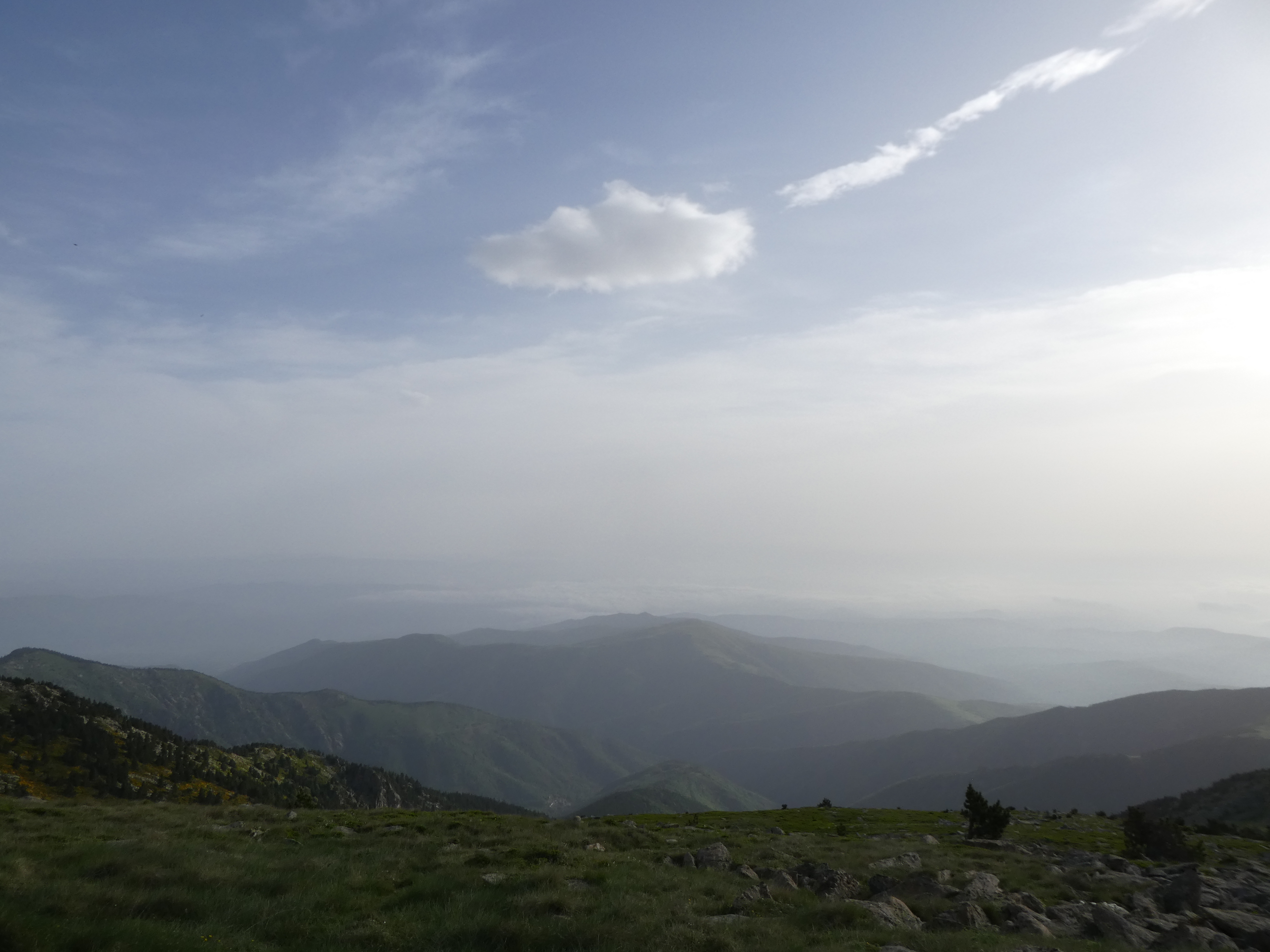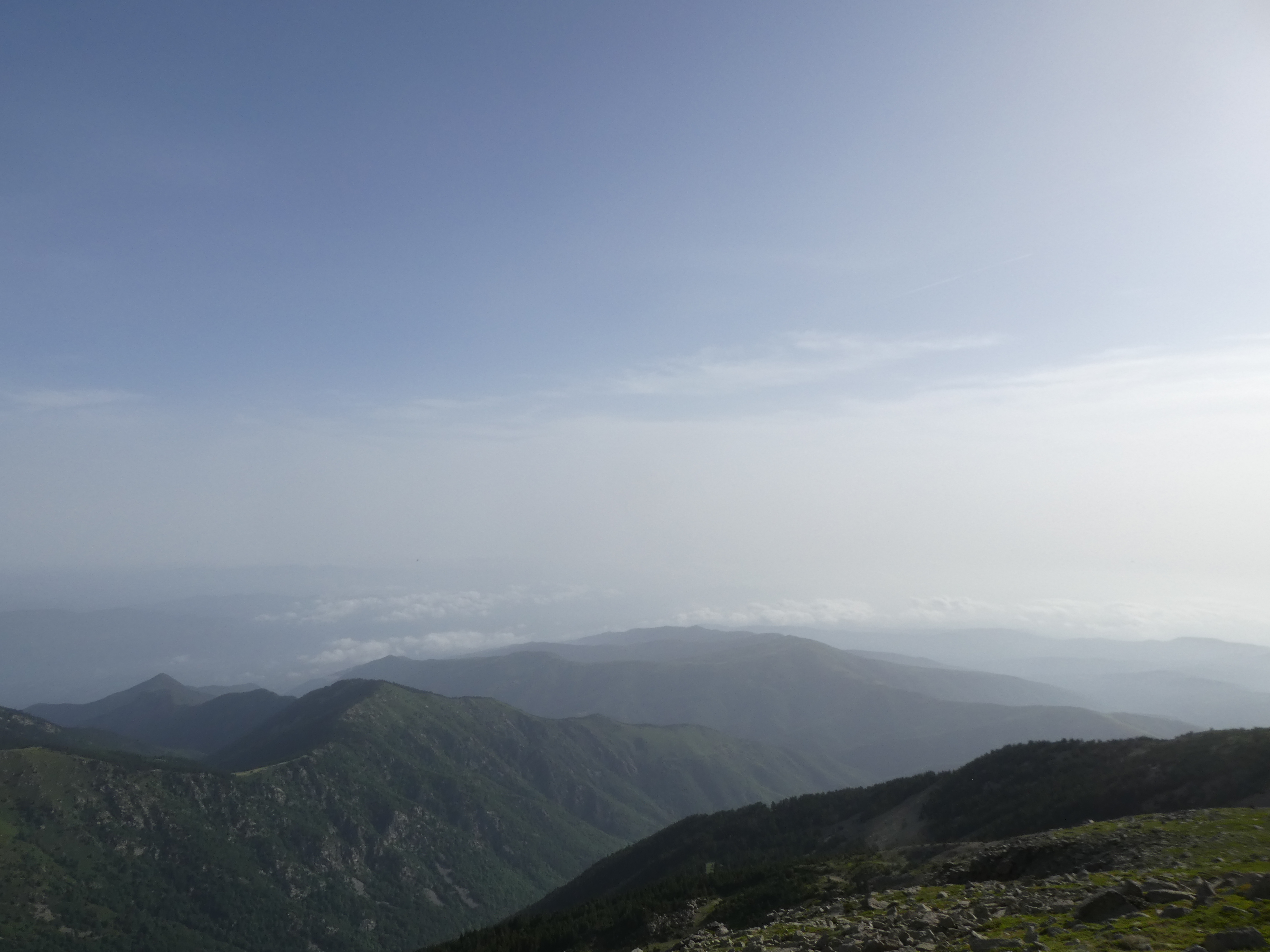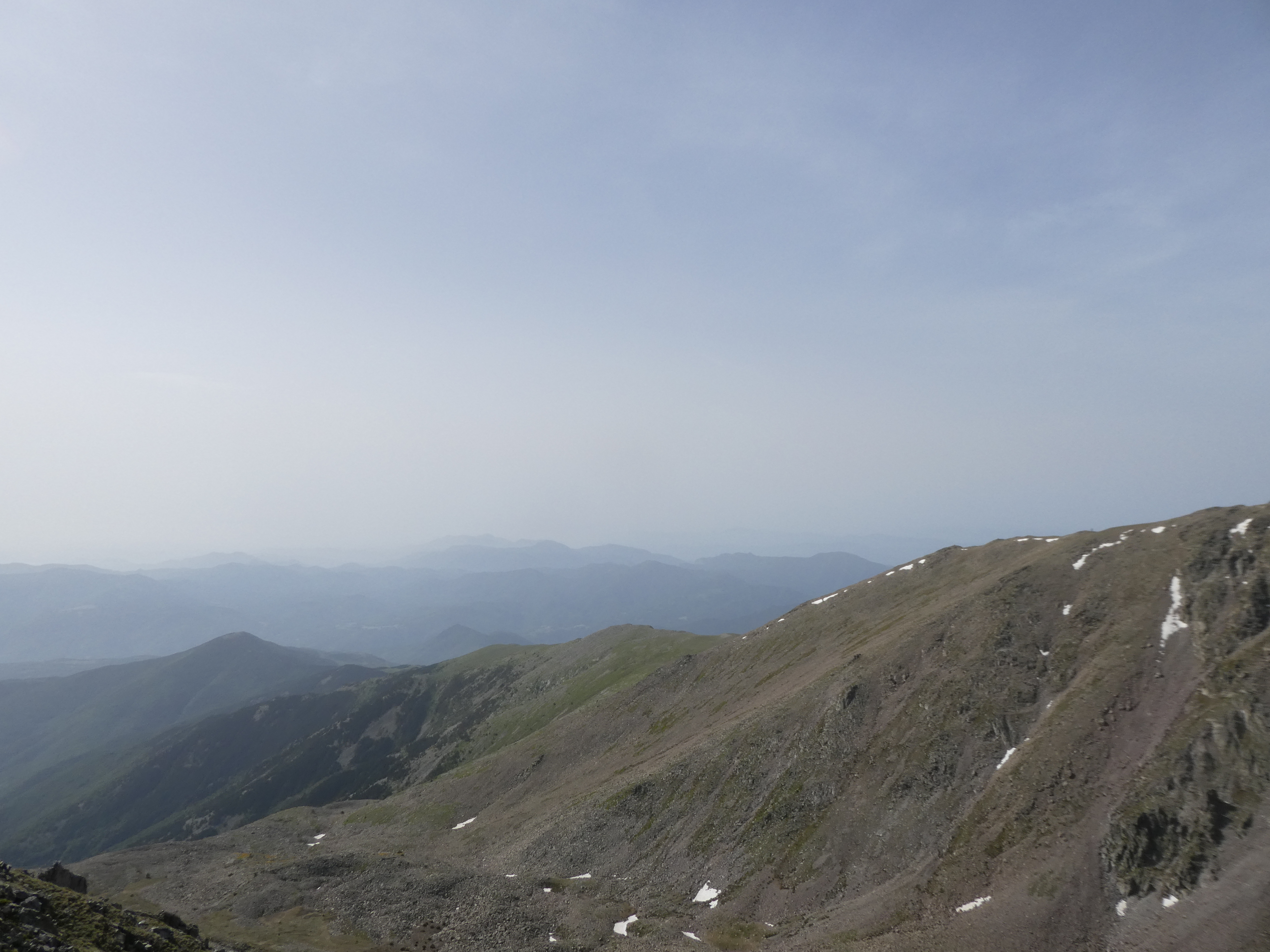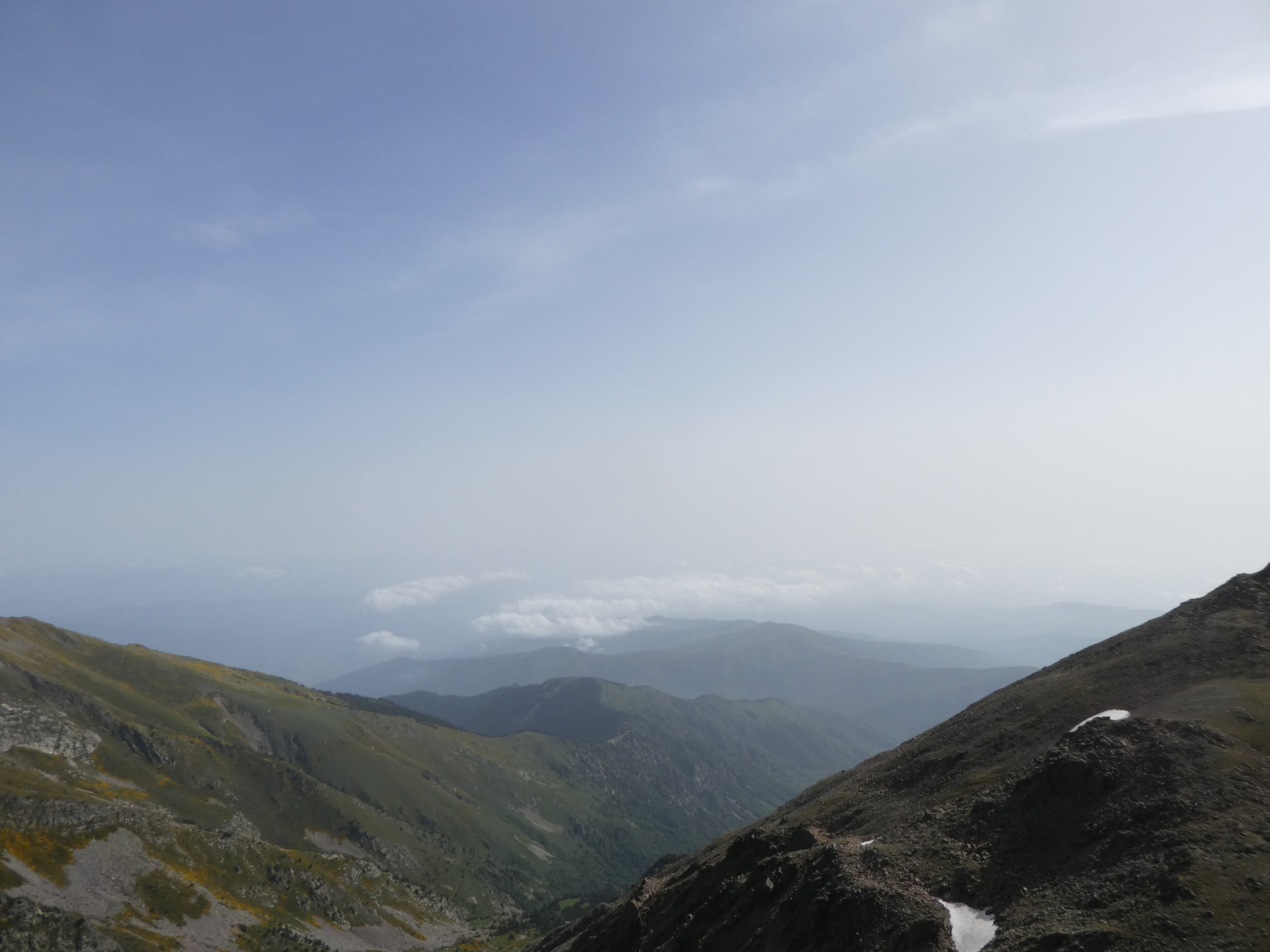 Arrivée au sommet du Puig del Roc Negre (2714 m) : beau panorama malgré la présence de sable dans l'atmosphère sur les sommets du Vallespir, du Ripollès, du massif du Canigou et du Conflent