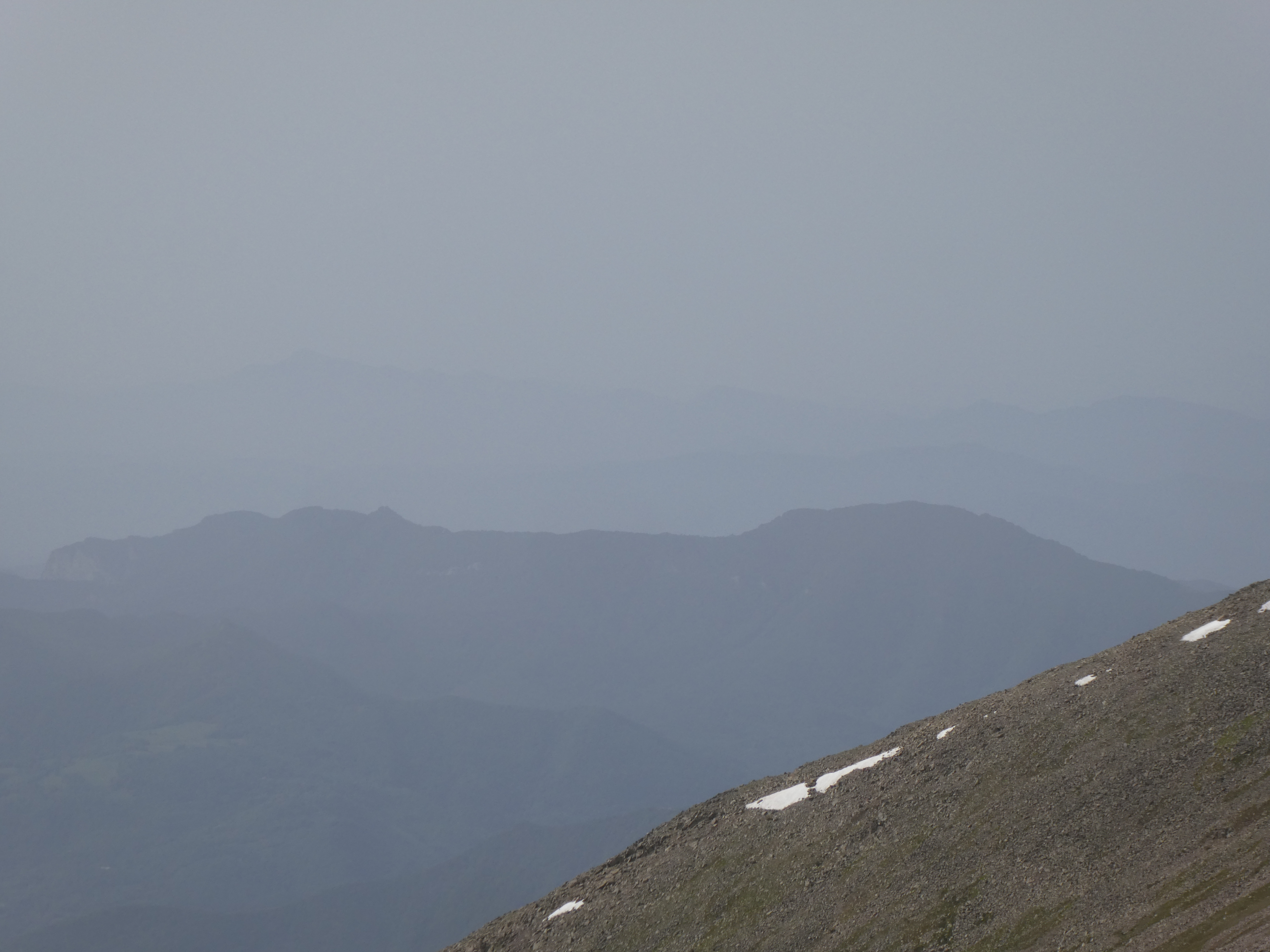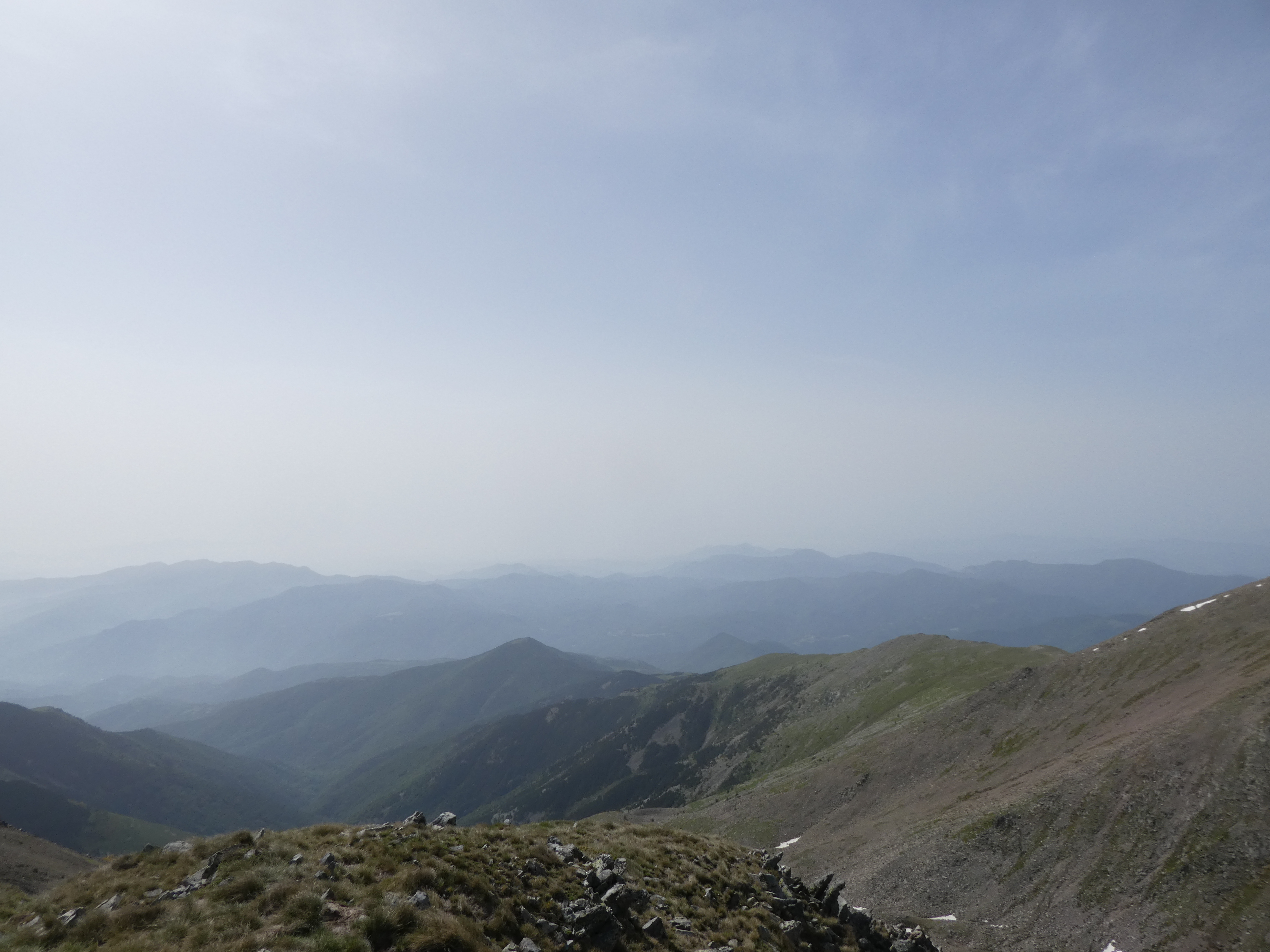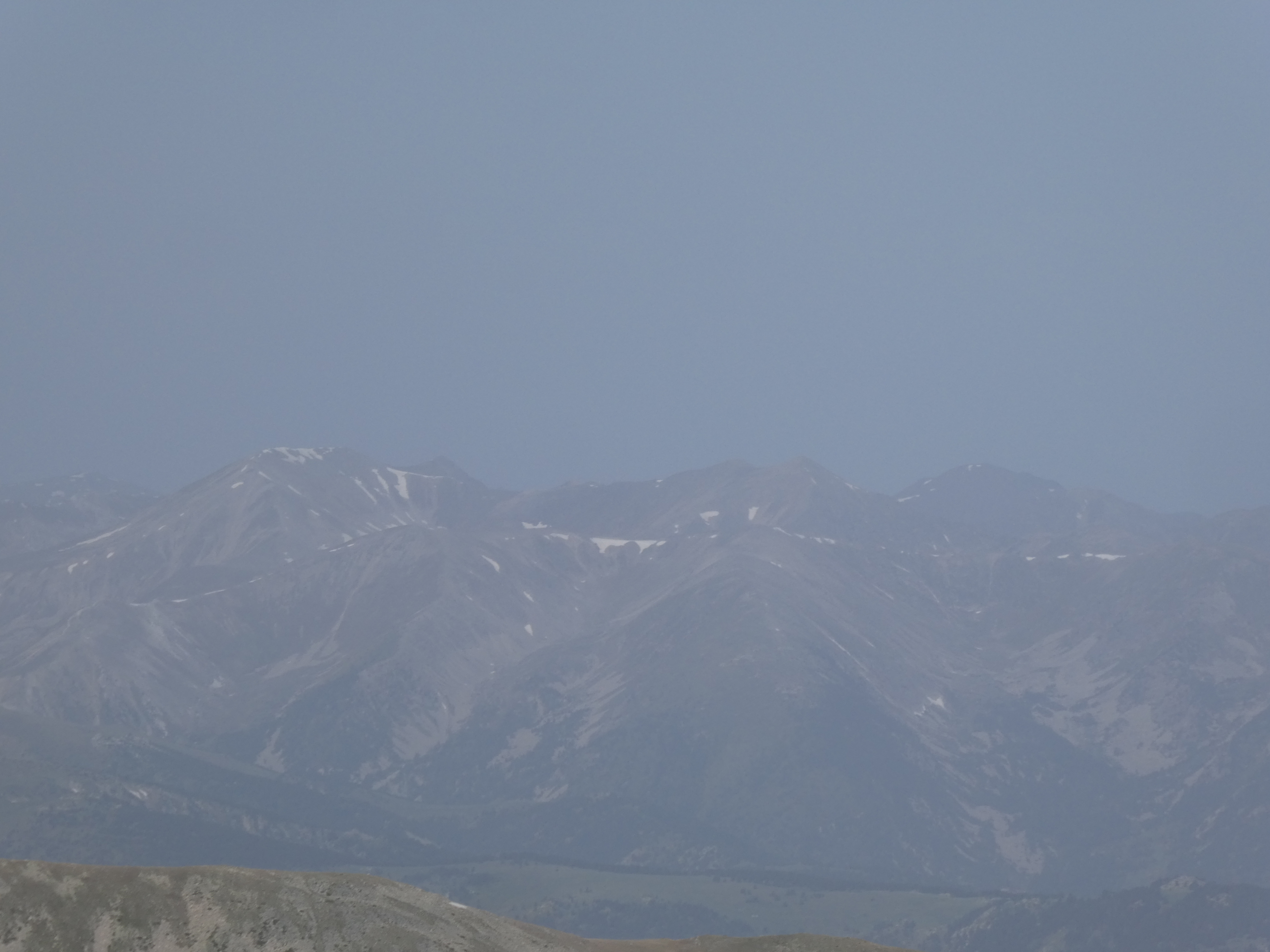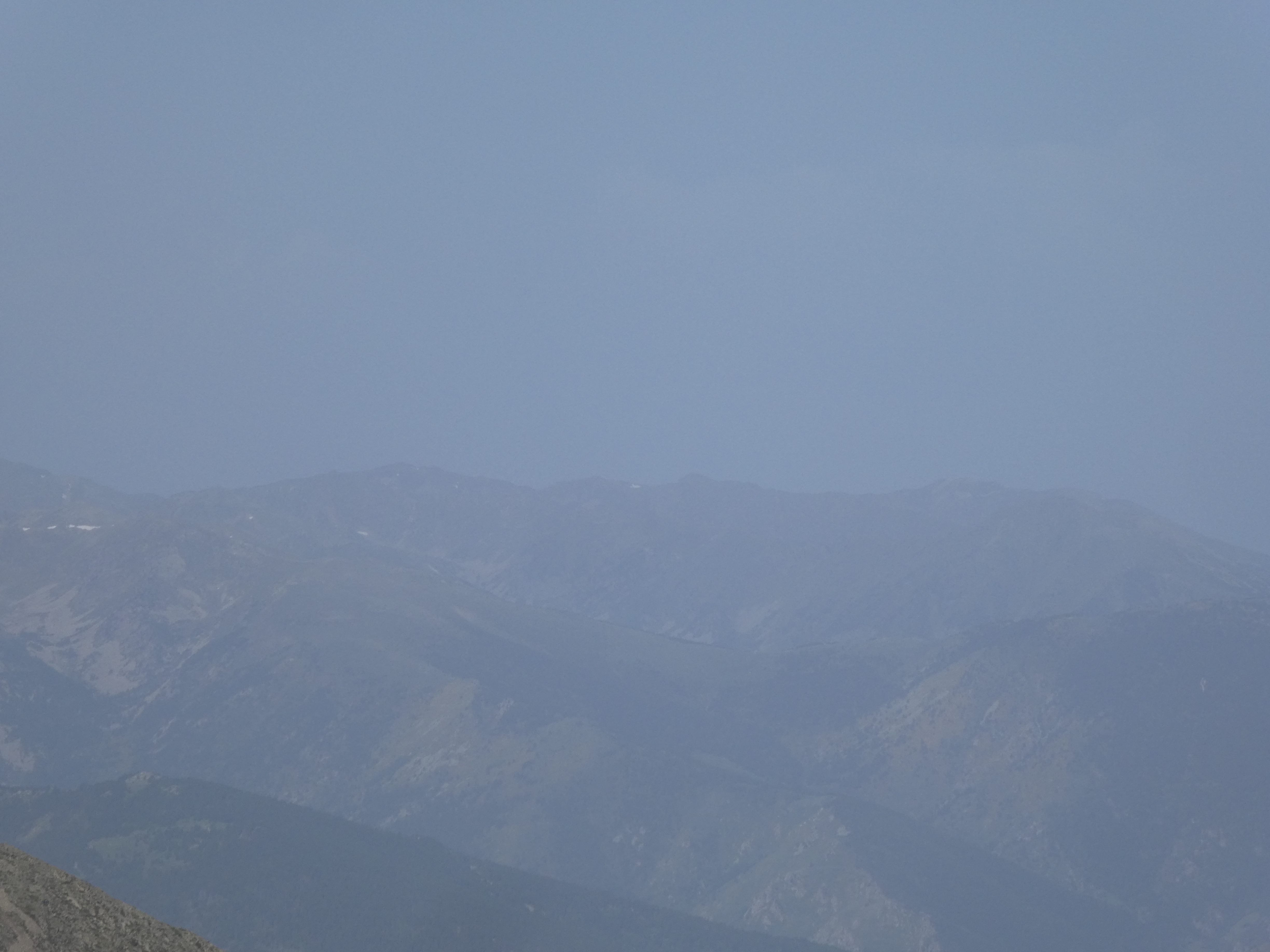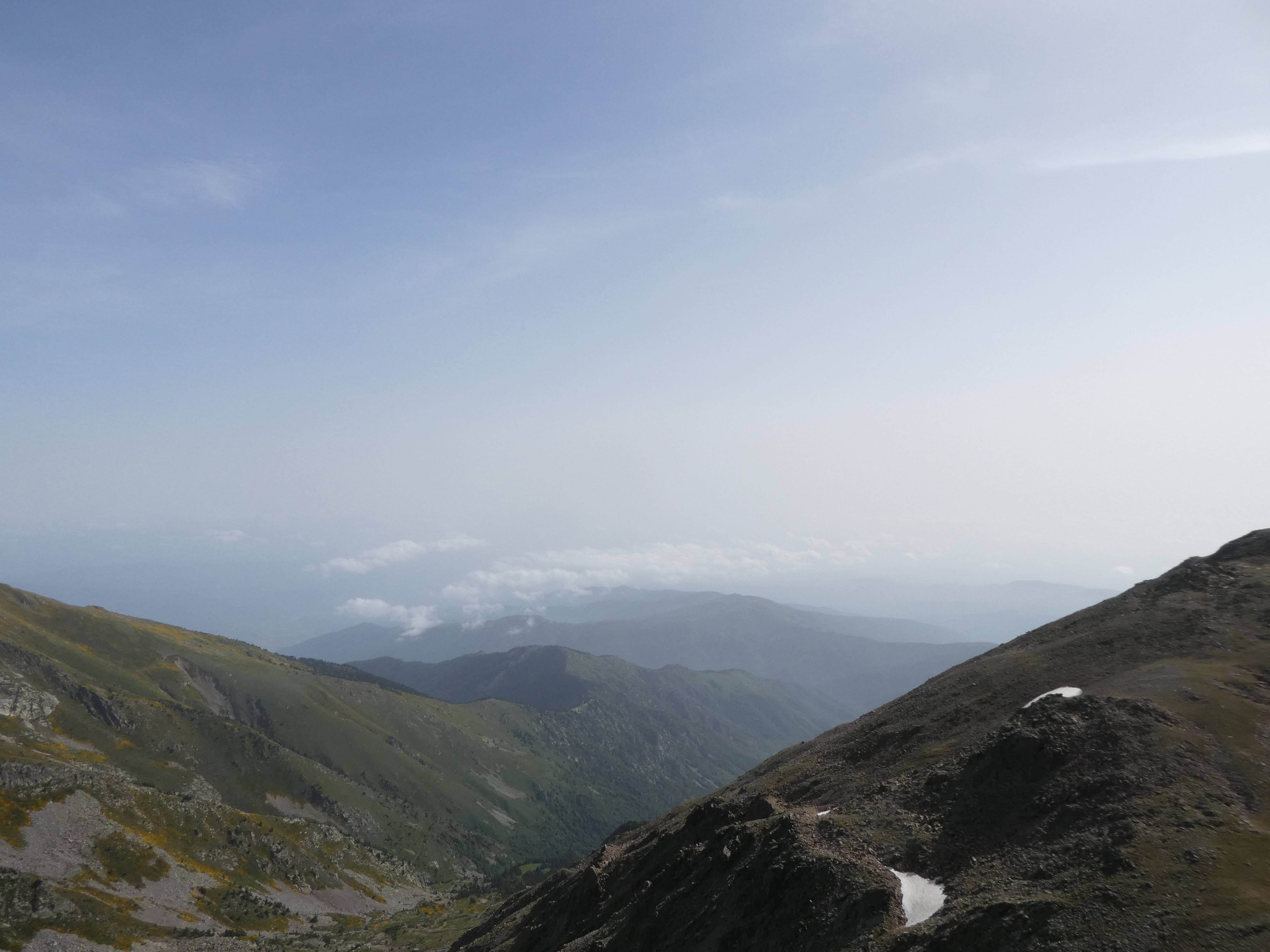 Arrivée au sommet du Puig del Roc Negre (2714 m) : beau panorama malgré la présence de sable dans l'atmosphère sur les sommets du Vallespir, du Ripollès, du massif du Canigou et du Conflent