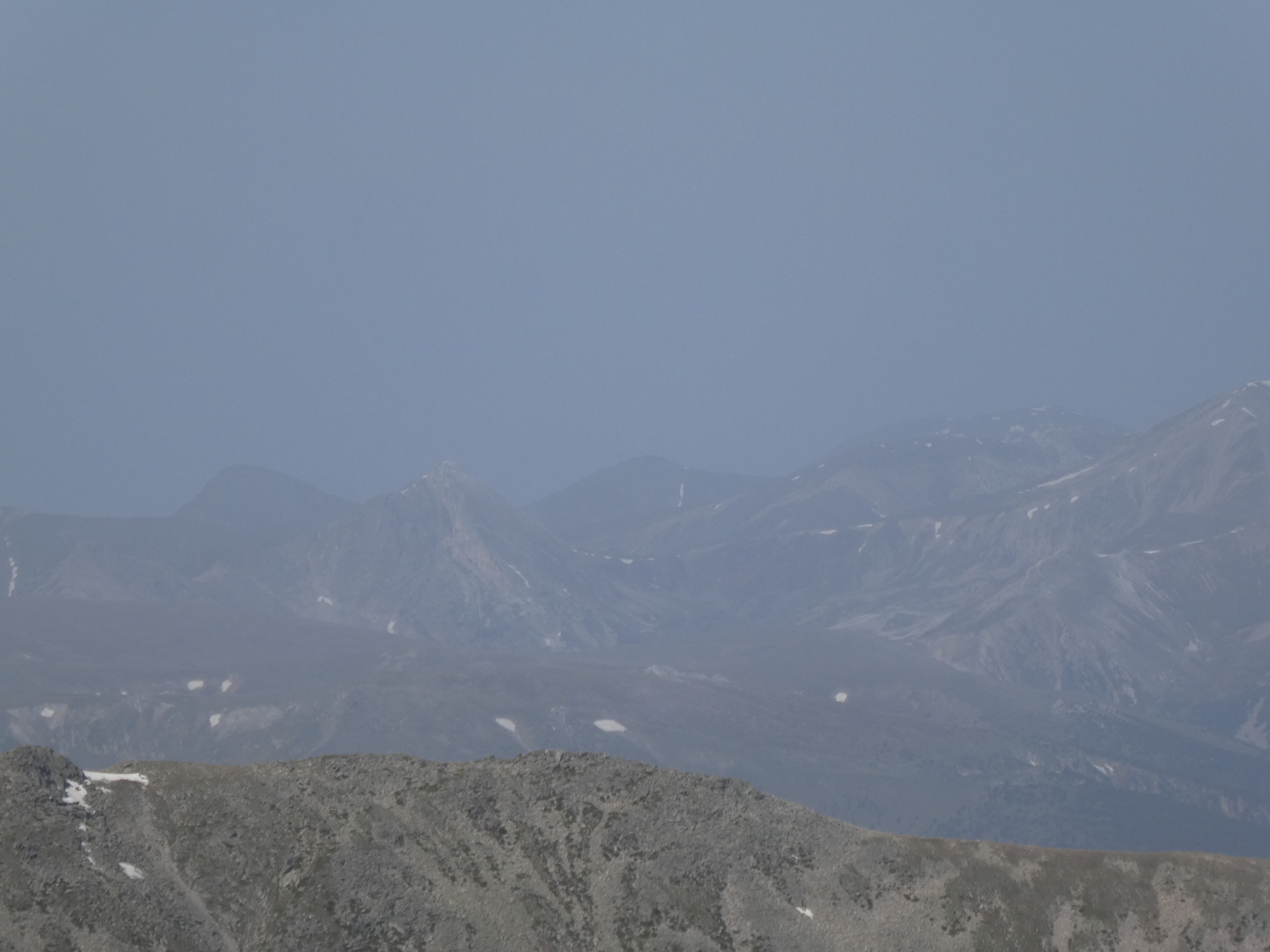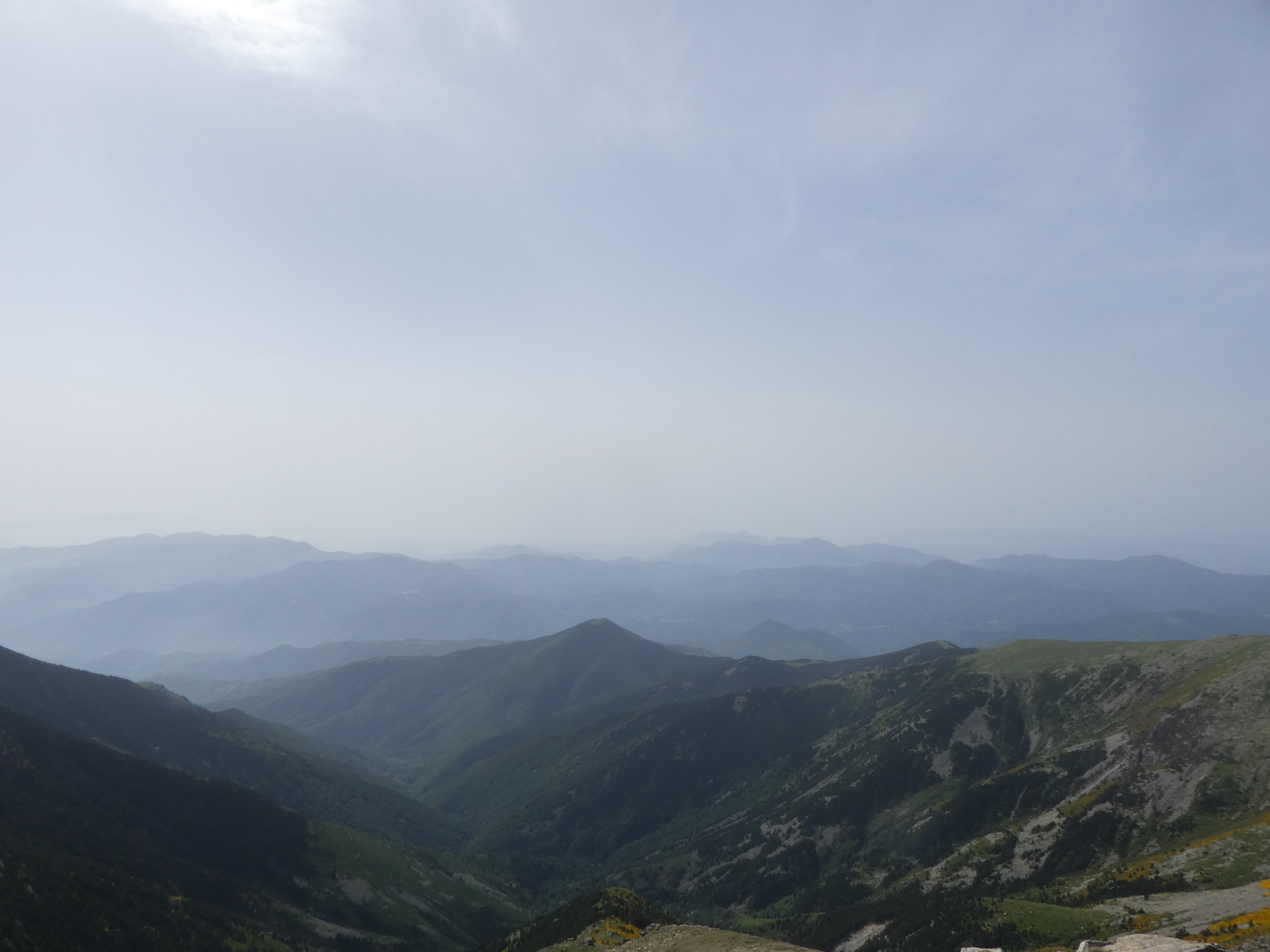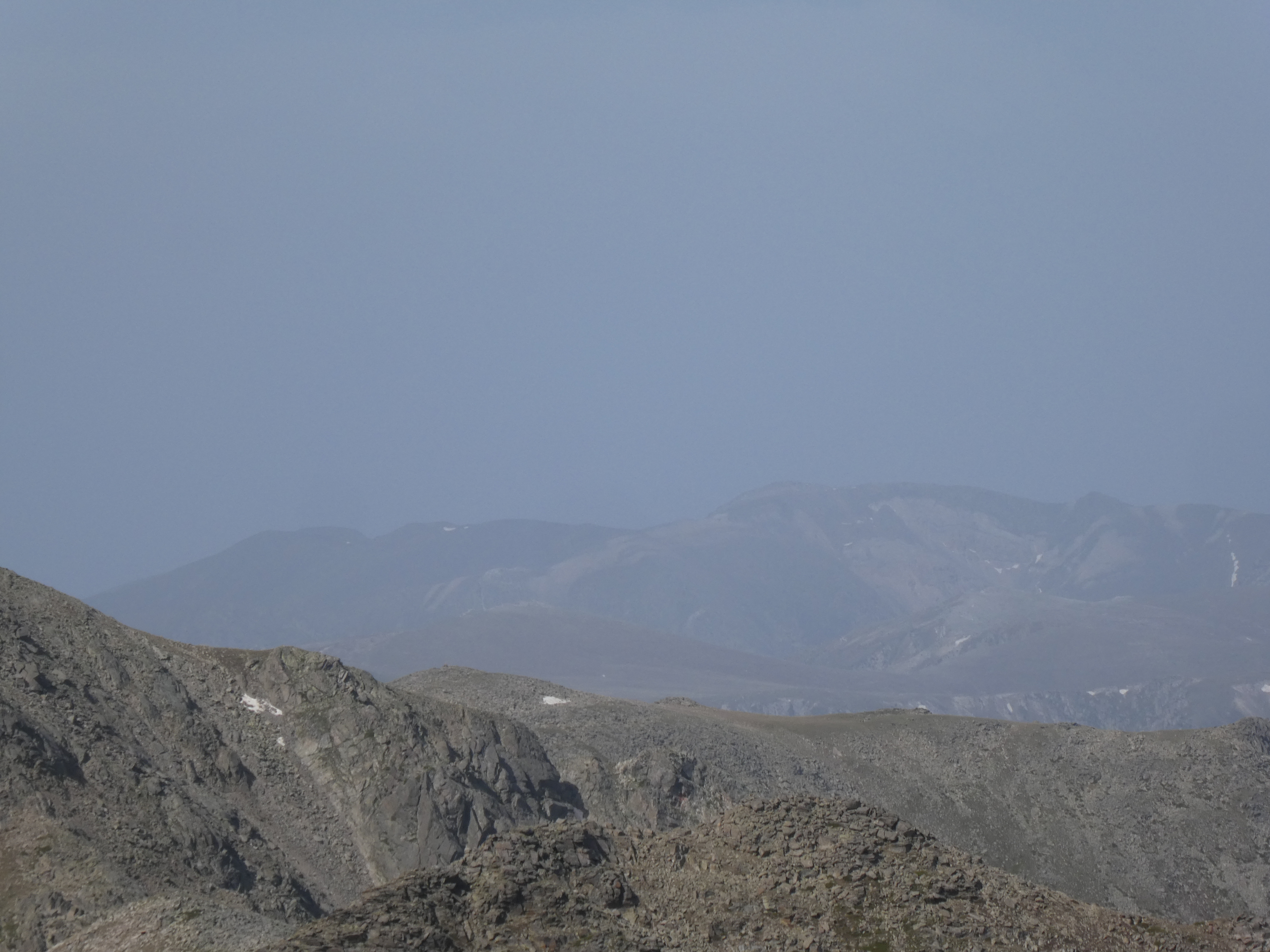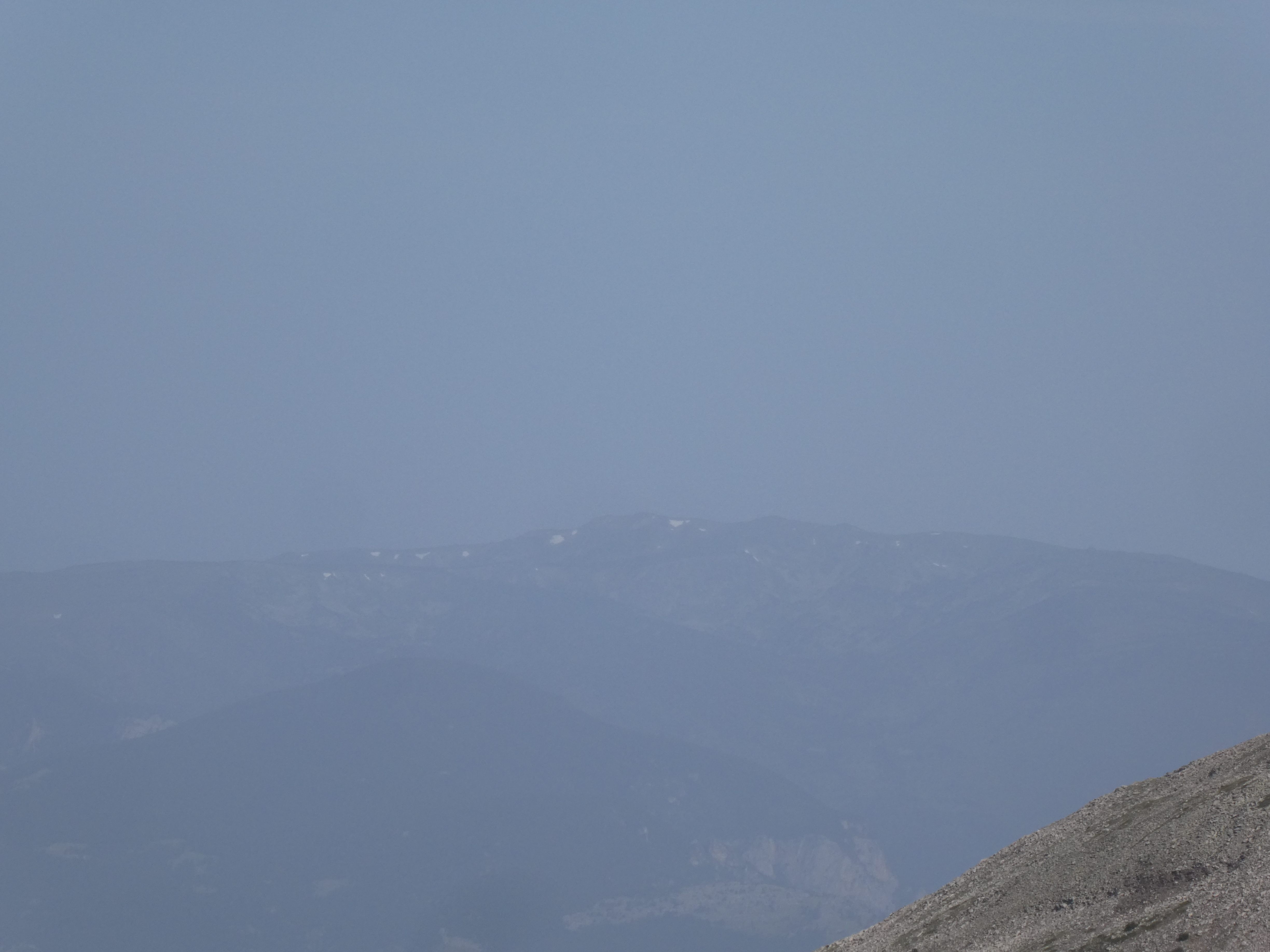 Arrivée au sommet du Puig del Roc Negre (2714 m) : beau panorama malgré la présence de sable dans l'atmosphère sur les sommets du Vallespir, du Ripollès, du massif du Canigou et du Conflent