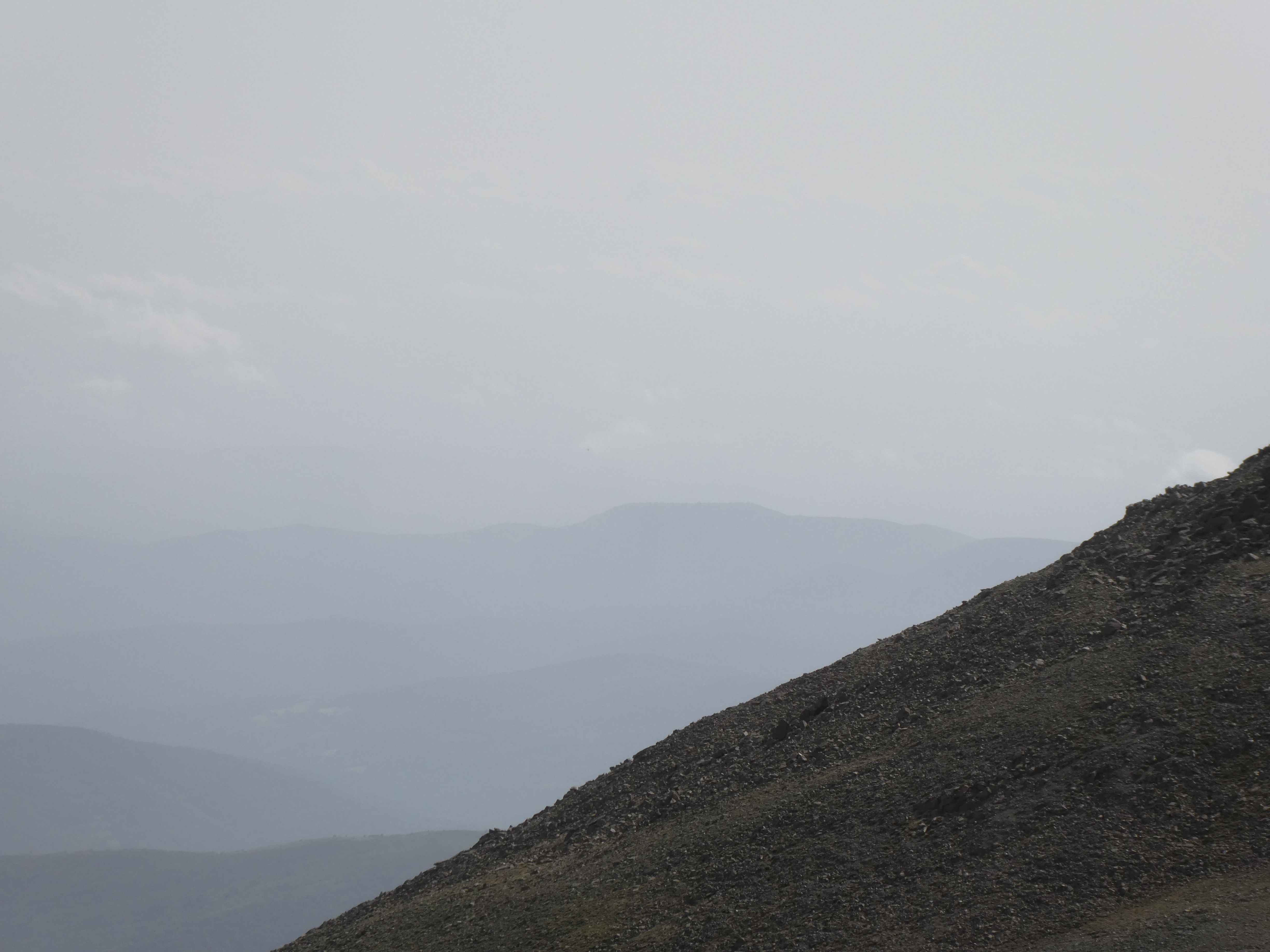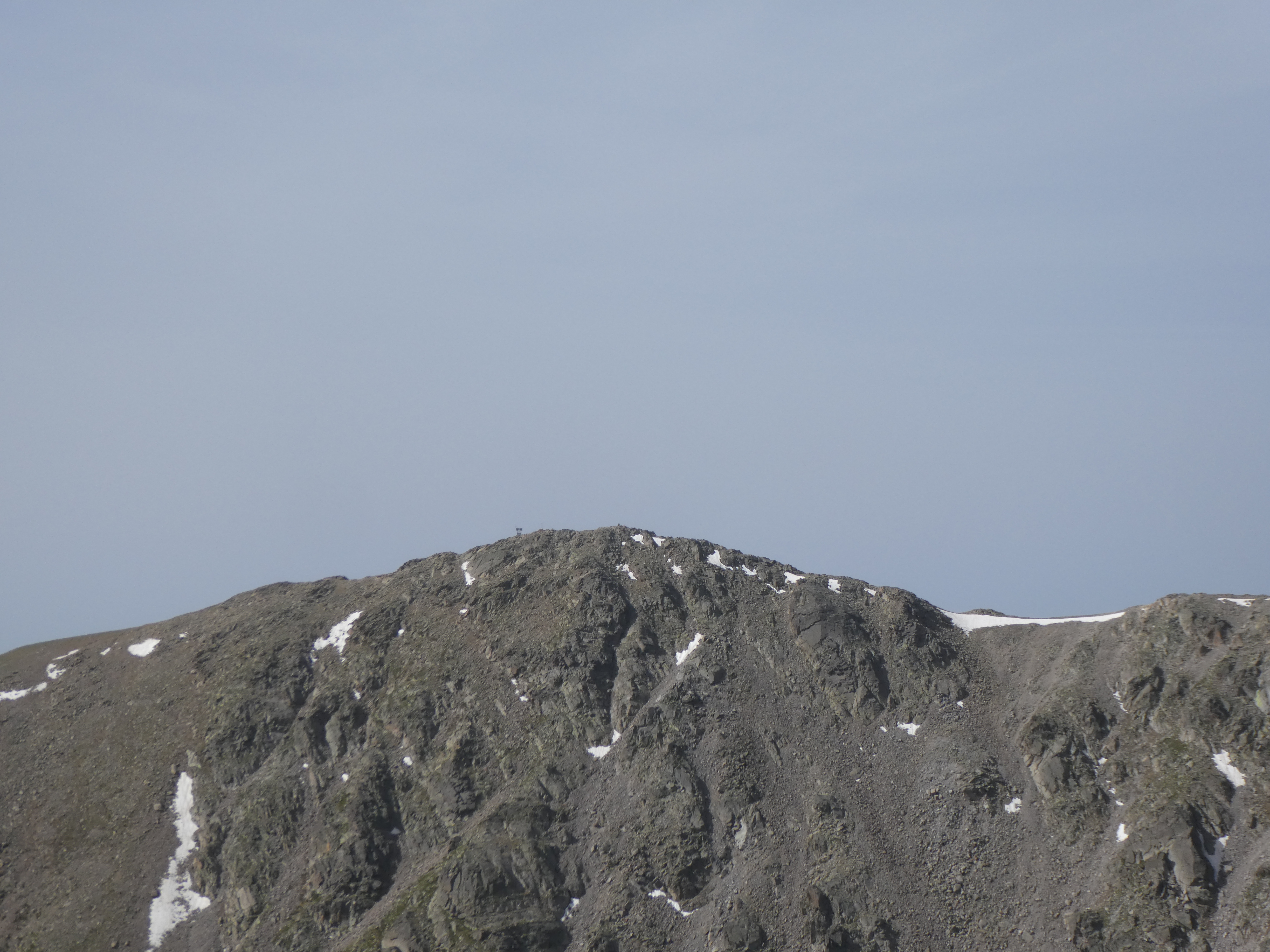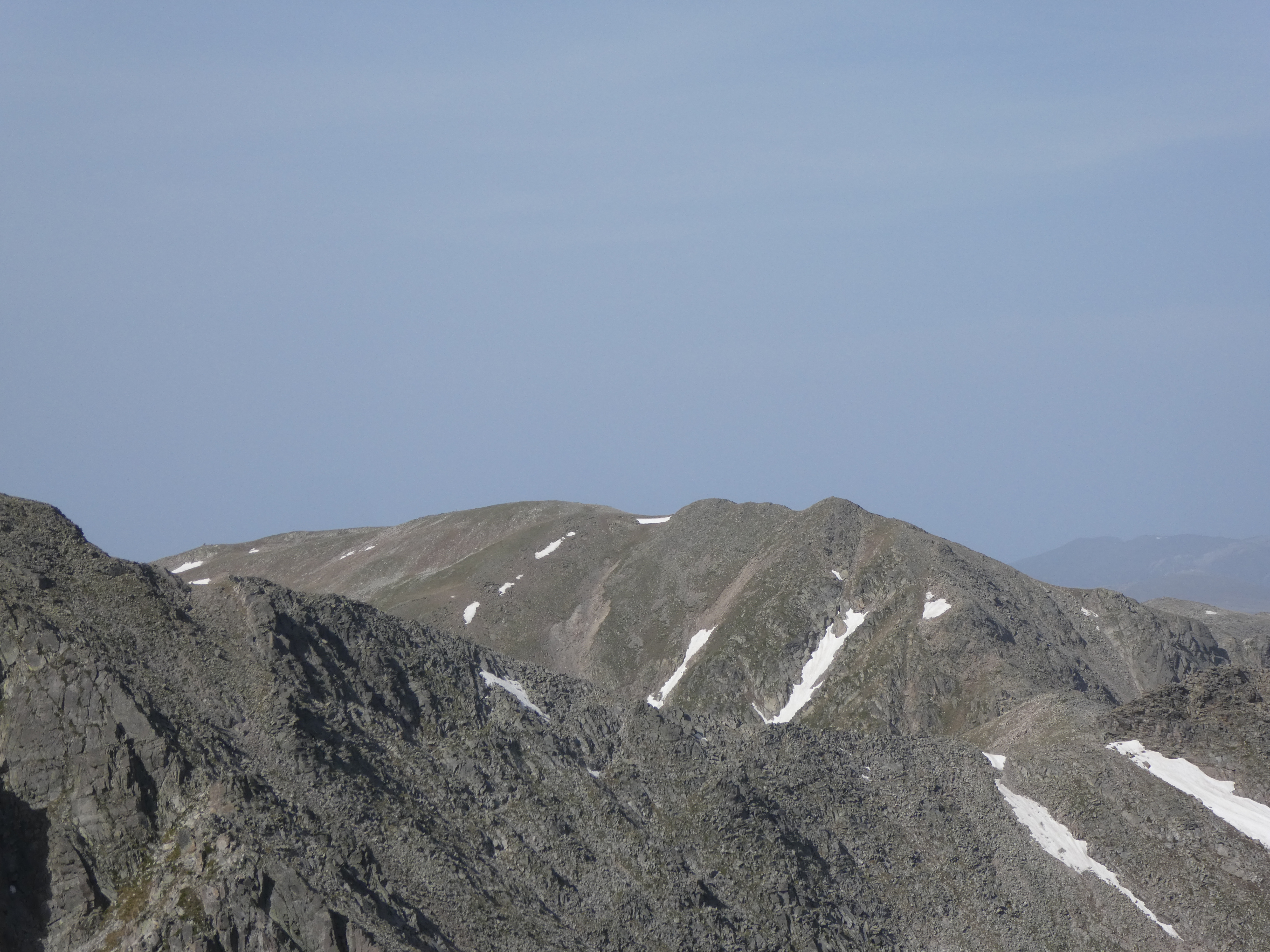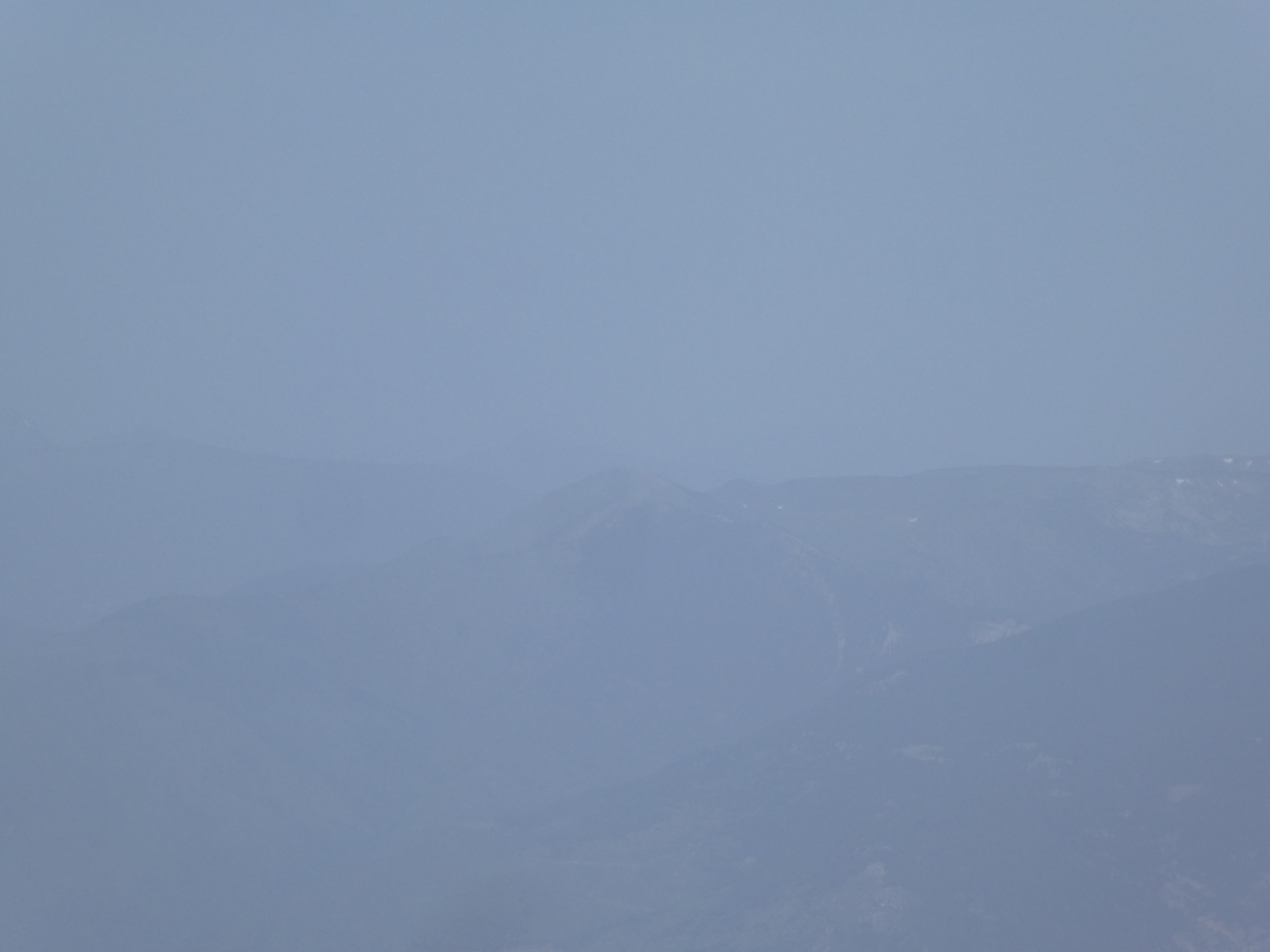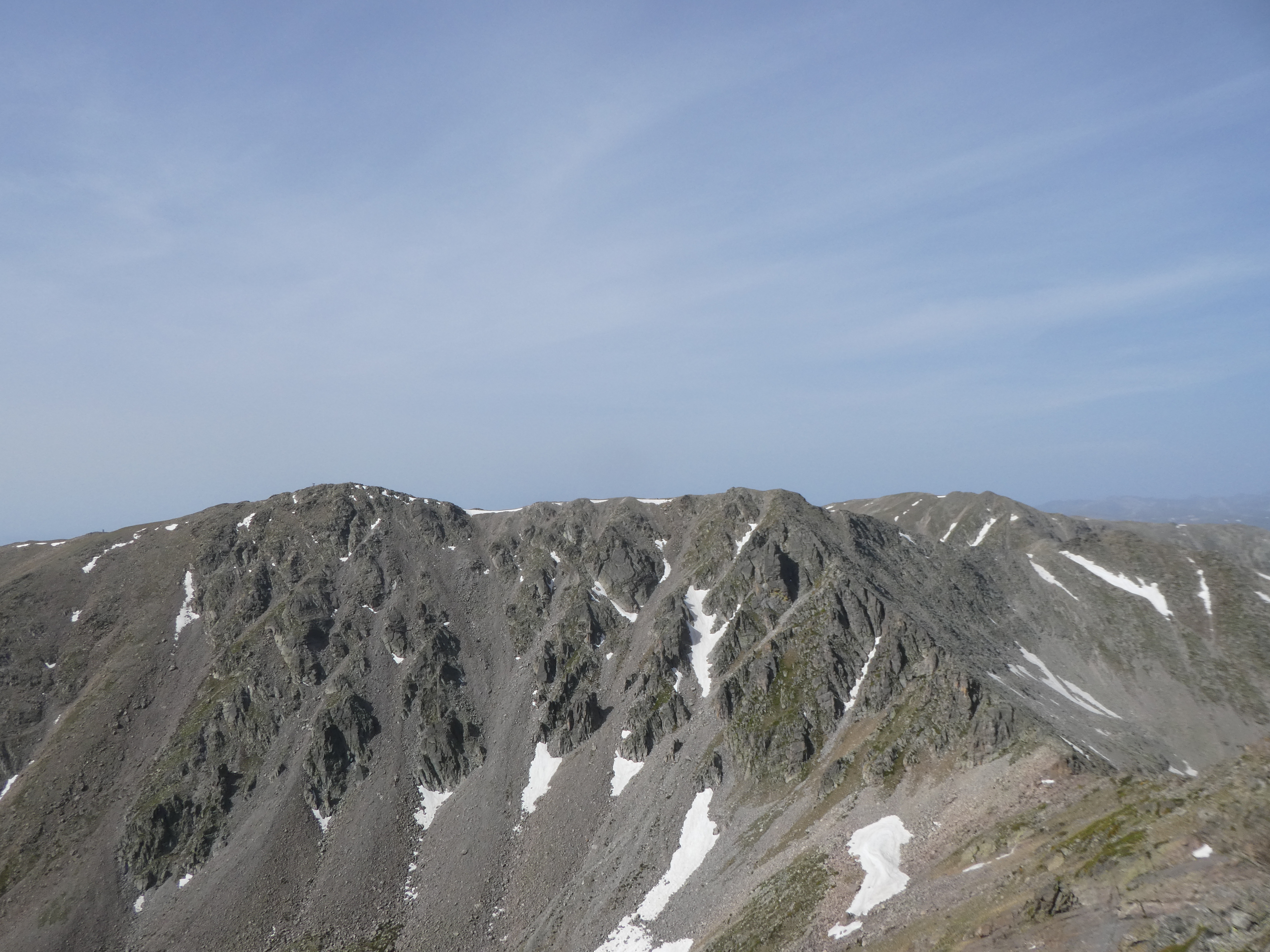 Arrivée au sommet du Puig del Roc Negre (2714 m) : beau panorama malgré la présence de sable dans l'atmosphère sur les sommets du Vallespir, du Ripollès, du massif du Canigou et du Conflent