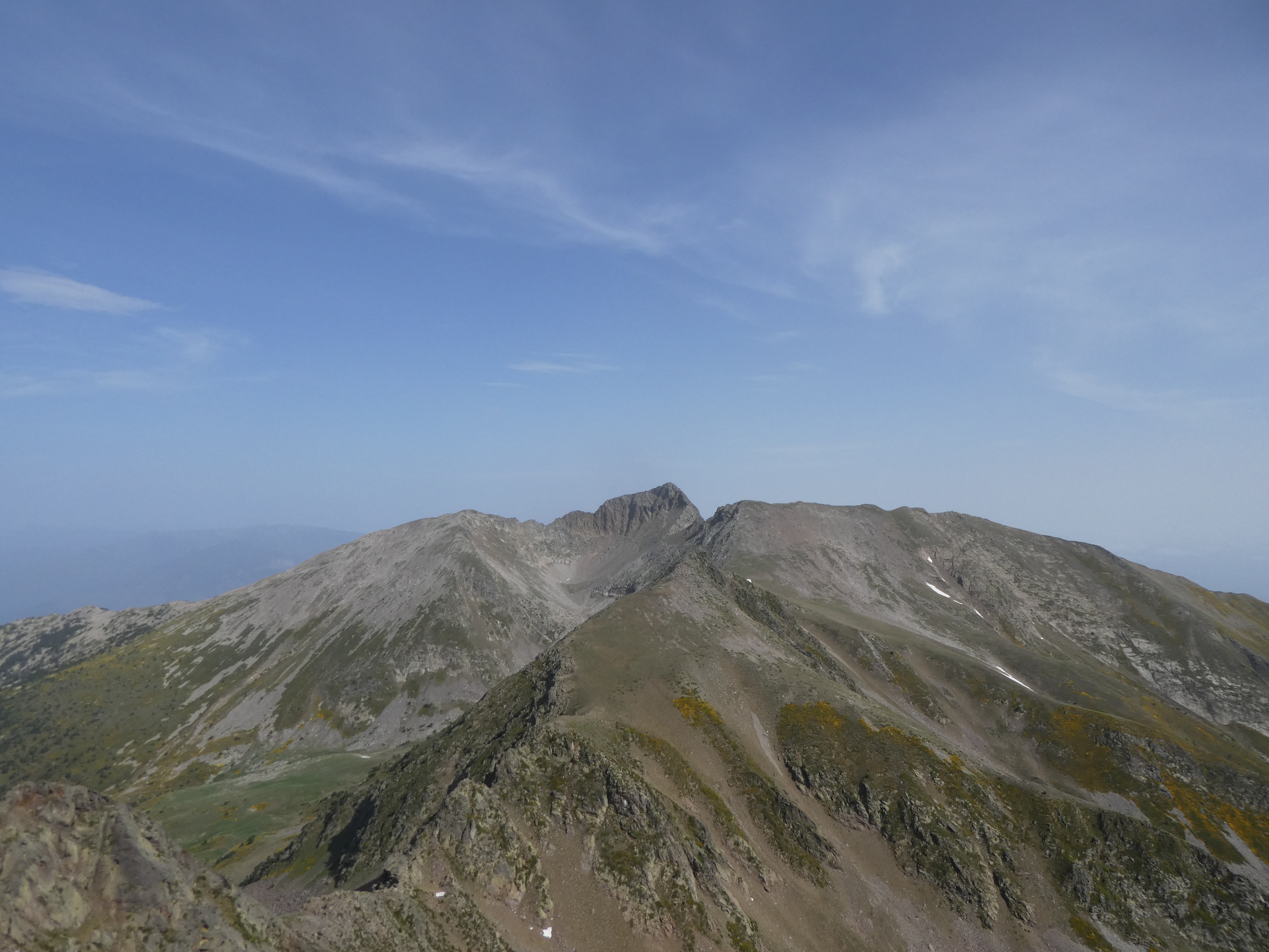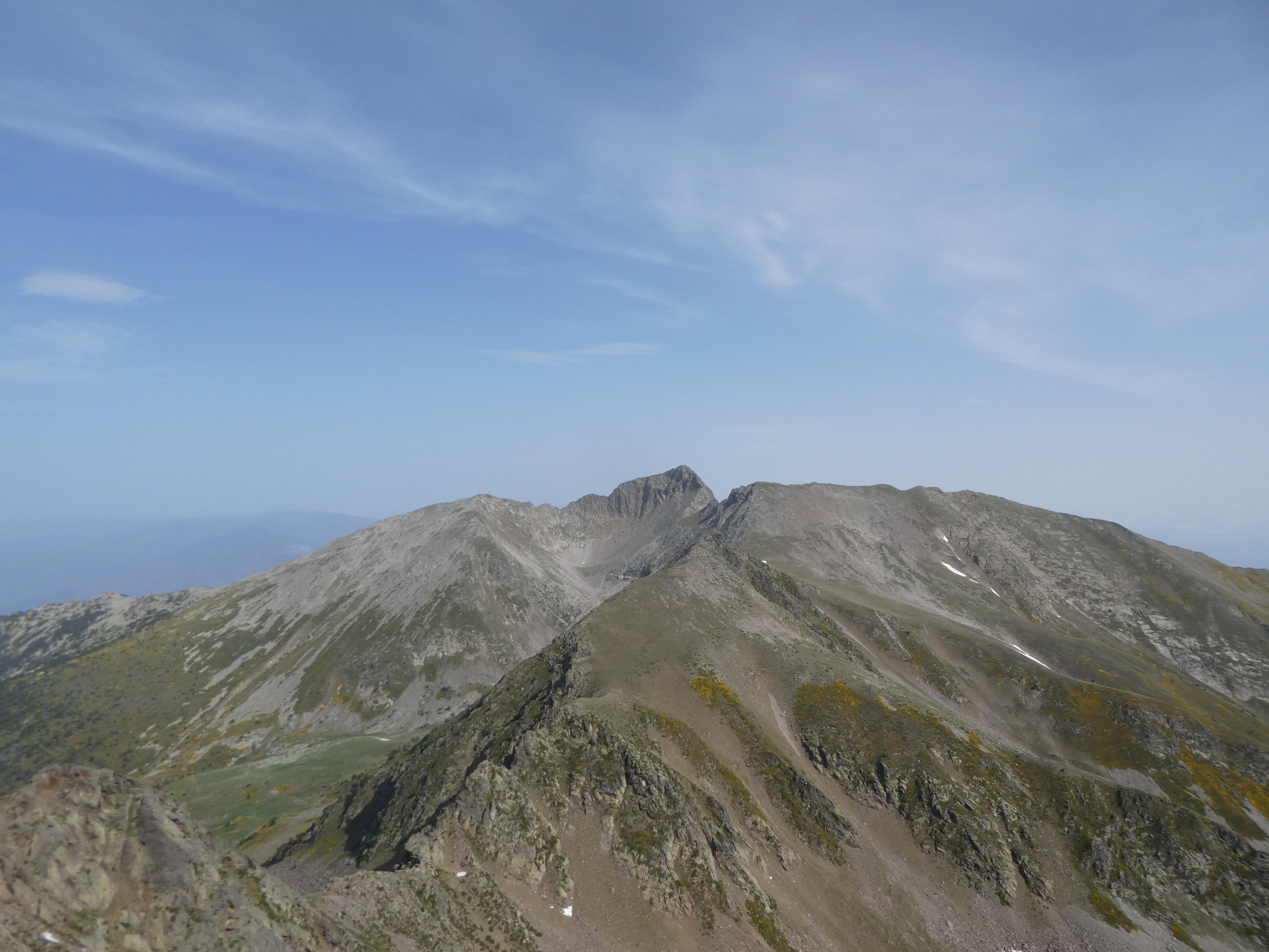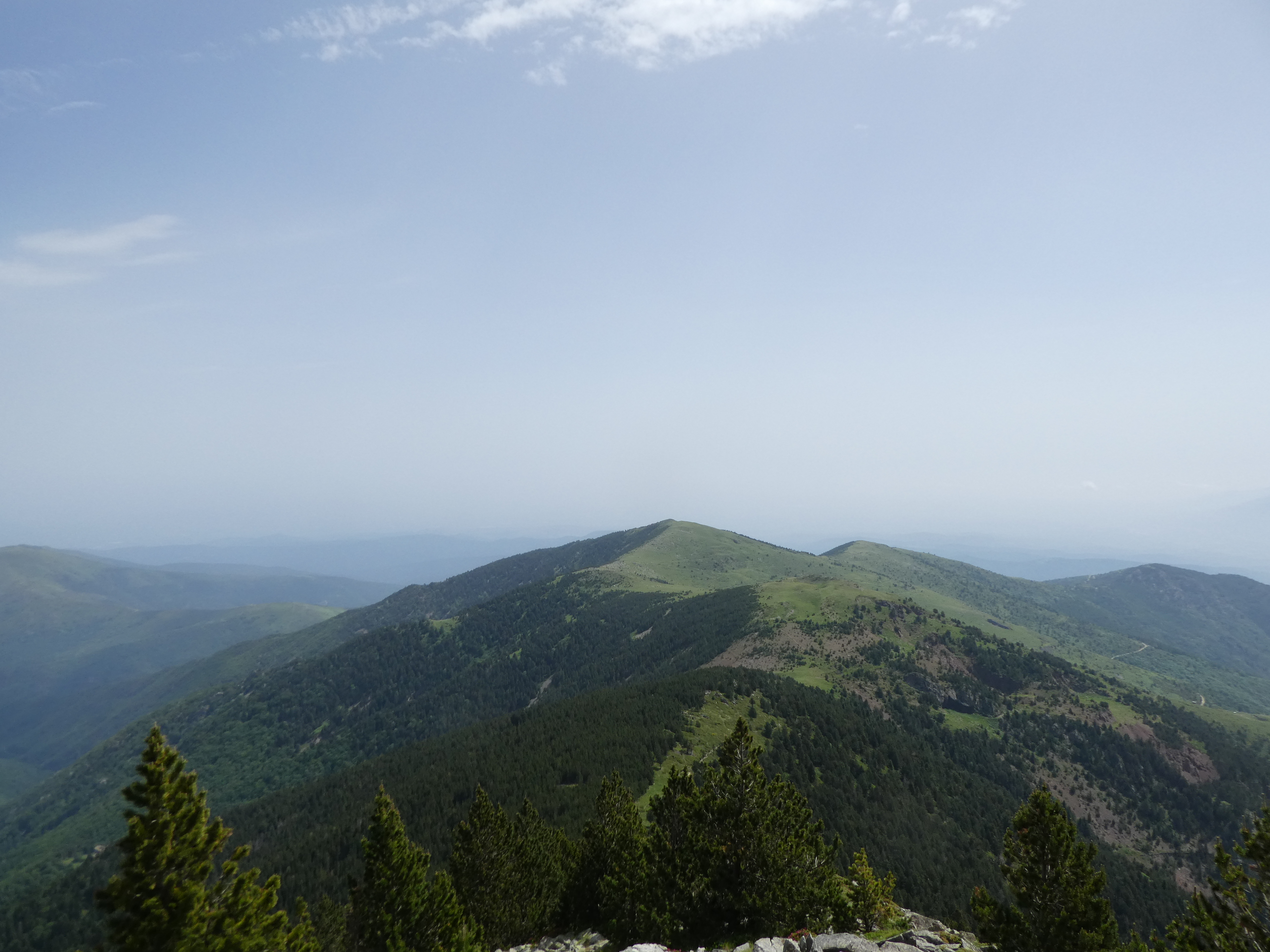 Arrivée au sommet du Pic Gallinàs (2461 m) : panorama semblable à celui du Cincreus avec vue plus étendue sur les sommets du Ripollès et du massif du Canigou