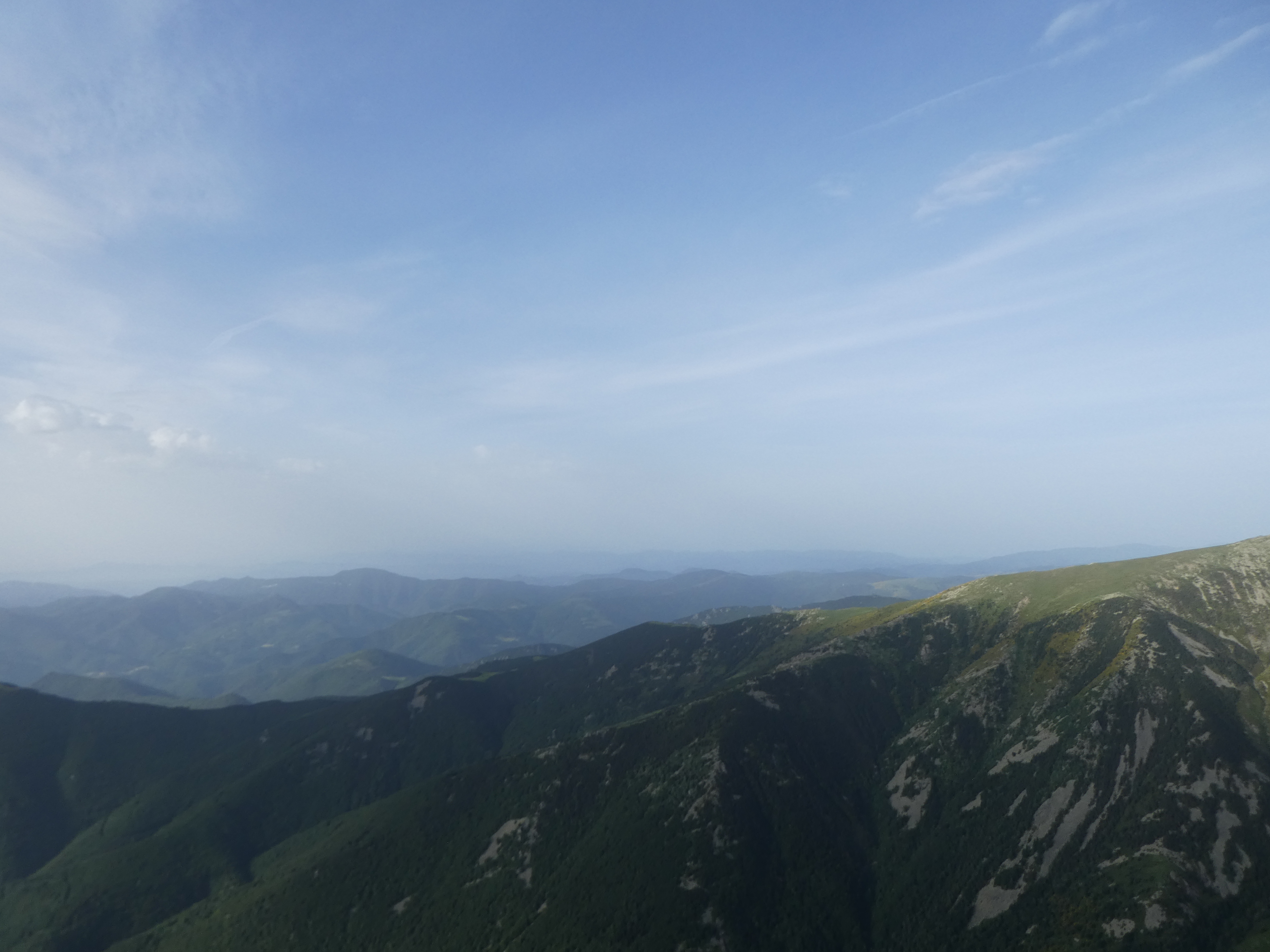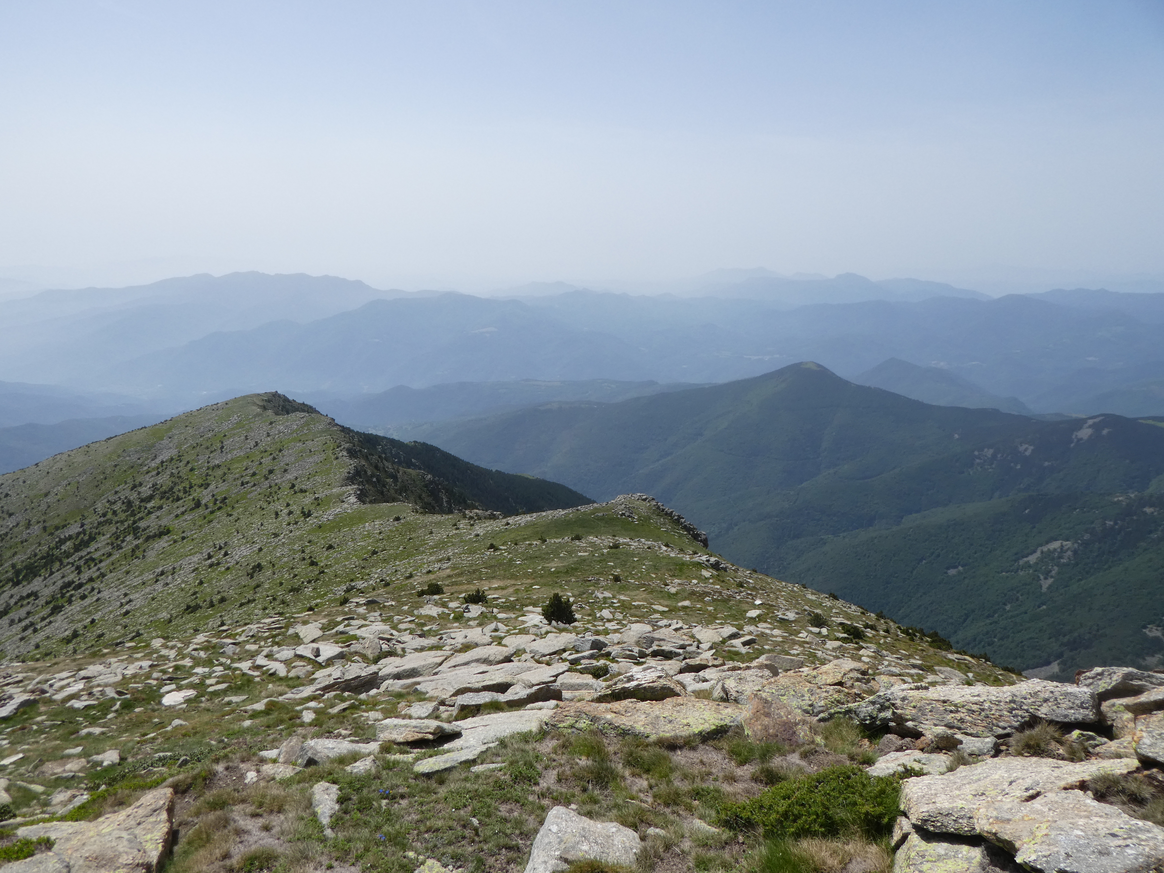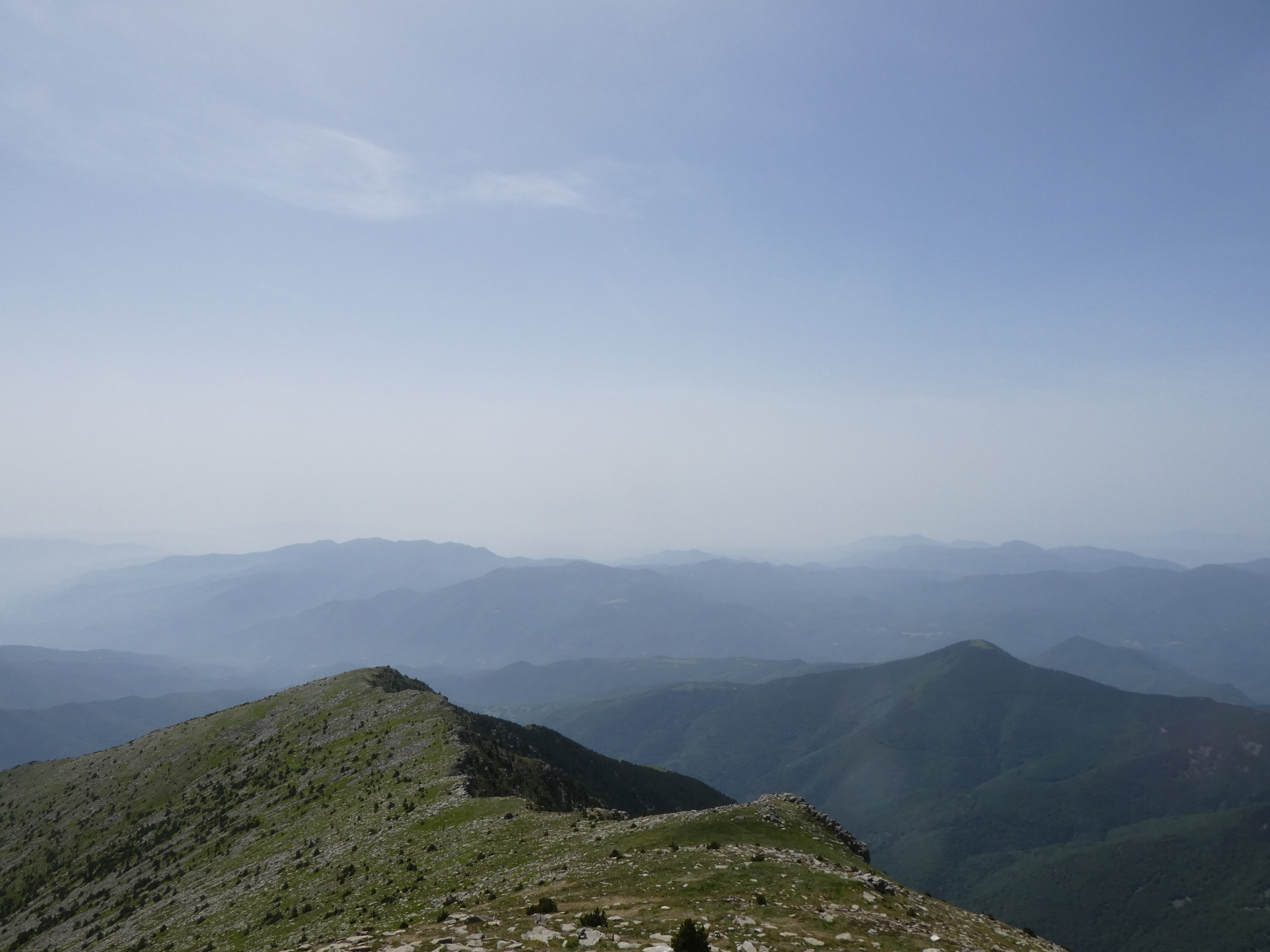 Arrivée au sommet du Pic Gallinàs (2461 m) : panorama semblable à celui du Cincreus avec vue plus étendue sur les sommets du Ripollès et du massif du Canigou