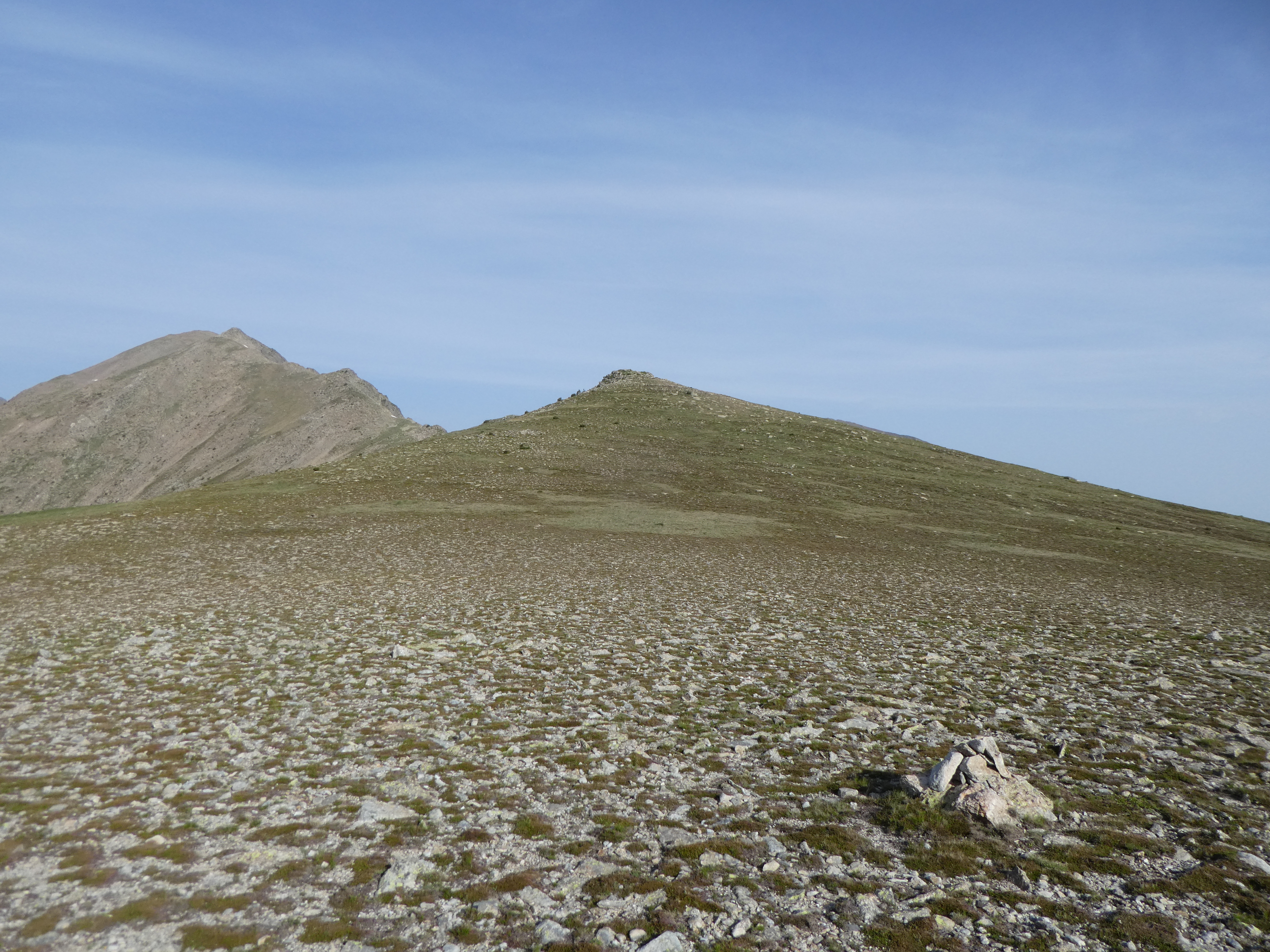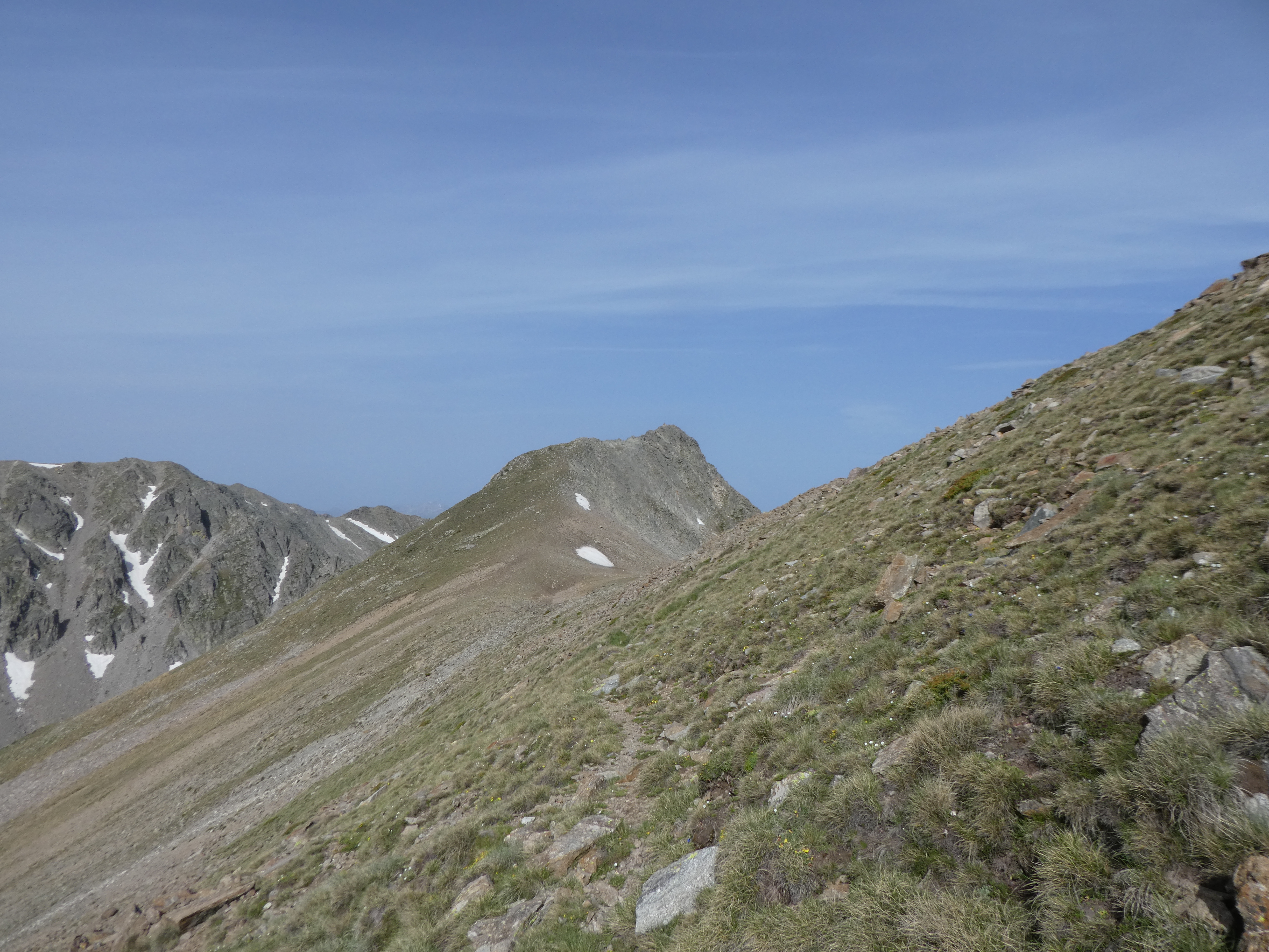 Coll de la Serra del Roc Negre (2596 m) : continuer à suivre le chemin de crête partant tout droit direction Puig del Roc Negre