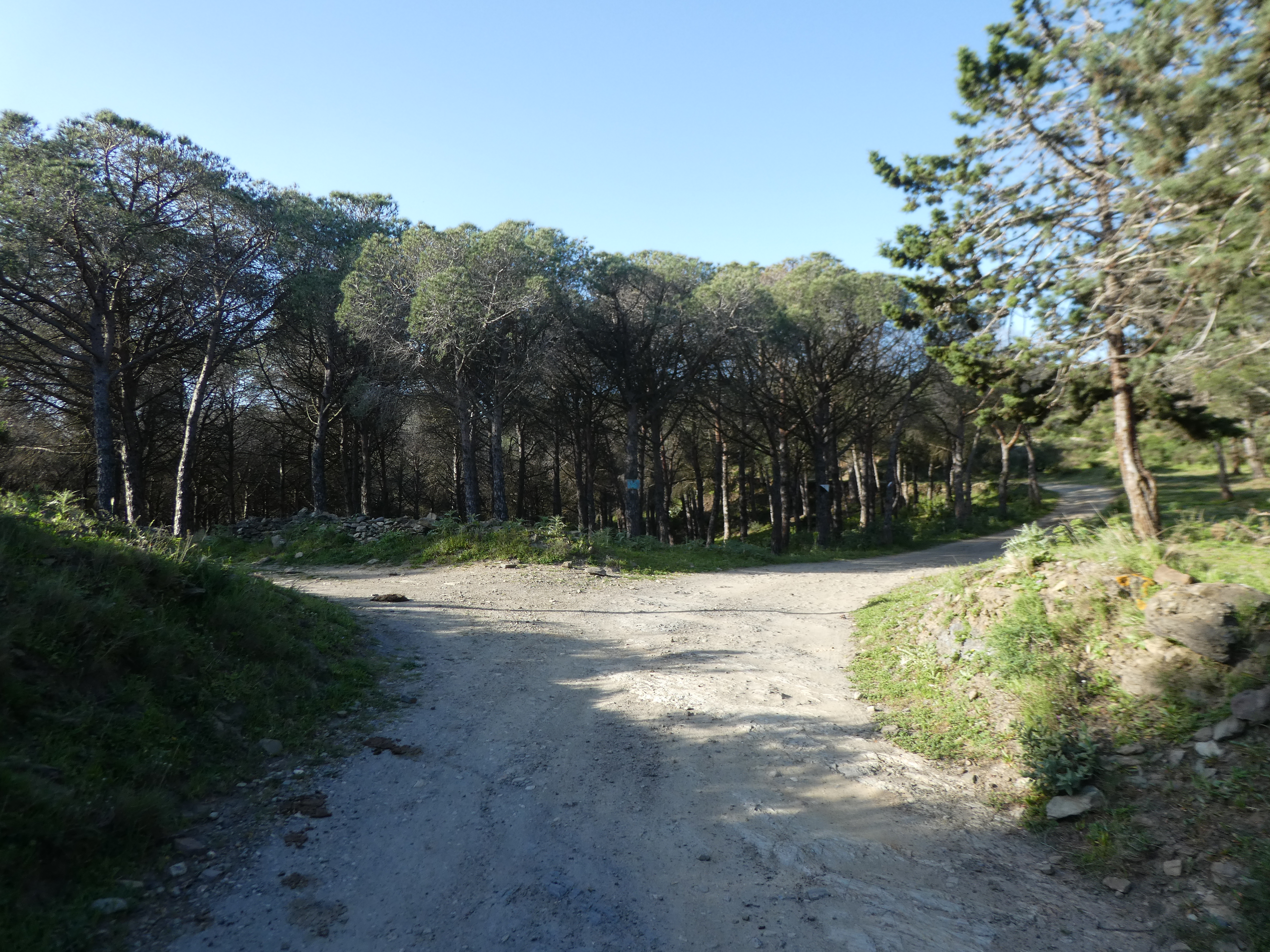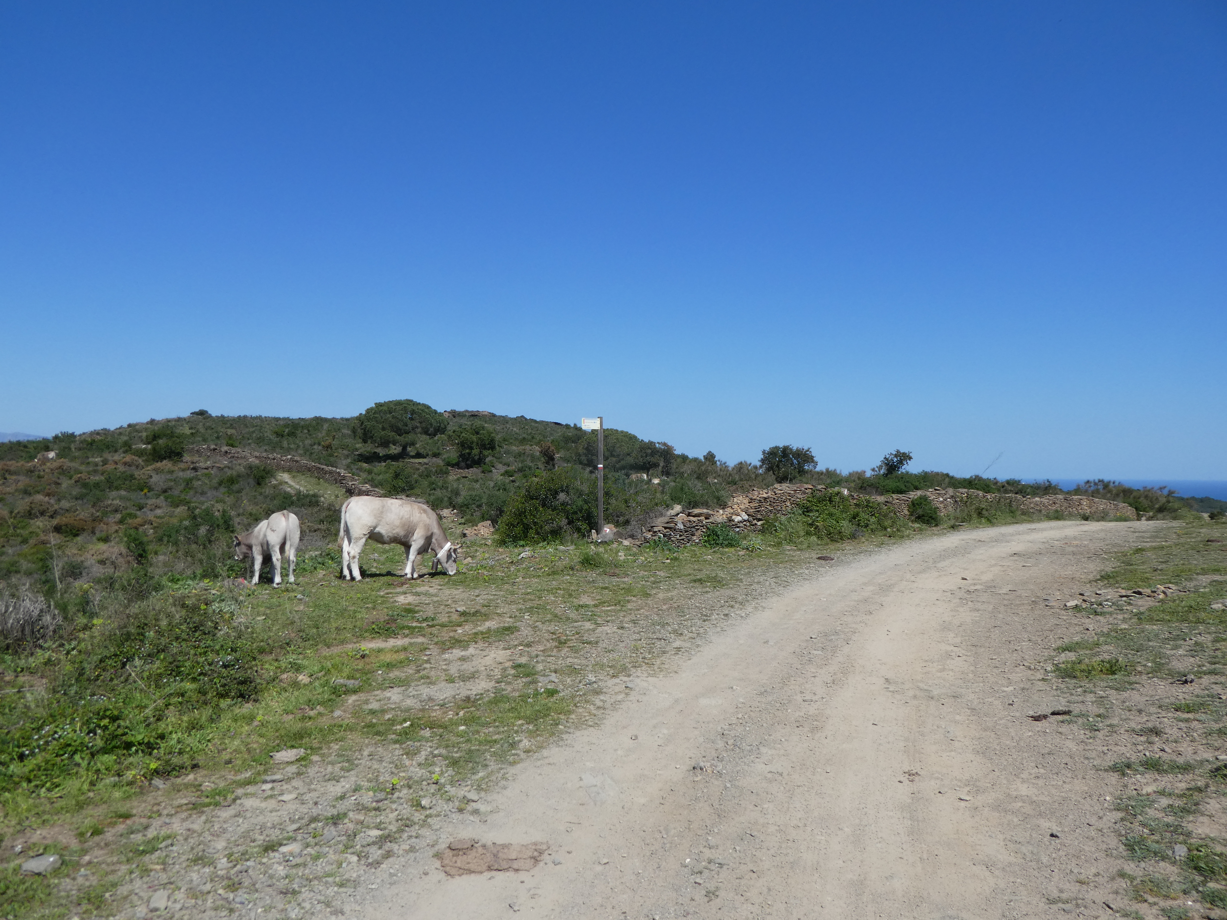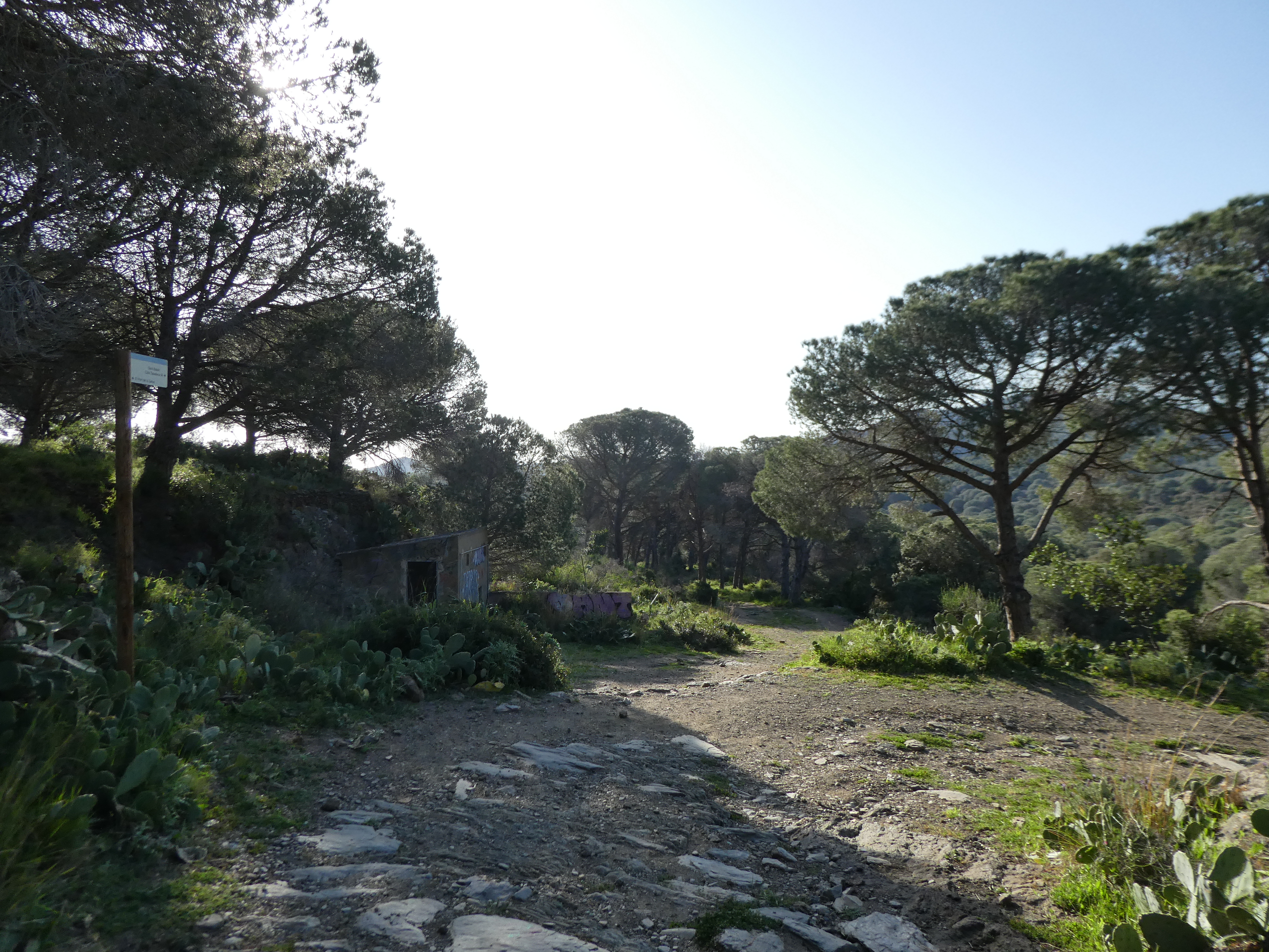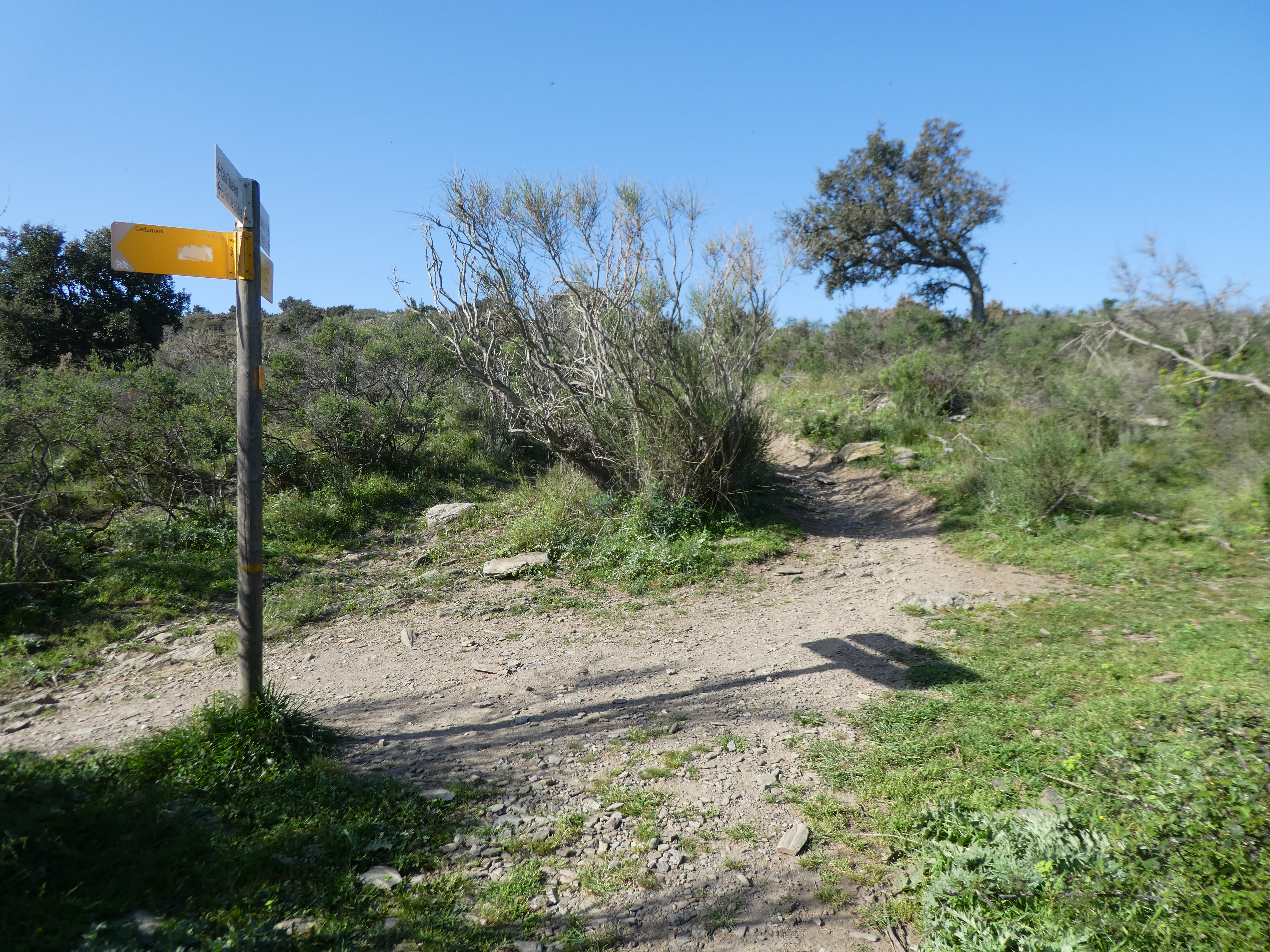 A ce croisement marqué par la présence d'un panneau directionnel (150 mètres après le précédent), suivre le GR11 partant tout droit direction Cadaqués (per Sant Baldiri), balisé en rouge et blanc, et en jaune