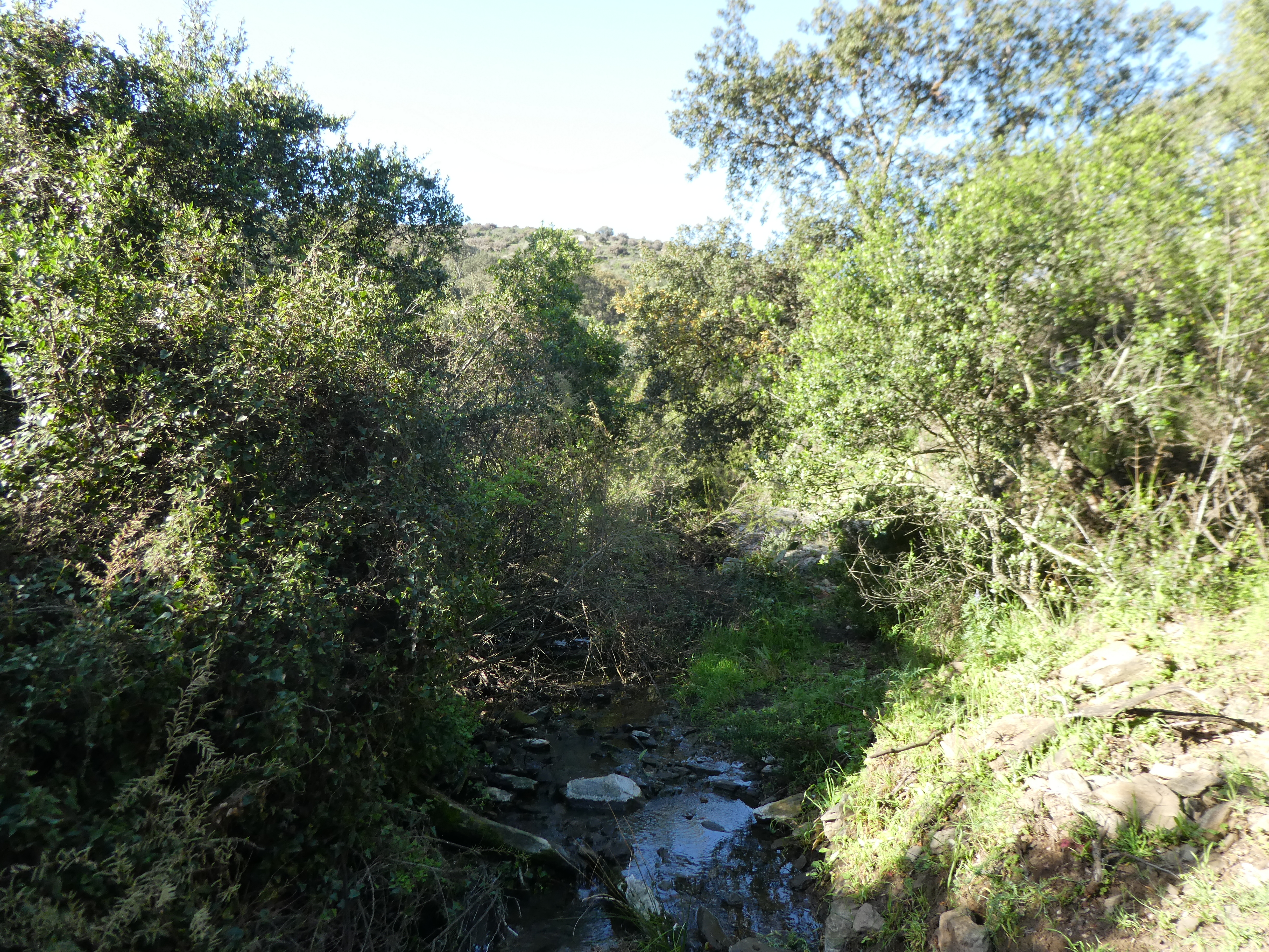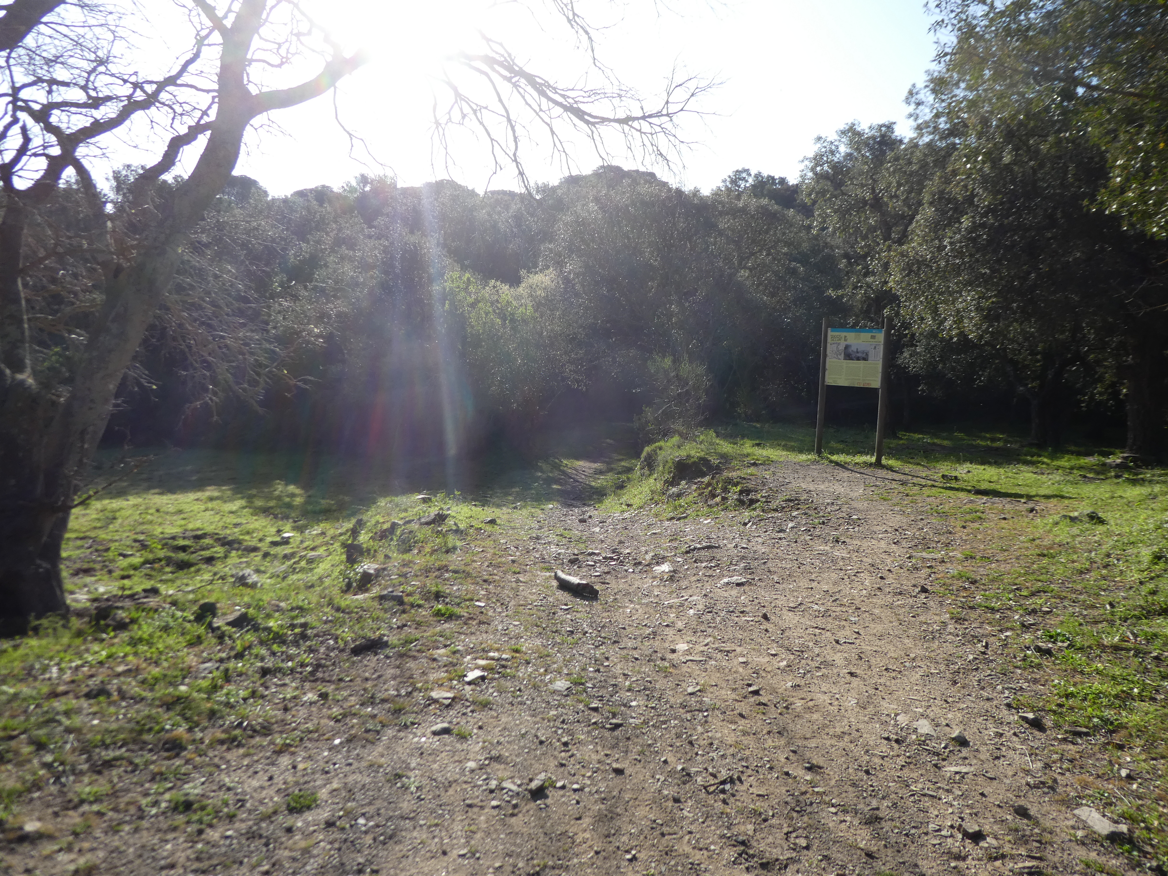 Mas Vell (155 m) : suivre le chemin partant sur la droite direction Puig dels Bufadors, balisé sporadiquement en jaune dorénavant (direction non mentionnée sur le panneau directionnel)