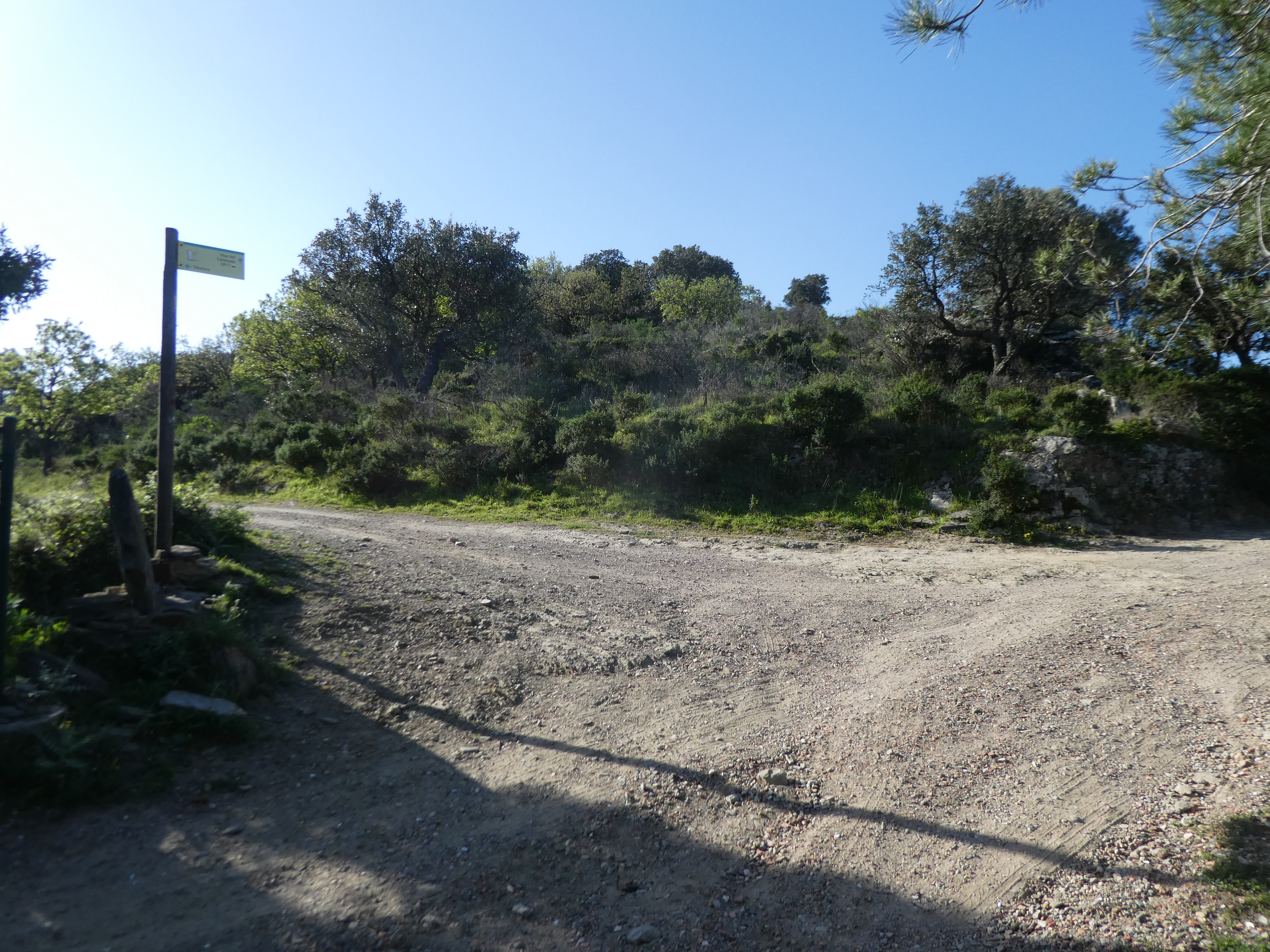 A ce croisement marqué par la présence d'un panneau directionnel (1300 mètres après le précédent), suivre le GR11 partant sur la droite direction Cadaqués (per Sant Baldiri), balisé en rouge et blanc, et en jaune