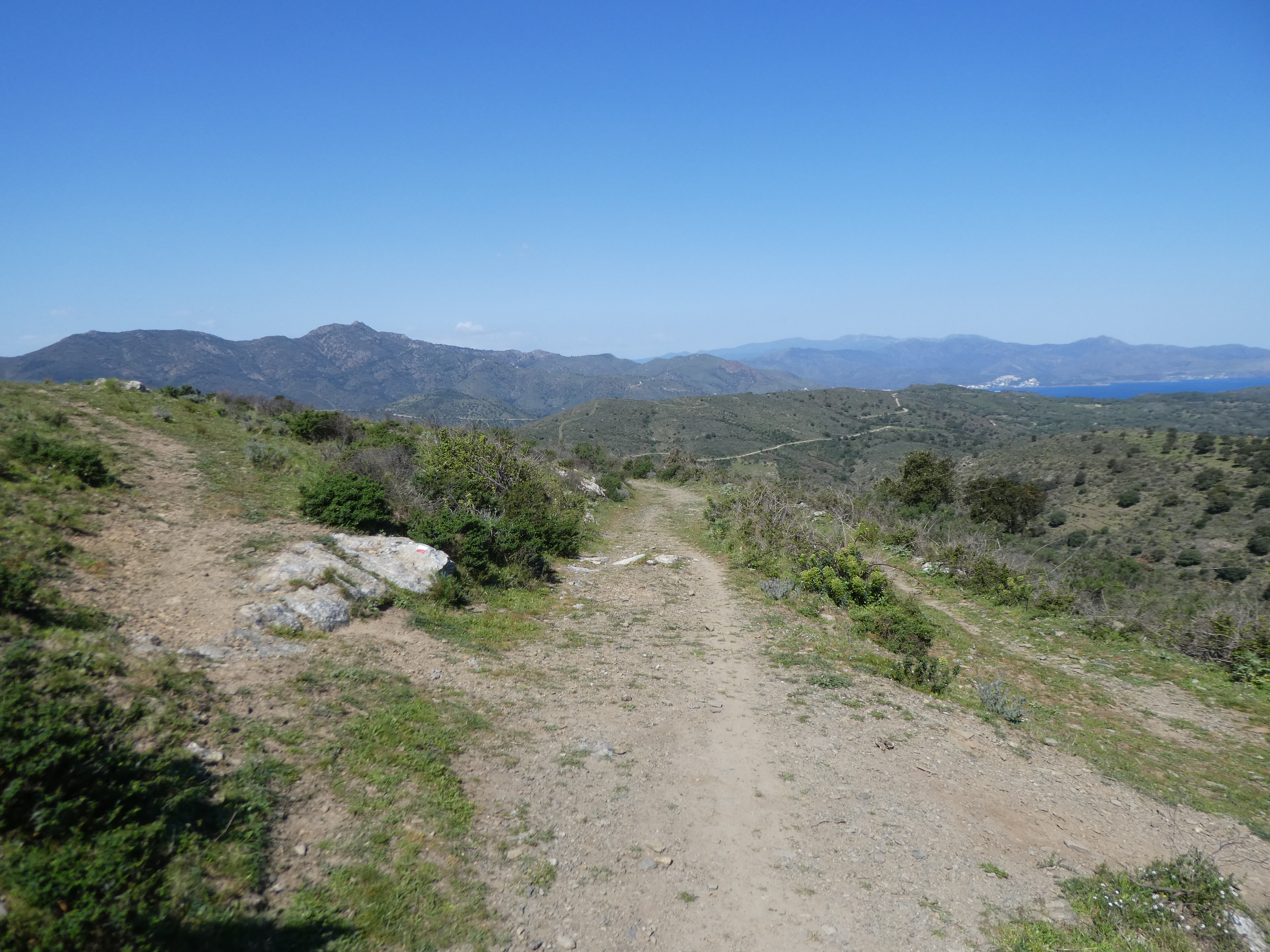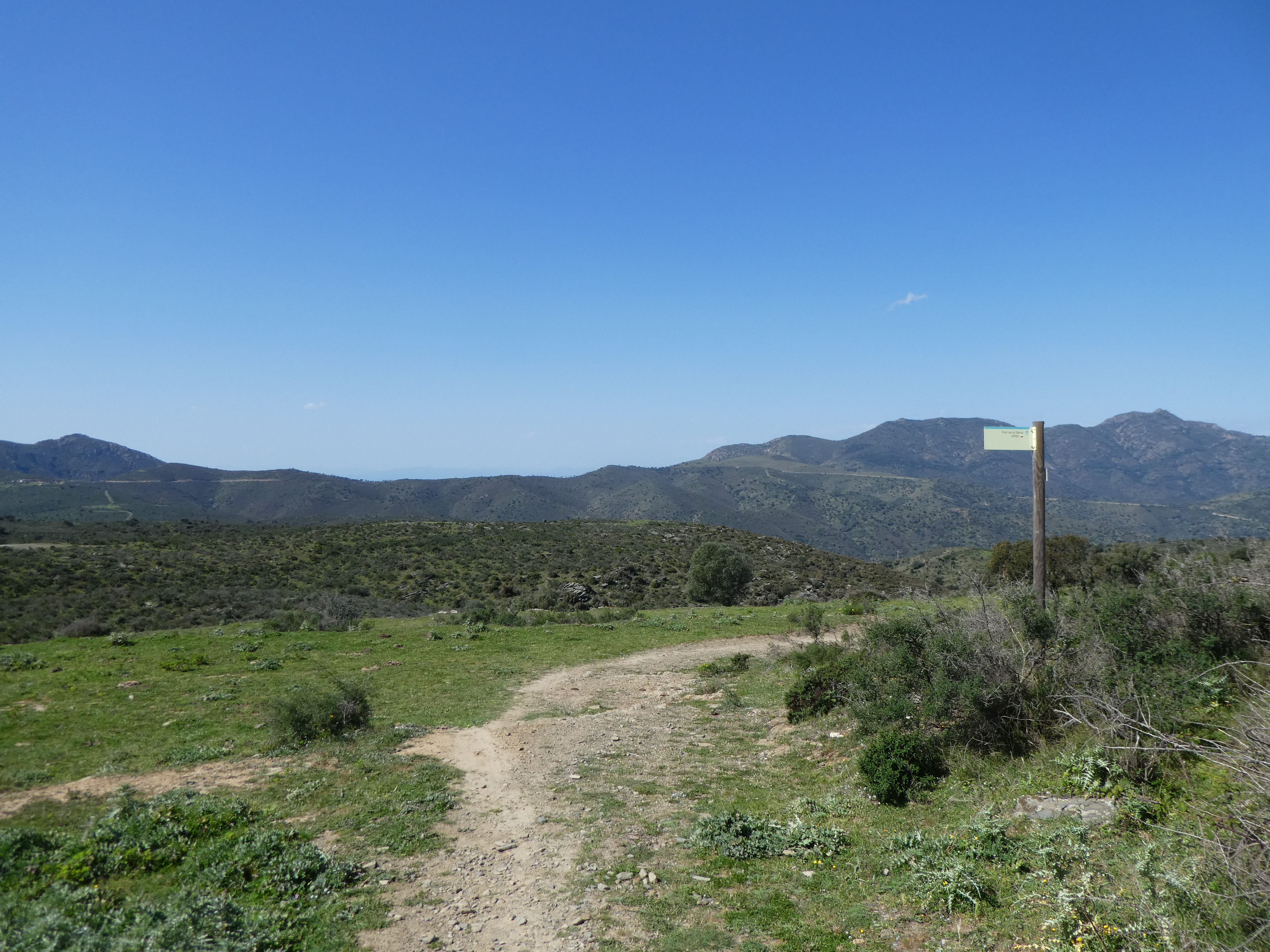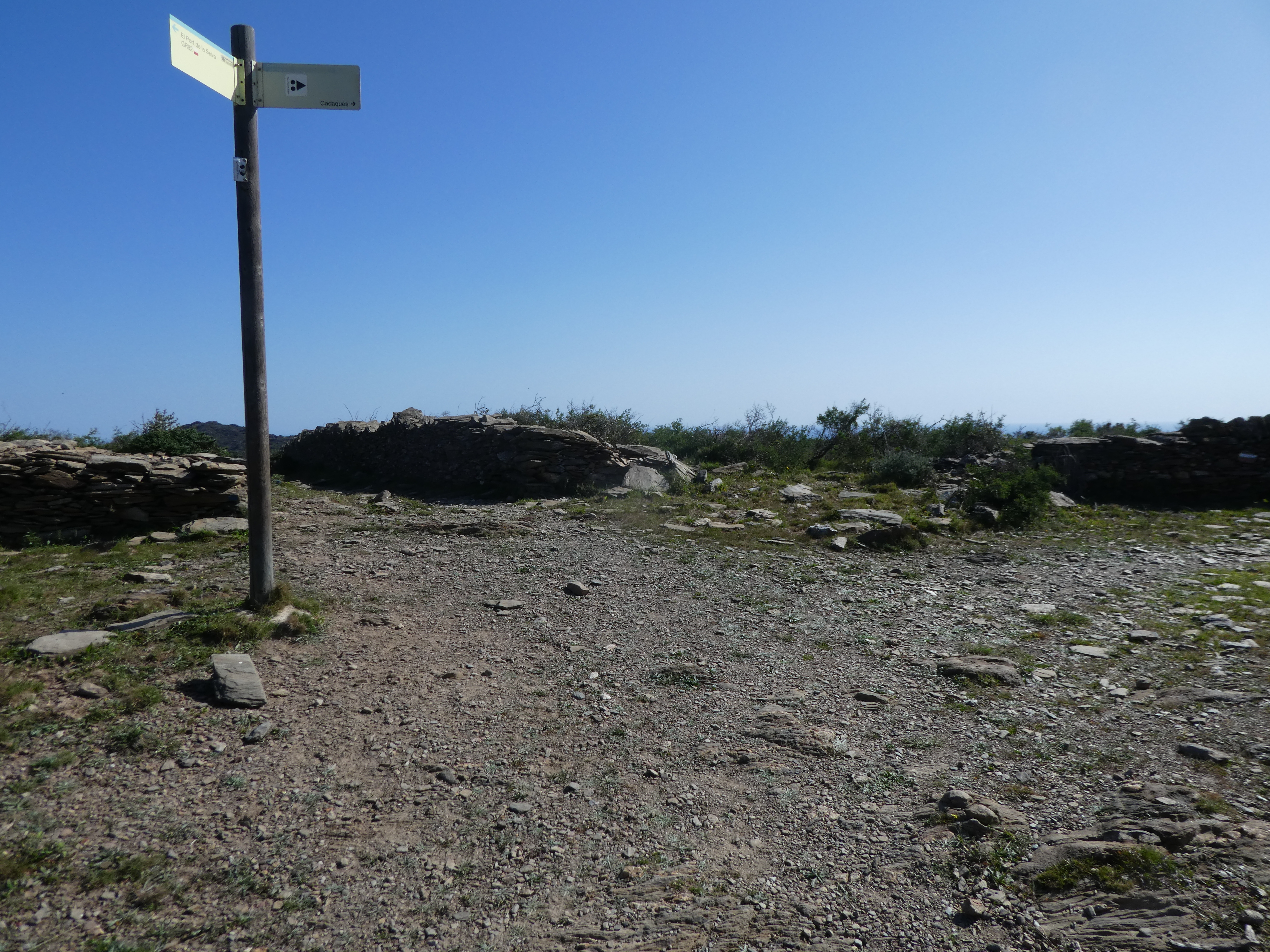 A cette intersection marquée par la présence d'un panneau directionnel (950 mètres après le lieu-dit "la Degollada"), suivre le GR11 partant tout droit direction Cadaqués (per Sant Baldiri), balisé en rouge et blanc, et en jaune