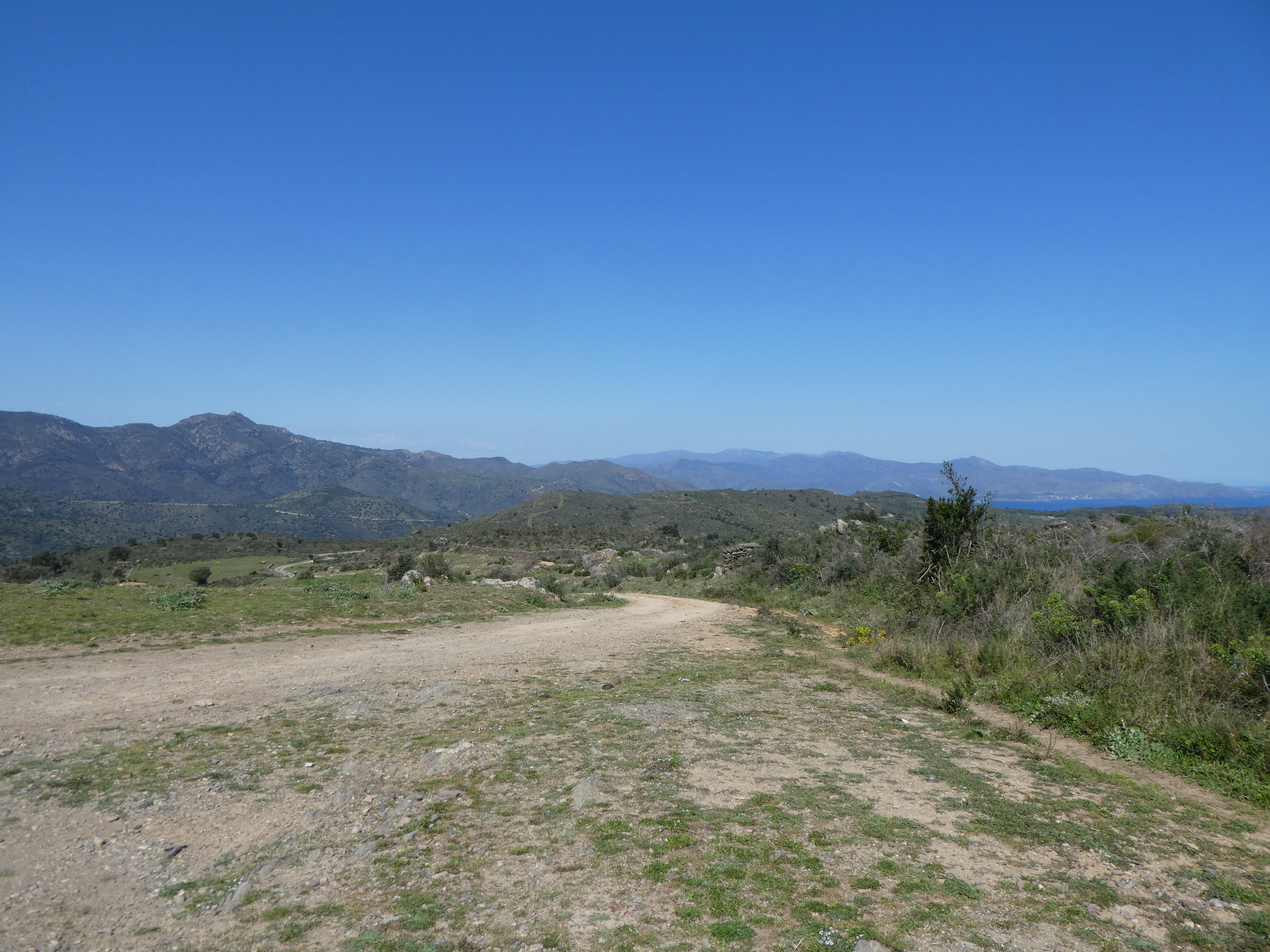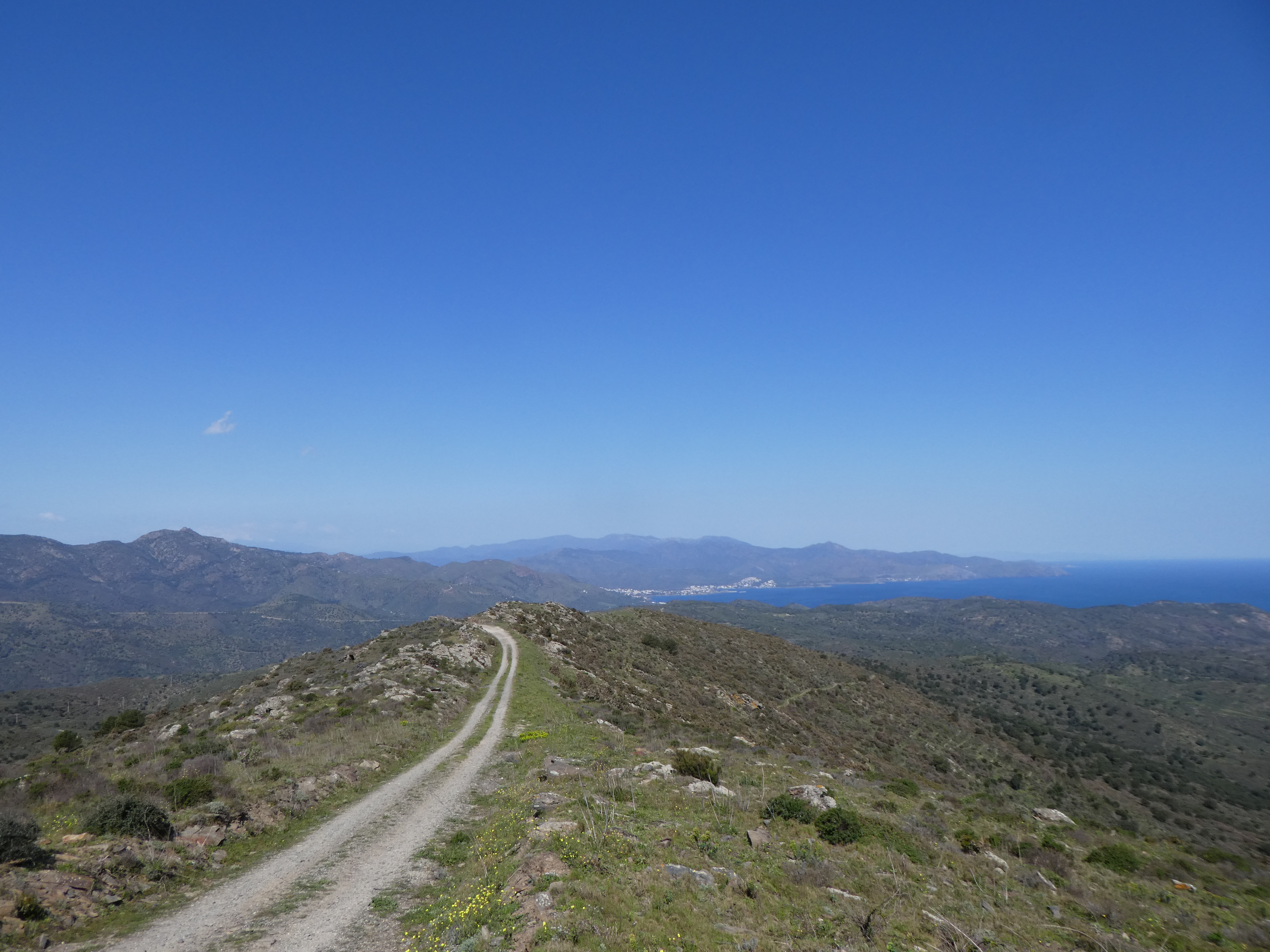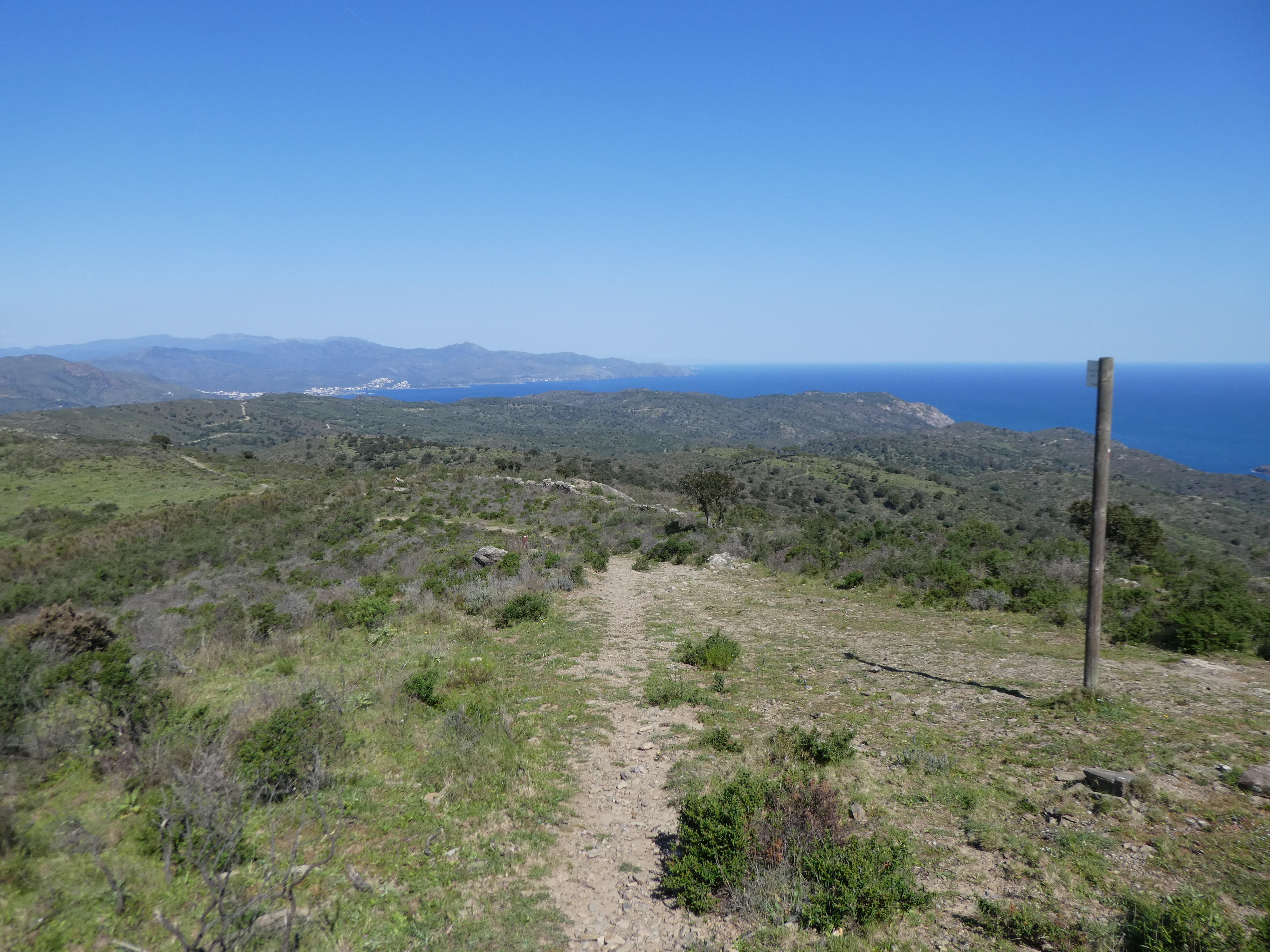 A cette intersection marquée par la présence d'un panneau directionnel (950 mètres après le lieu-dit "la Degollada"), suivre le GR11 partant tout droit direction Cadaqués (per Sant Baldiri), balisé en rouge et blanc, et en jaune