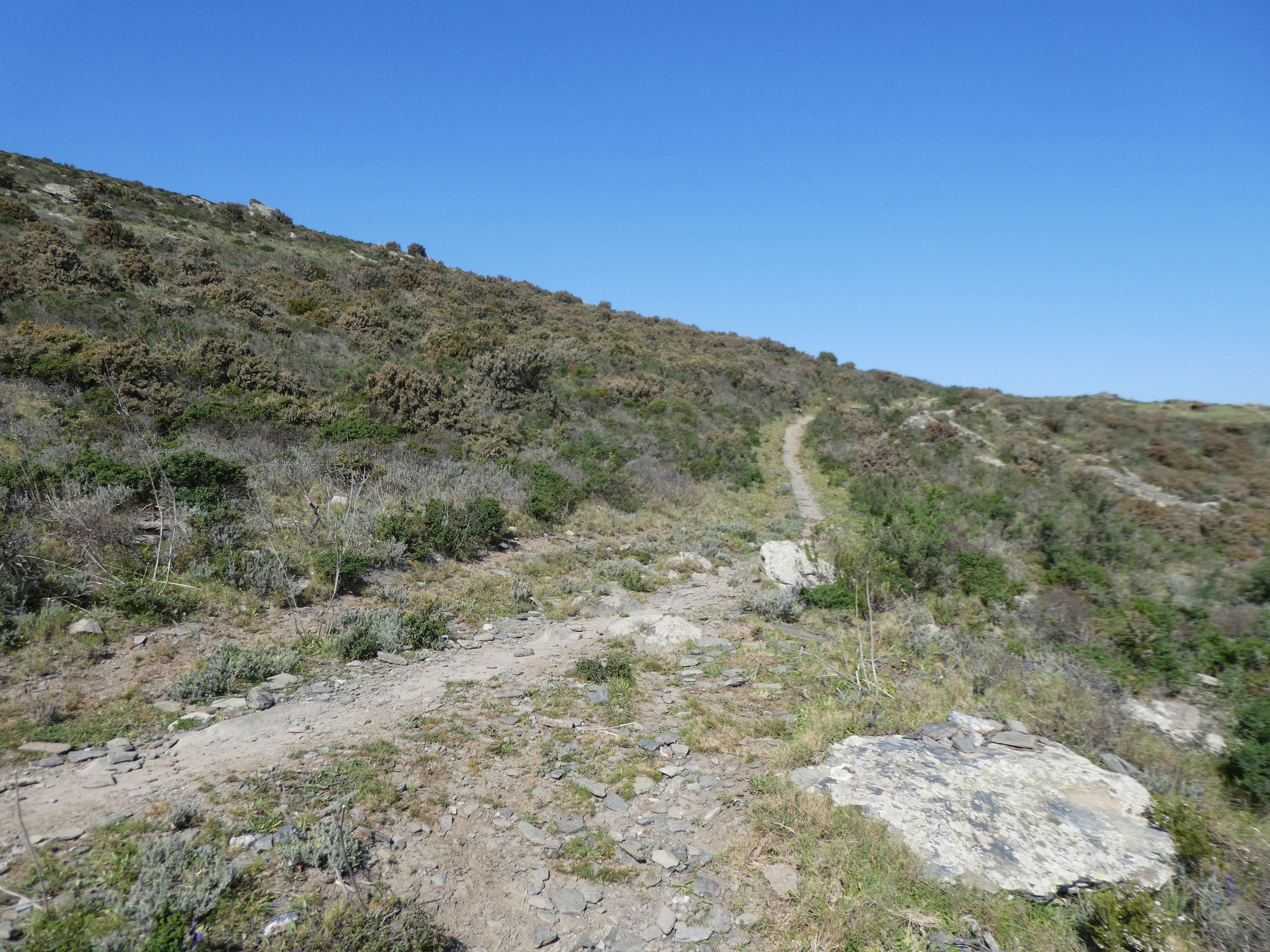 La Degollada (35 m) : suivre le GR11 montant de biais sur la droite direction Cadaqués, balisé en rouge et blanc, et en jaune